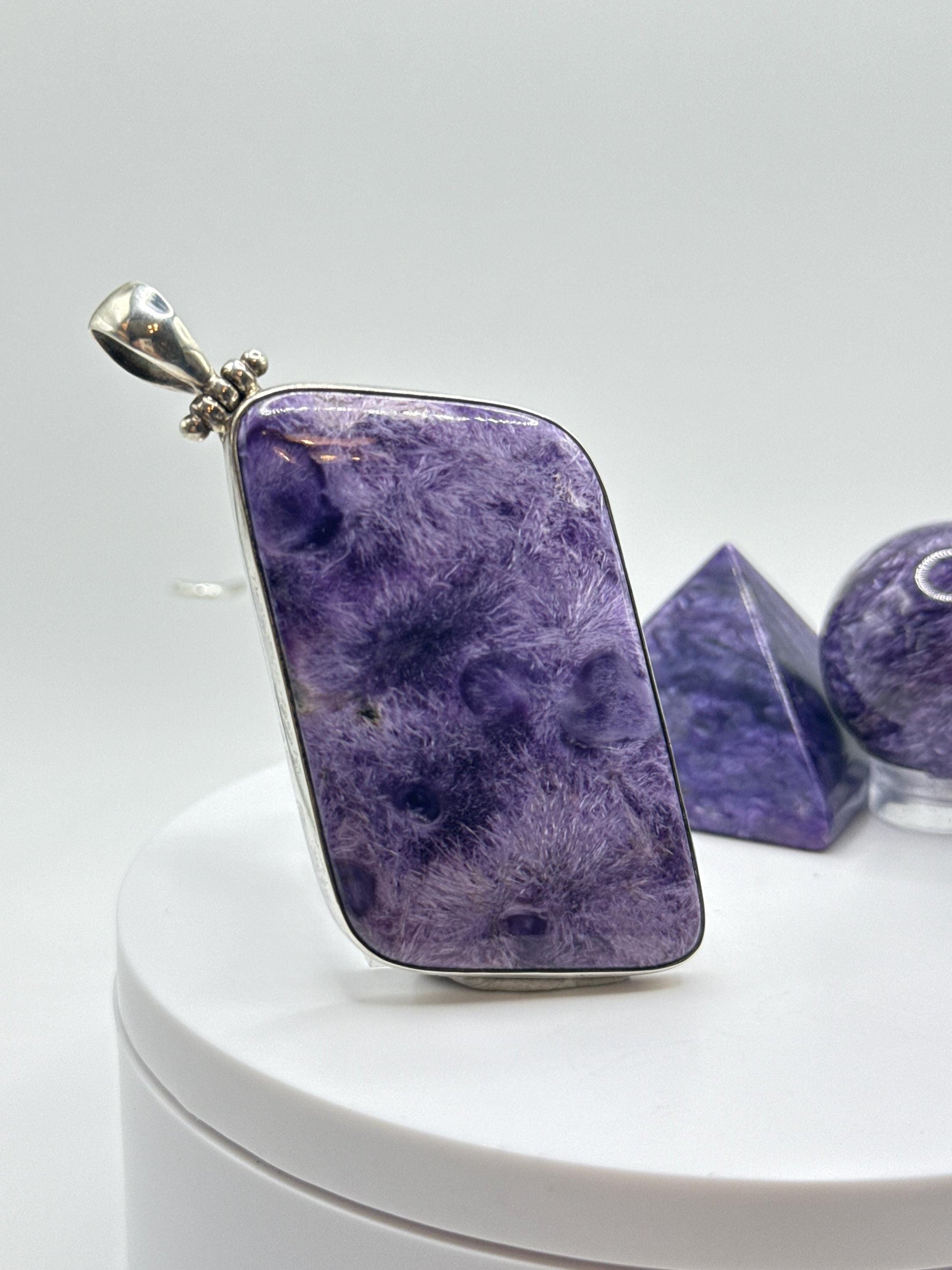 This sleek pendant showcases a polished Charoite gemstone in a contemporary elongated shape, set in a simple sterling silver frame with a clean, minimalist bail. The Charoite displays its signature swirling lavender and deep violet patterns, accented by a silky, fibrous texture that catches the light beautifully. Mined exclusively in Siberia, Charoite is known for its transformative and protective properties, making this pendant both a stunning accessory and a meaningful piece for lovers of rare, powerful gemstones.