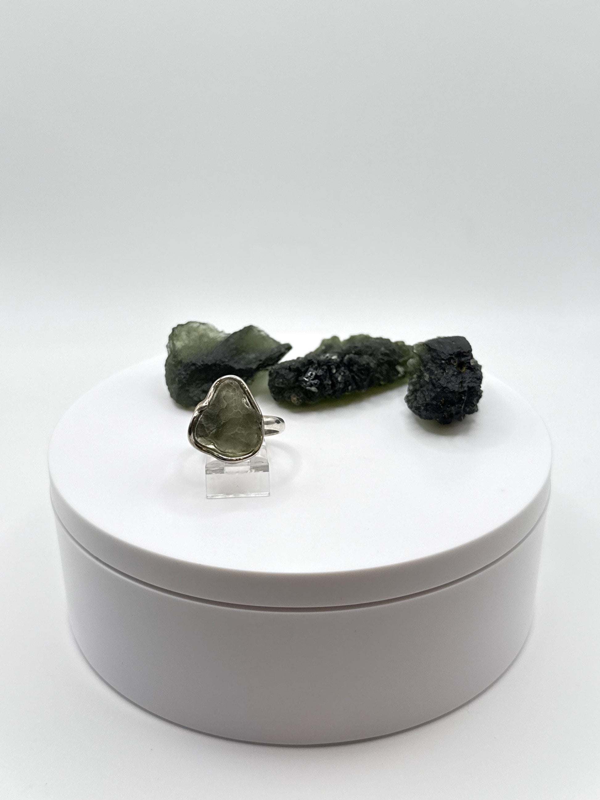 This stunning ring features a natural, uncut Moldavite, set in a graceful sterling silver frame that follows the stone's unique shape. Known as a rare tektite born from a meteorite impact over 15 million years ago, Moldavite carries an otherworldly energy and a deep, forest-green hue that seems to hold the mysteries of the cosmos. Its raw texture and organic form make each piece truly one of a kind. A captivating choice for crystal lovers, spiritual seekers, or anyone drawn to rare and meaningful jewelry.