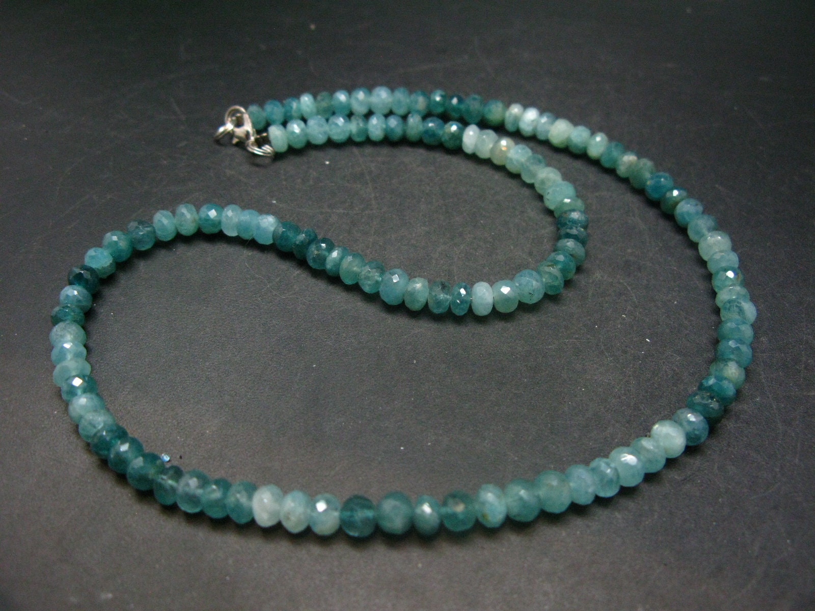 Description: A necklace made out of one of the rarest minerals in the world, a fine greenish blue Grandidierite necklace, it has 6mm rondelle facetted beads.