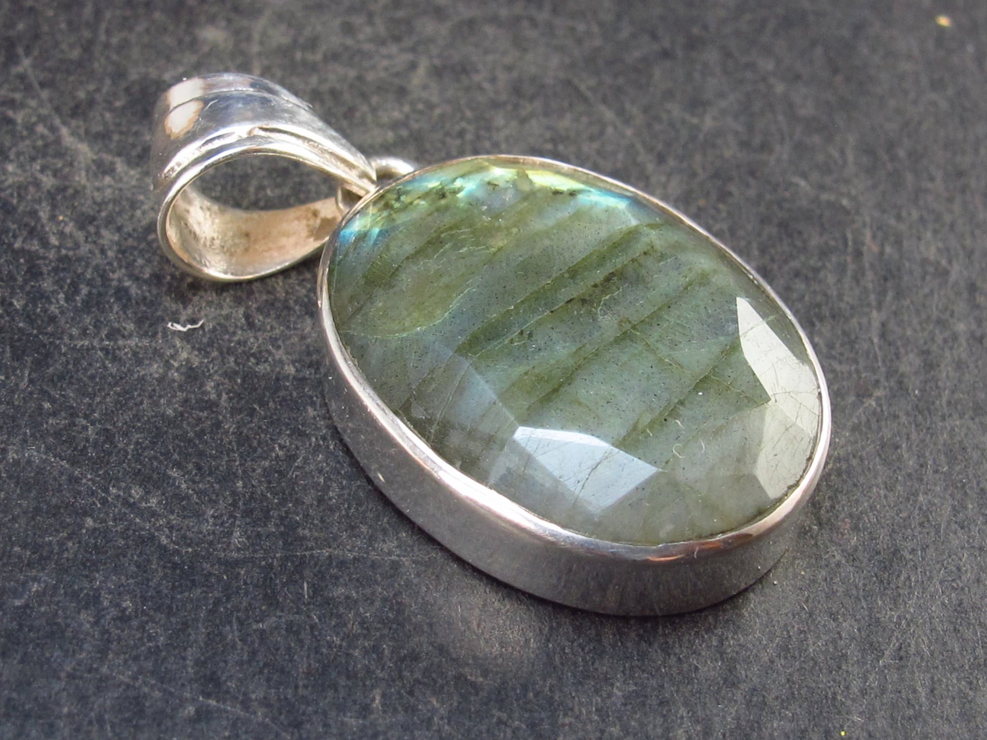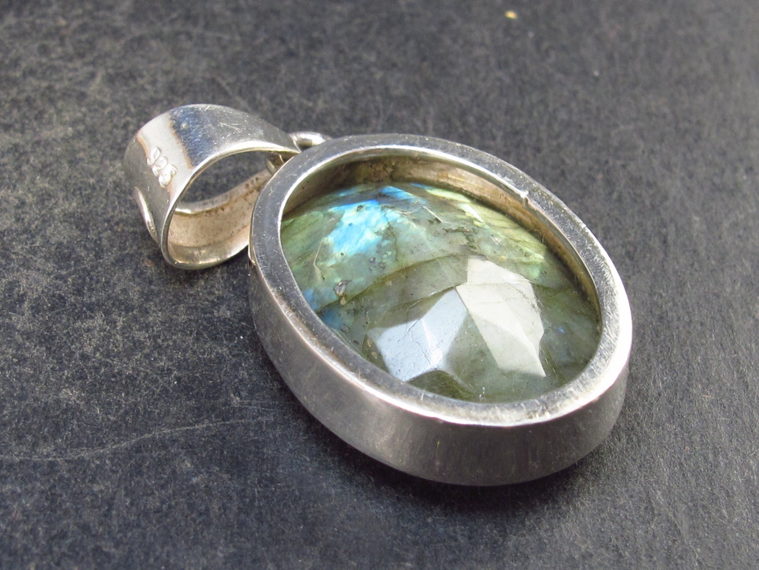 Oval shape faceted Labradorite pendant with a beautiful blue reflection from Madagascar with strong visual effect set in sterling silver 925. It is in great condition and has natural untreated color.