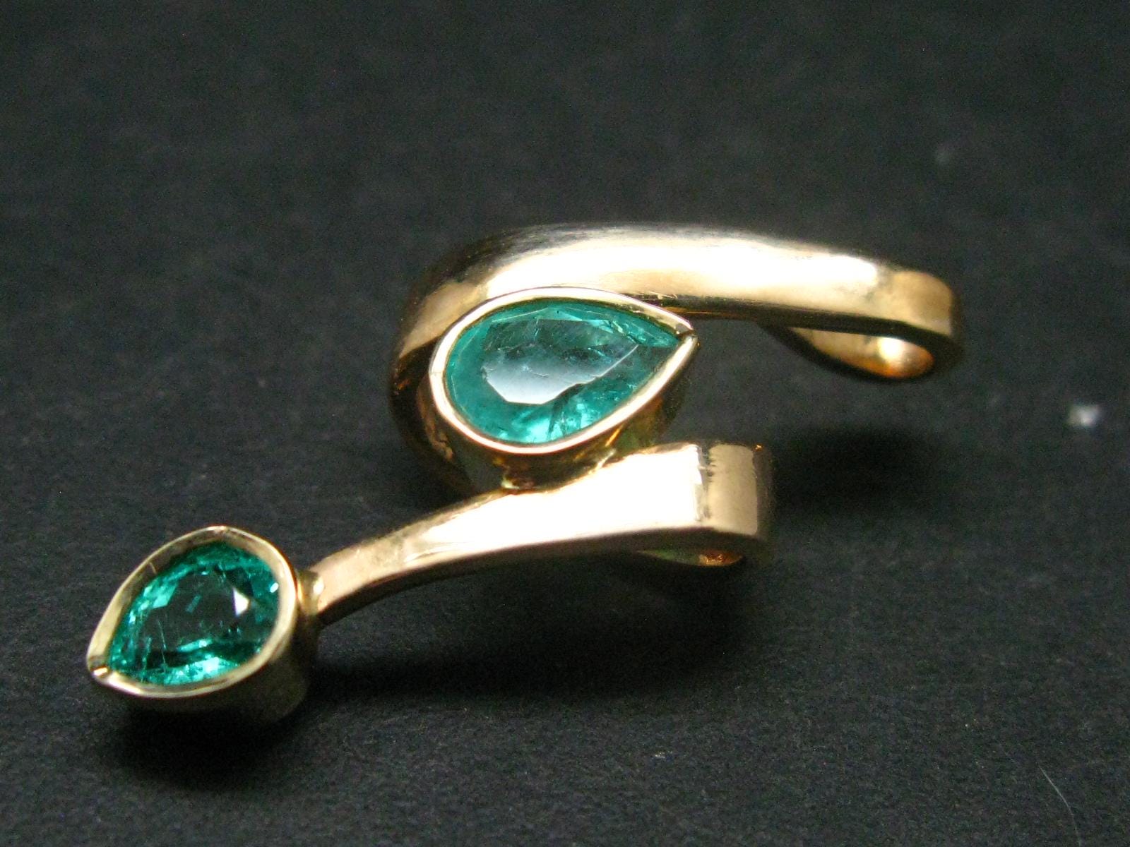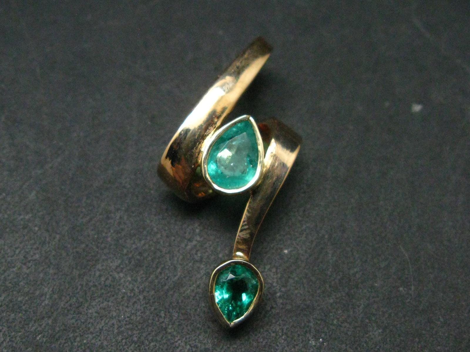 Beautiful genuine untreated Colombian Emerald pendant with 2 pear shaped stones that weigh 0.95 carats total set in 14k yellow Gold.