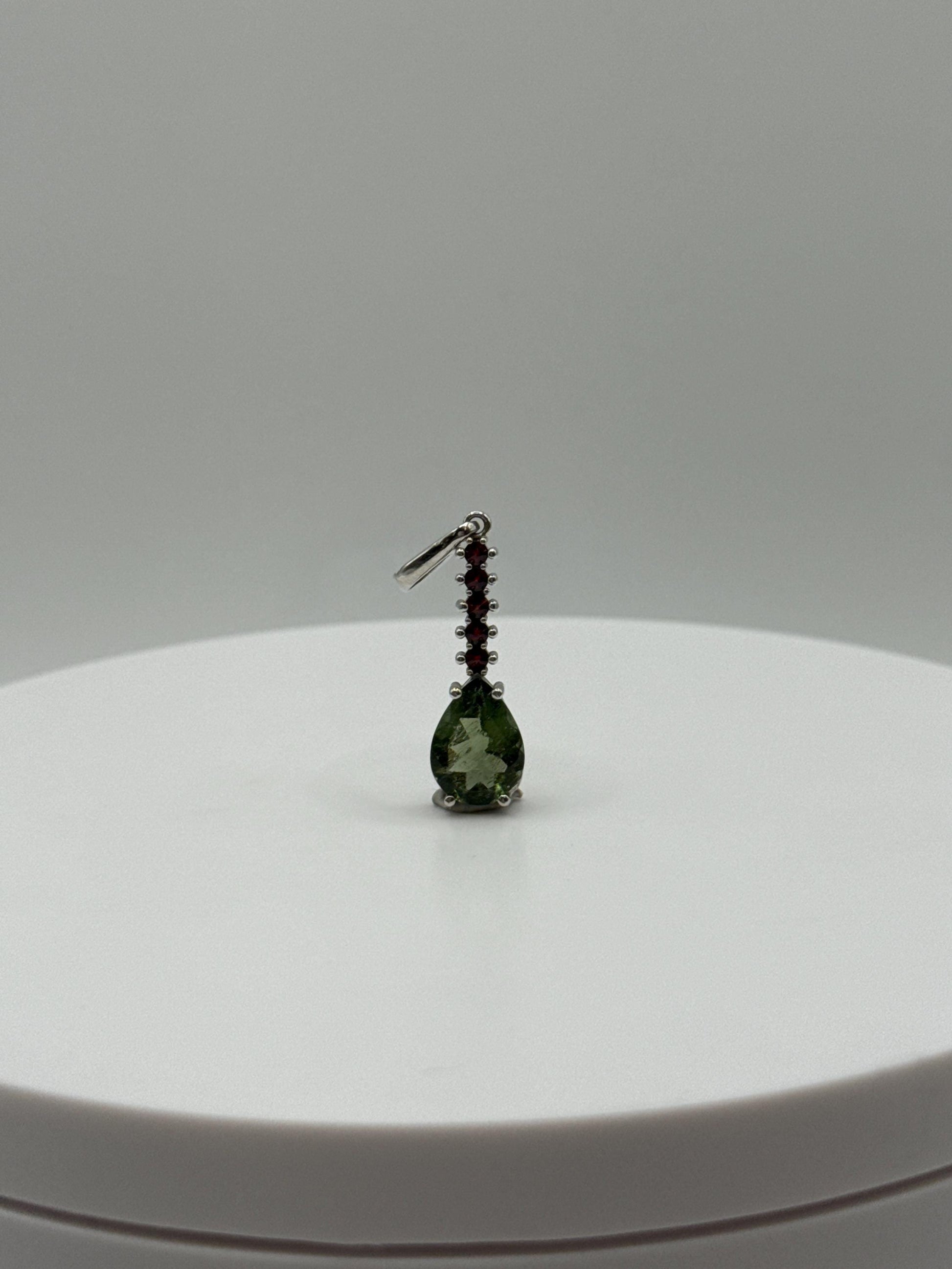 This delicate pendant features a pear-cut Moldavite complemented by vibrant red garnet accents. Set in sleek 925 sterling silver, its minimal design allows the gemstone's vibrant beauty to take center stage - perfect for both everyday wear and special moments.