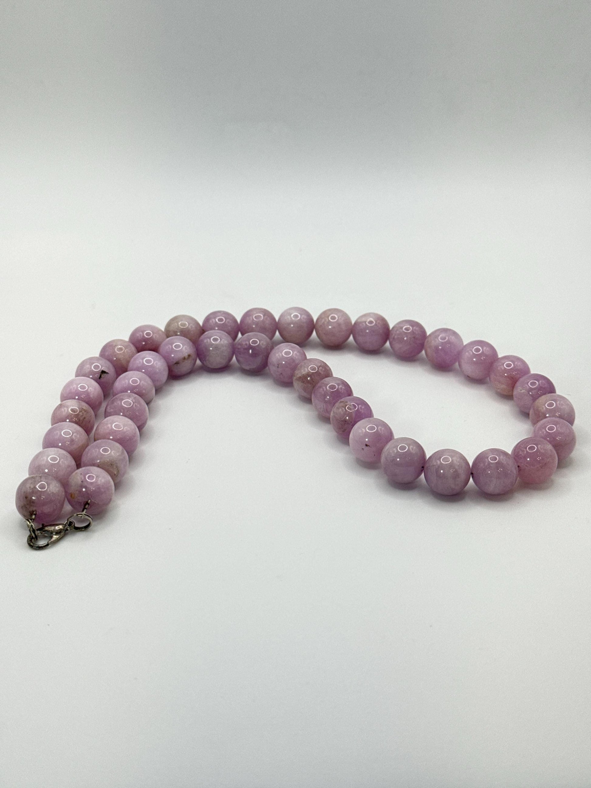 This beautiful necklace is made from 100% natural Kunzite beads, showcasing soft pastel-pink to lilac hues with a gentle, luminous sheen. Each bead is carefully polished, creating a smooth, glowing finish that feels feminine, calming, and luxurious.