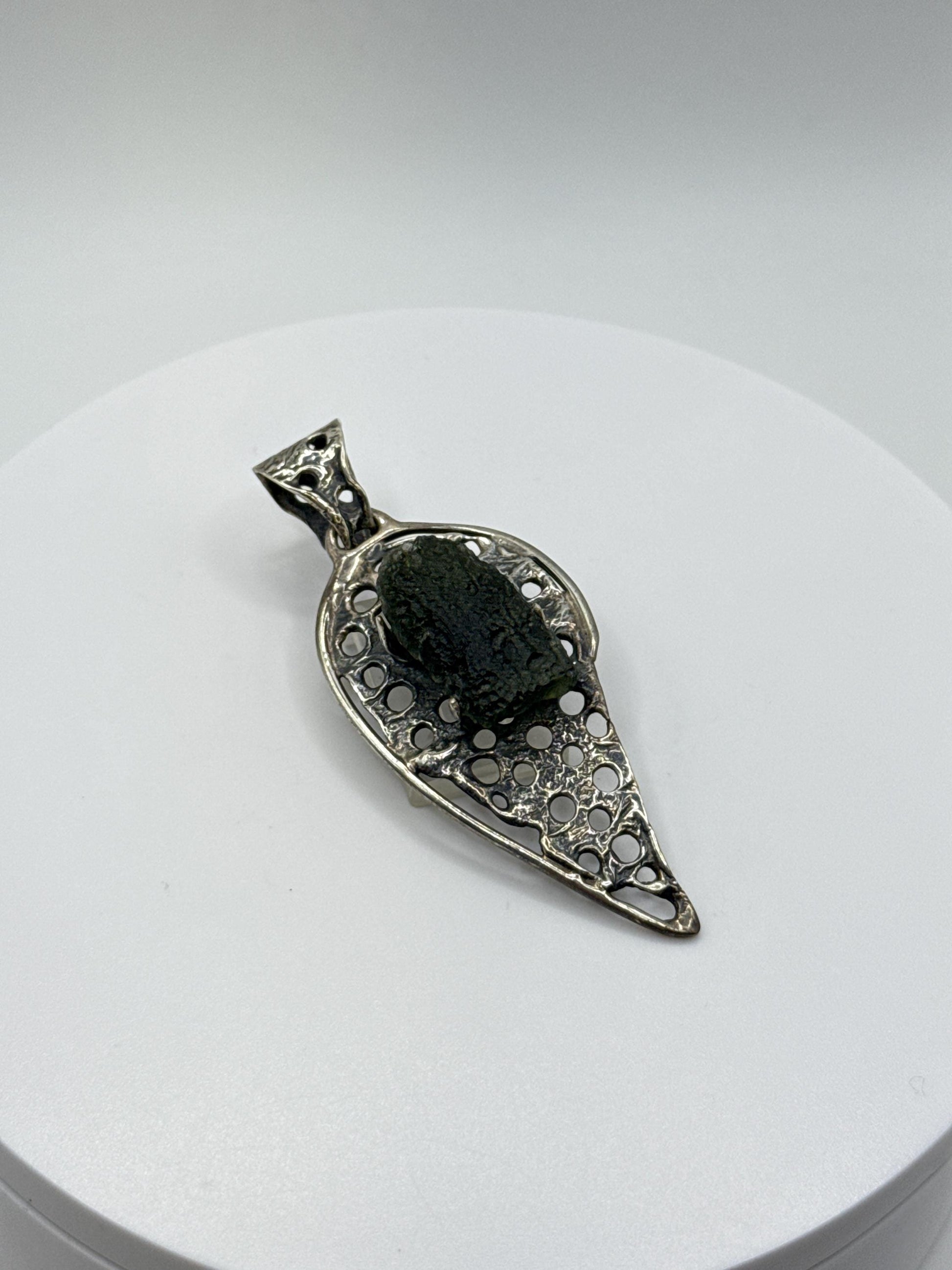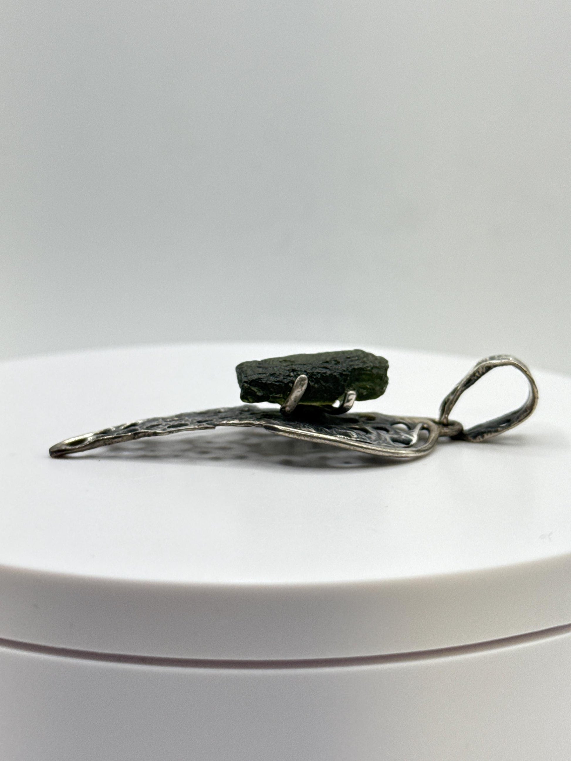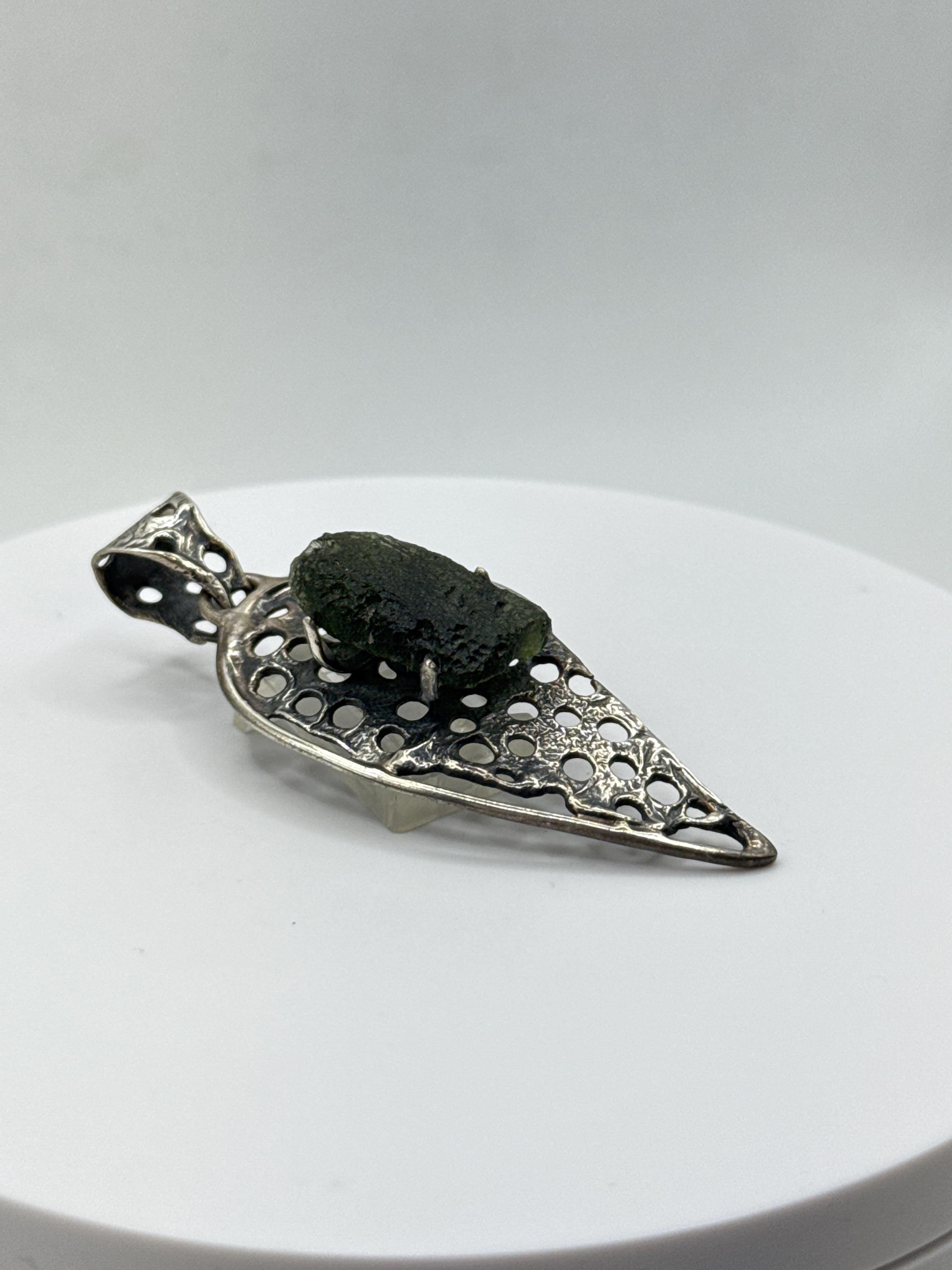 This striking Moldavite pendant features a raw natural Moldavite crystal set in an ornate sterling silver design. Moldavite, a rare green tektite formed from a meteorite impact over 15 million years ago, is known for its powerful transformative and spiritual energy.