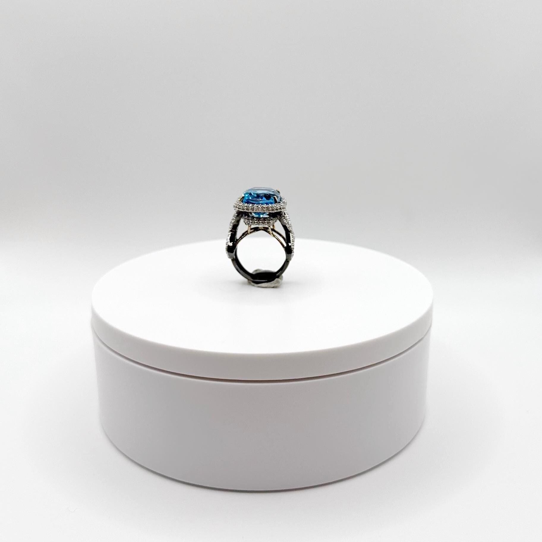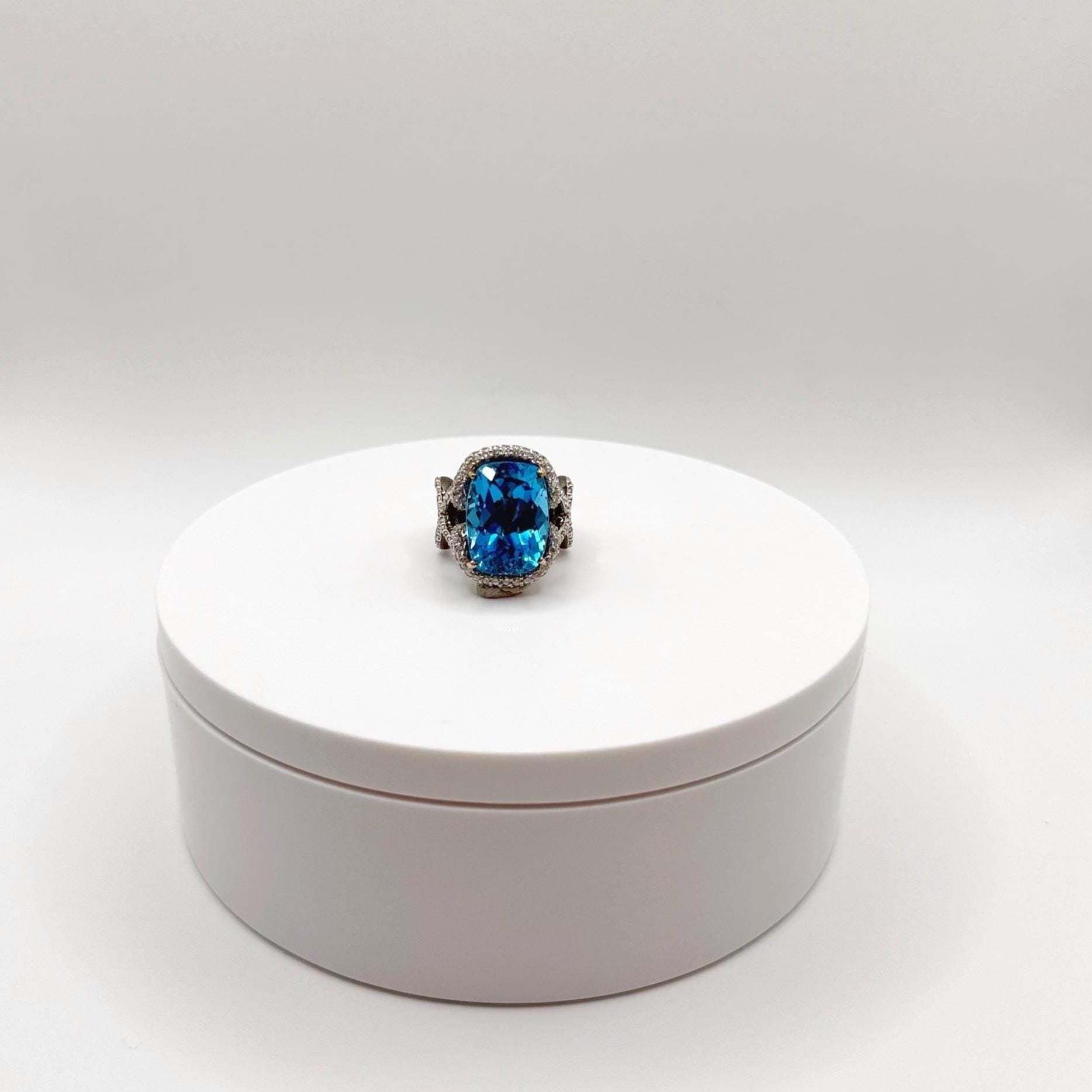 This striking ring features a vibrant Swiss blue topaz in an intricate vintage-inspired setting. The faceted gemstone shimmers with cool ocean tones, framed by delicate accents that elevate its brilliance. Perfect for making a statement while maintaining timeless elegance.