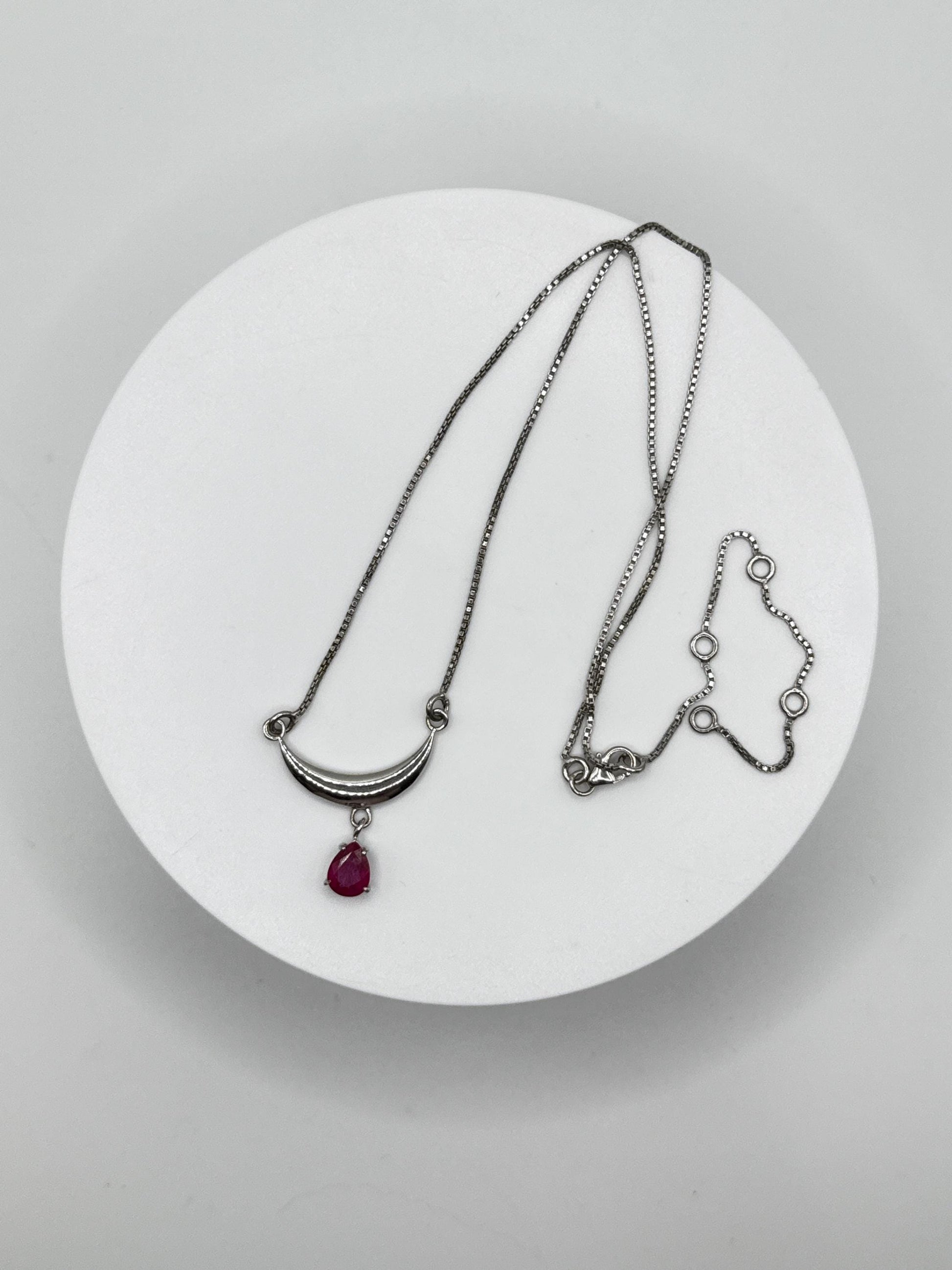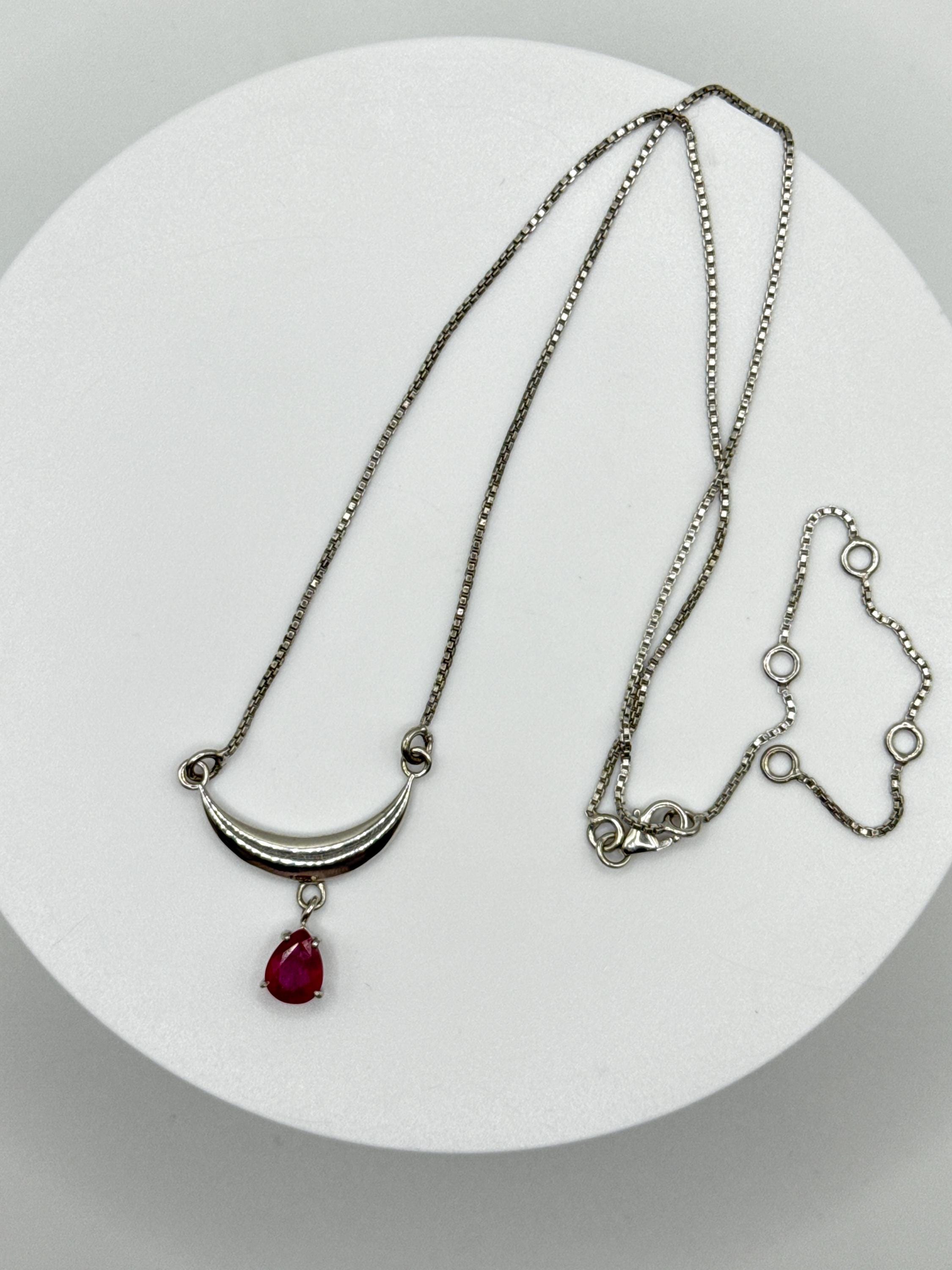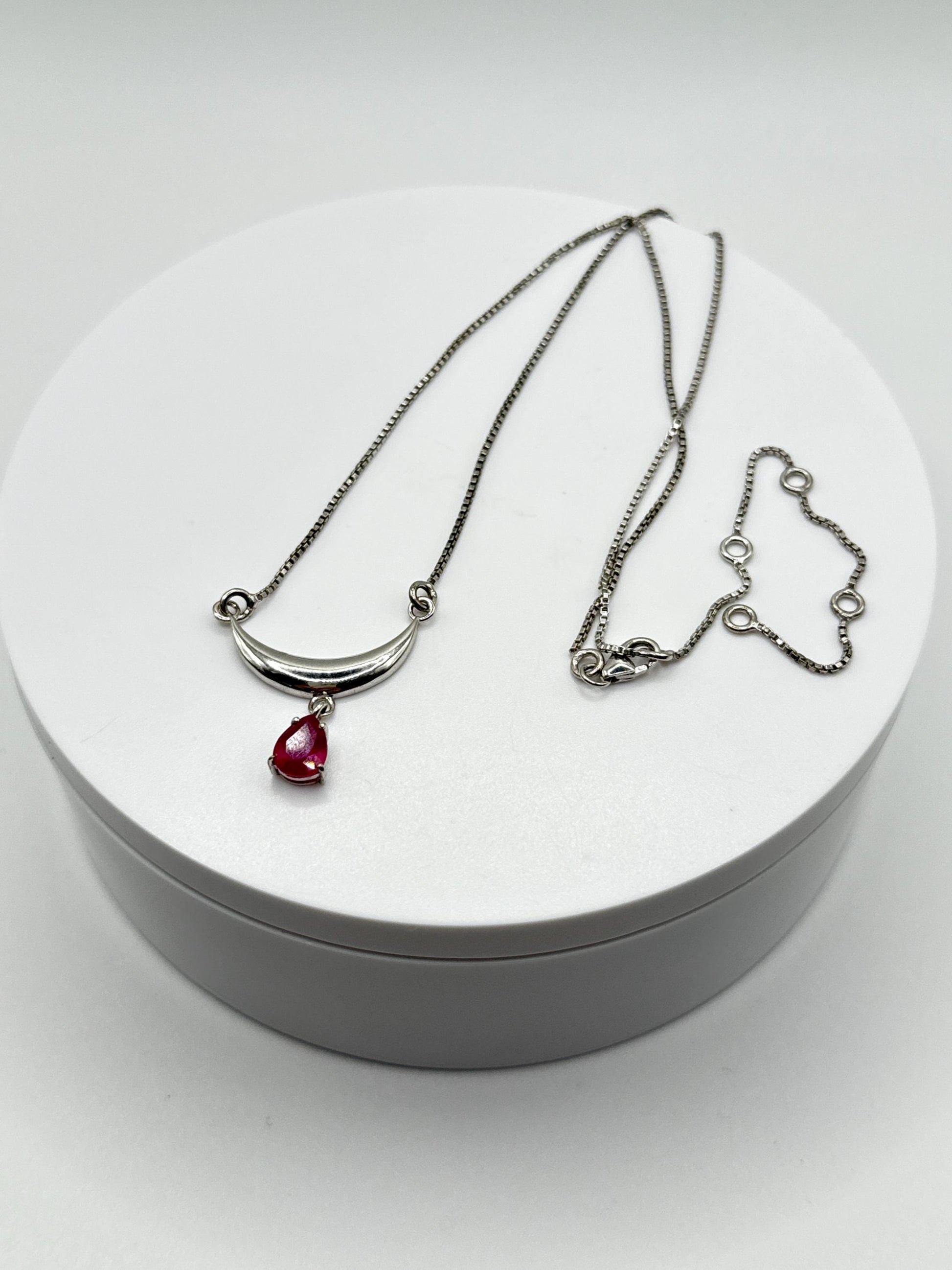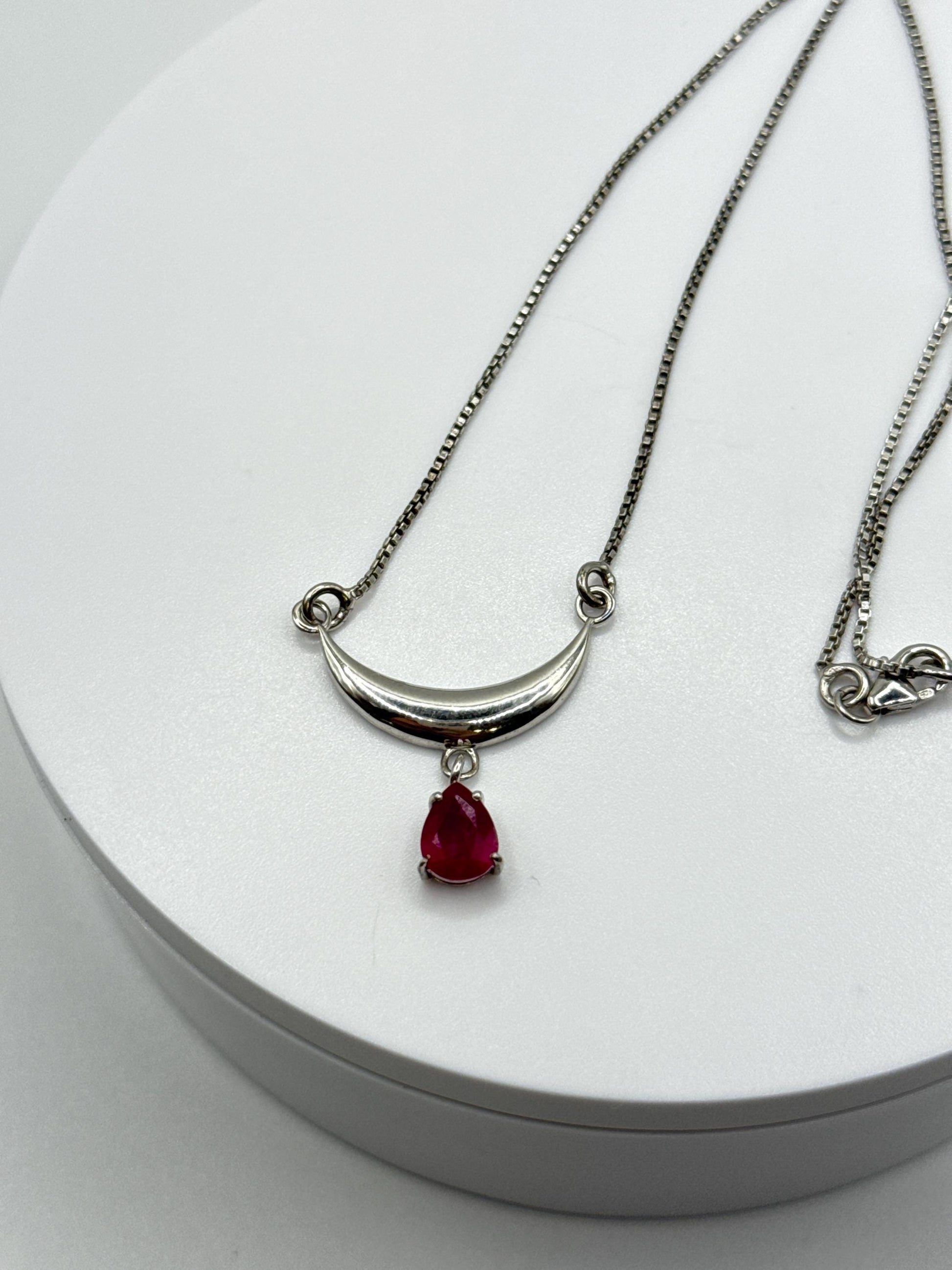 This stunning crescent moon necklace features a pear-shaped ruby gemstone suspended below a polished sterling silver crescent. Measuring 11 inches in total length, it rests delicately at the collarbone - perfect for layering or wearing solo for a touch of celestial charm.