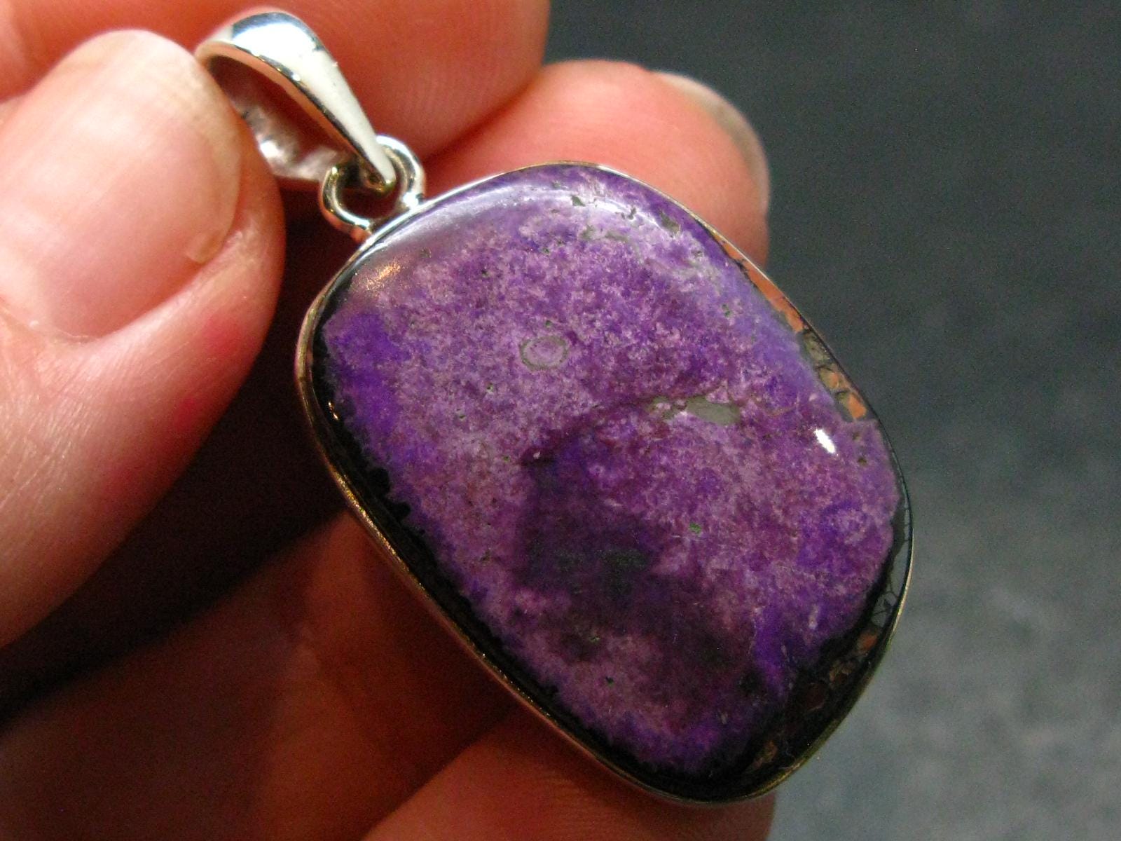 A beautiful rich purple Sugilite silver pendant from South Africa with a good color. Sugilite is 2.5 centimeters.