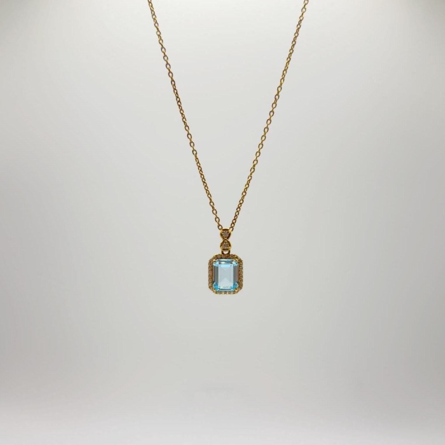 Elegant and timeless, this Swiss blue topaz pendant features a brilliant emerald-cut stone framed in a detailed gold-plated setting. The delicate gold chain adds a warm contrast to the cool blue shimmer, making this piece both refined and eye-catching. Swiss Blue Topaz is the birthstone for November, symbolizing love, clarity, and calm energy. A thoughtful gift for a loved one or a beautiful keepsake to celebrate your November birthstone.