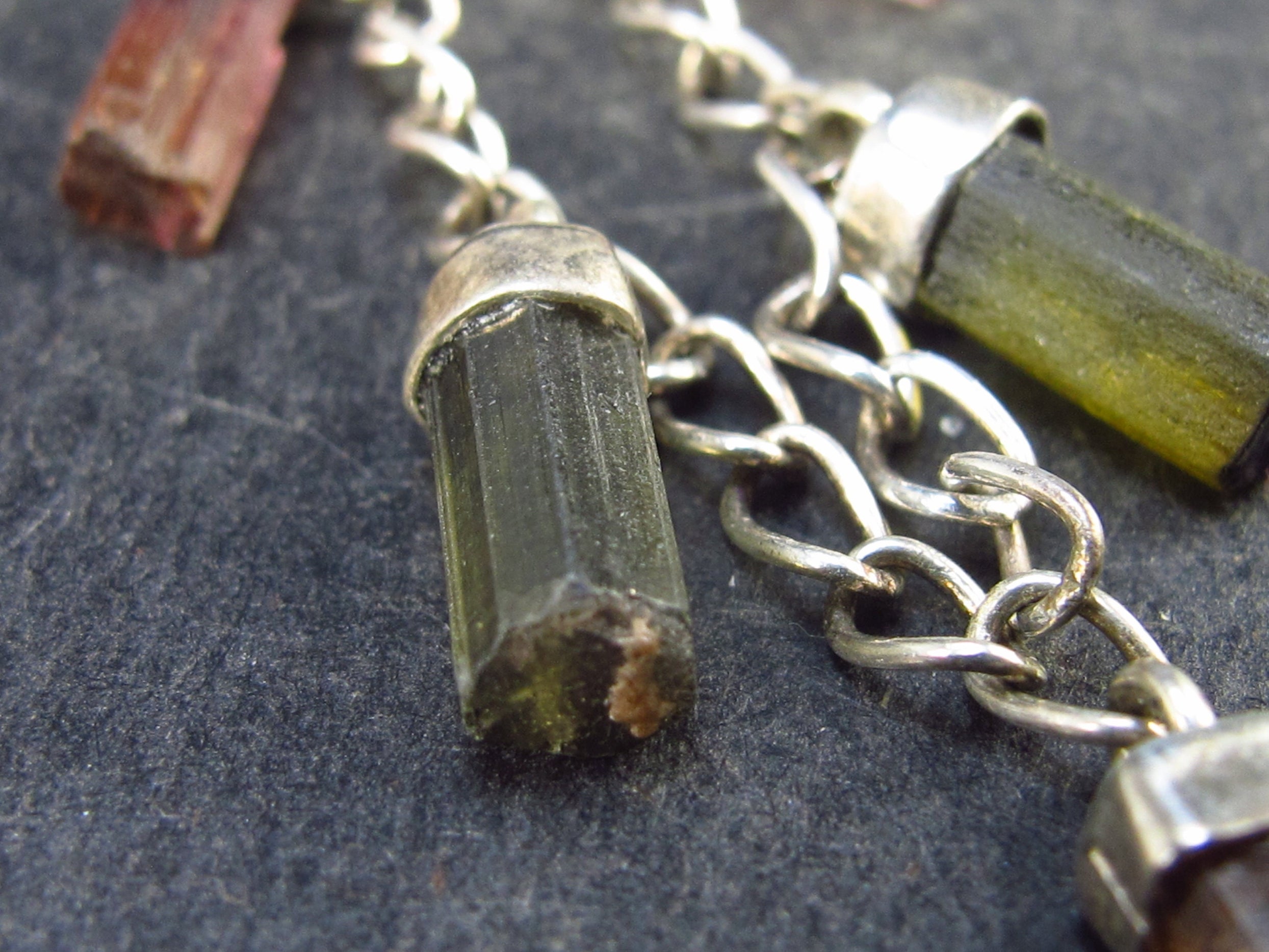 This is a beautiful multicolored (green, pink, blue) Tourmaline crystal necklace from Brazil. It is in great condition, has natural, untreated color.