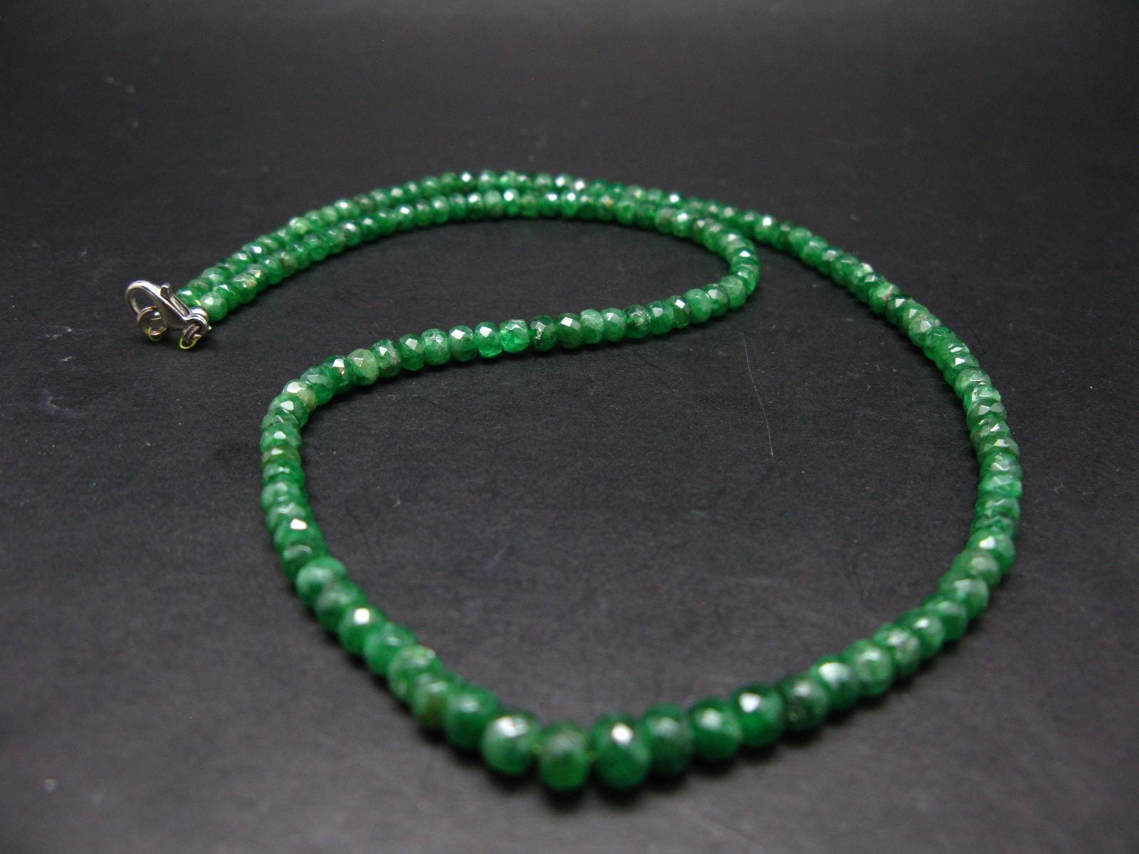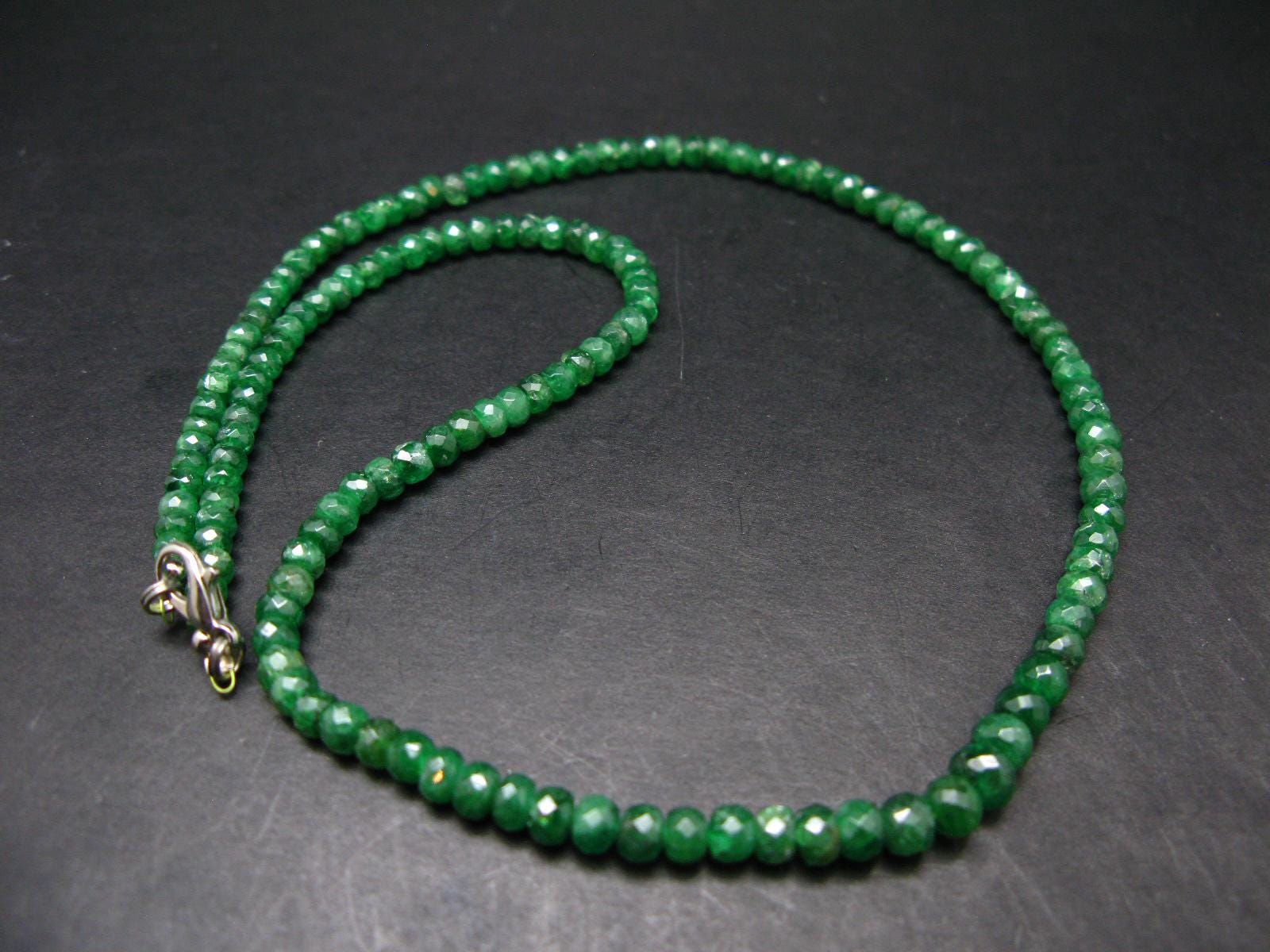 A beautiful, rare gem quality Tsavorite Garnet necklace from Tanzania with facetted rondelle beads. It weighs 19.5 grams and beads are 4-5 mm in diameter.