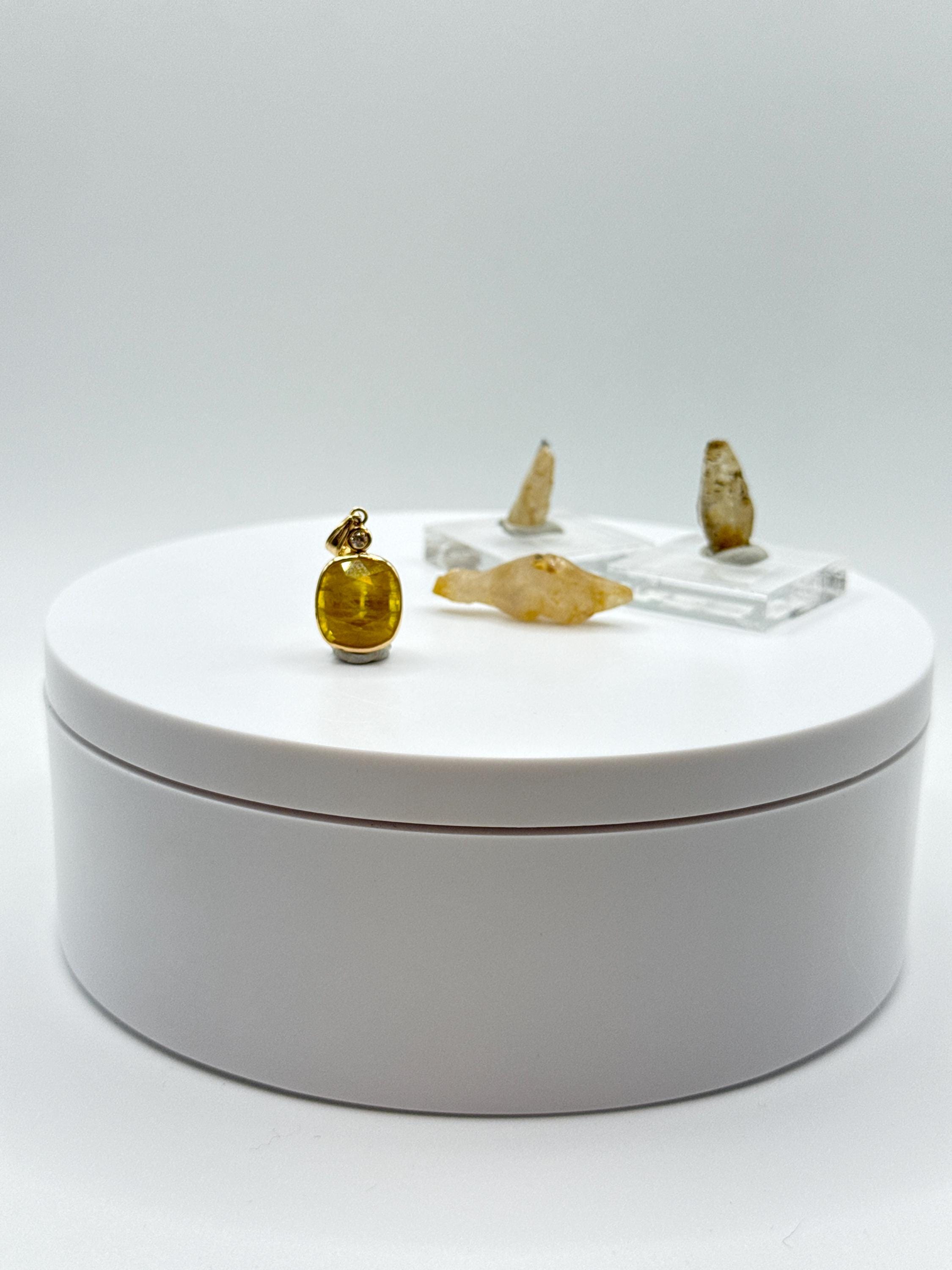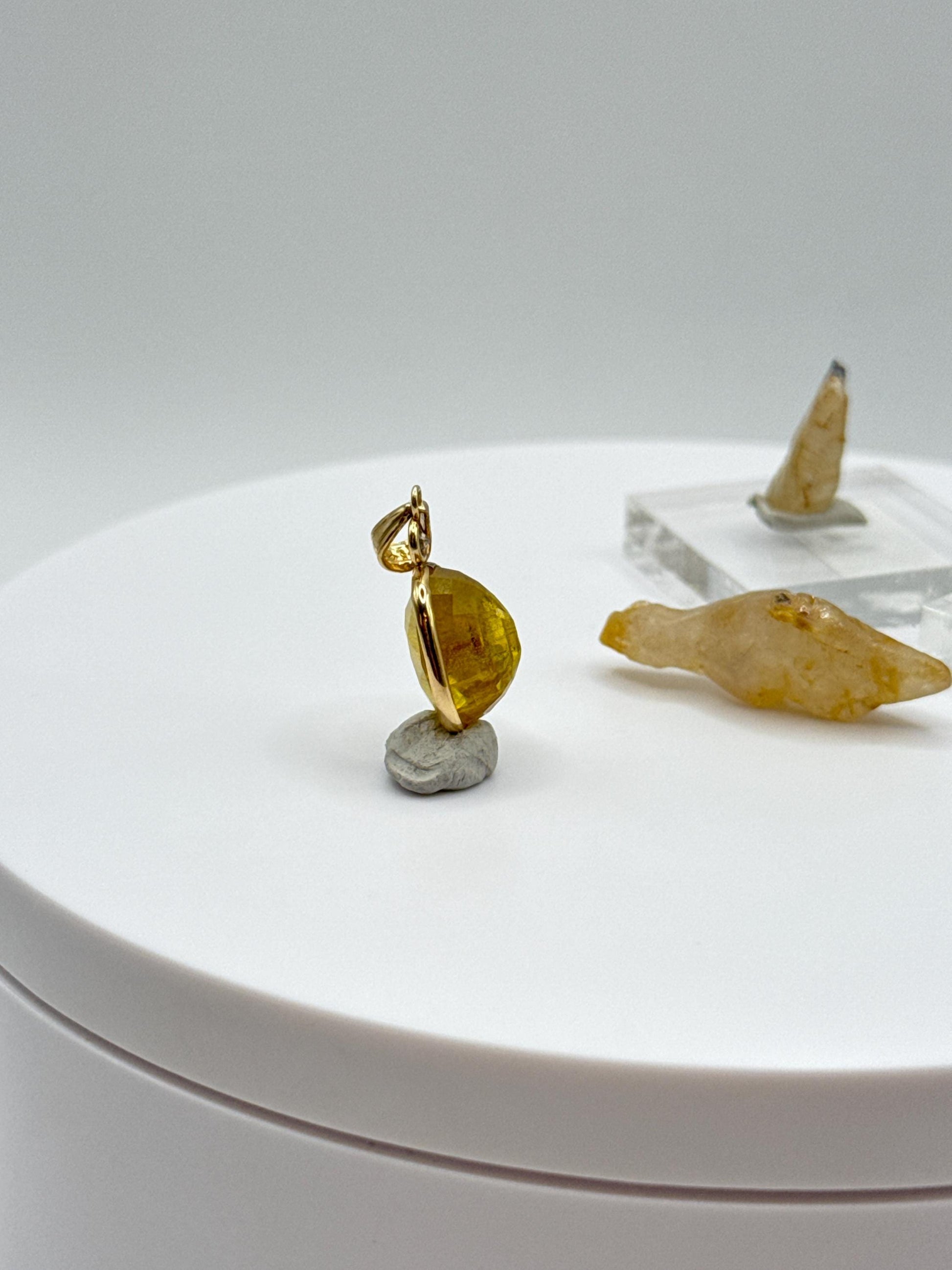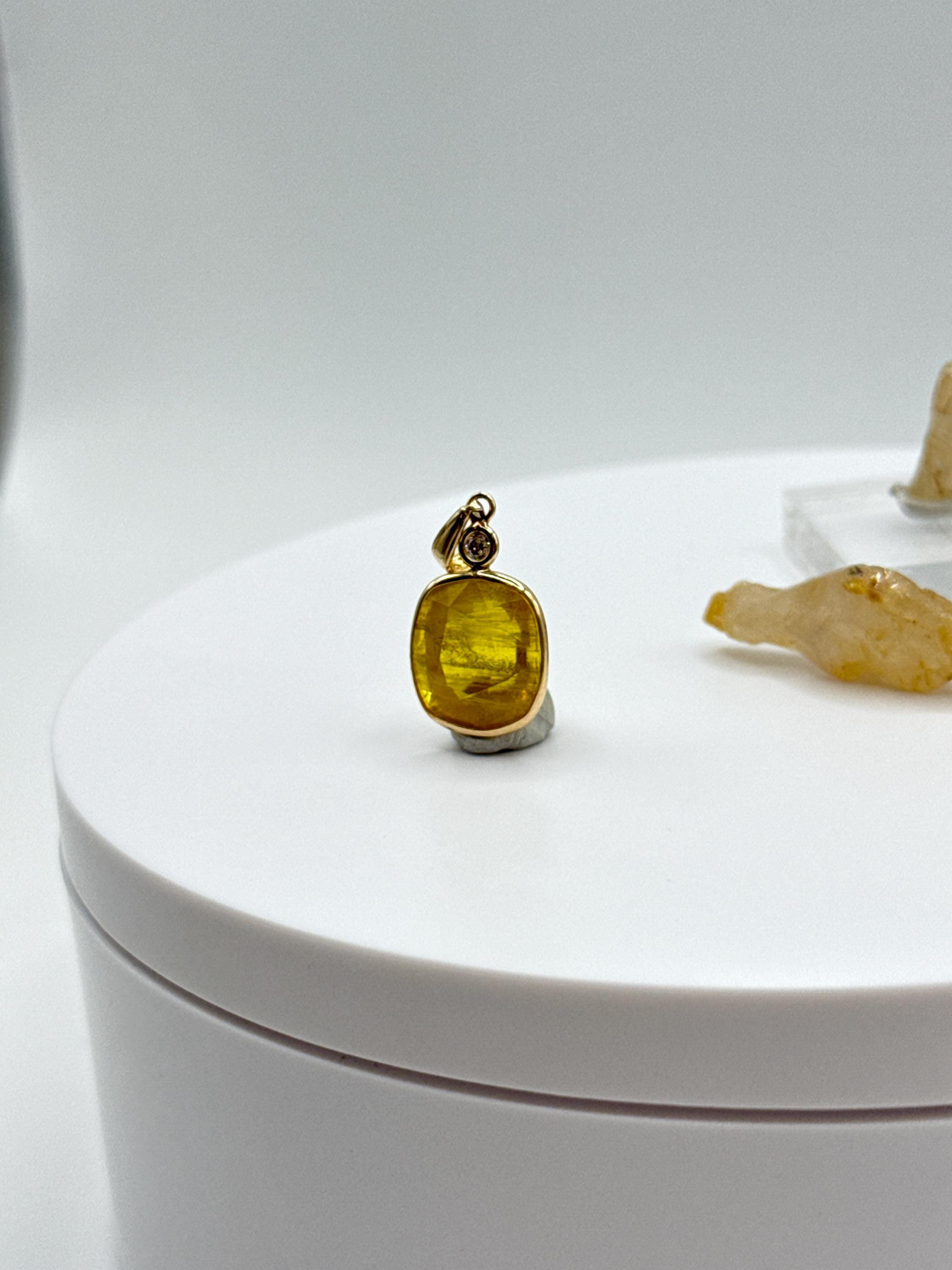 This striking pendant highlights a natural cushion-cut yellow sapphire, set in a polished gold bezel with a sparkling round accent above. The vivid golden hue of the sapphire radiates warmth and vitality, symbolizing prosperity, clarity, and joy. Its bold yet elegant design makes it perfect for everyday sophistication or as a statement piece for special occasions. As the September birthstone, this pendant also carries deep personal meaning, making it a thoughtful gift for birthdays, anniversaries, or anyone drawn to the uplifting energy of yellow sapphire.