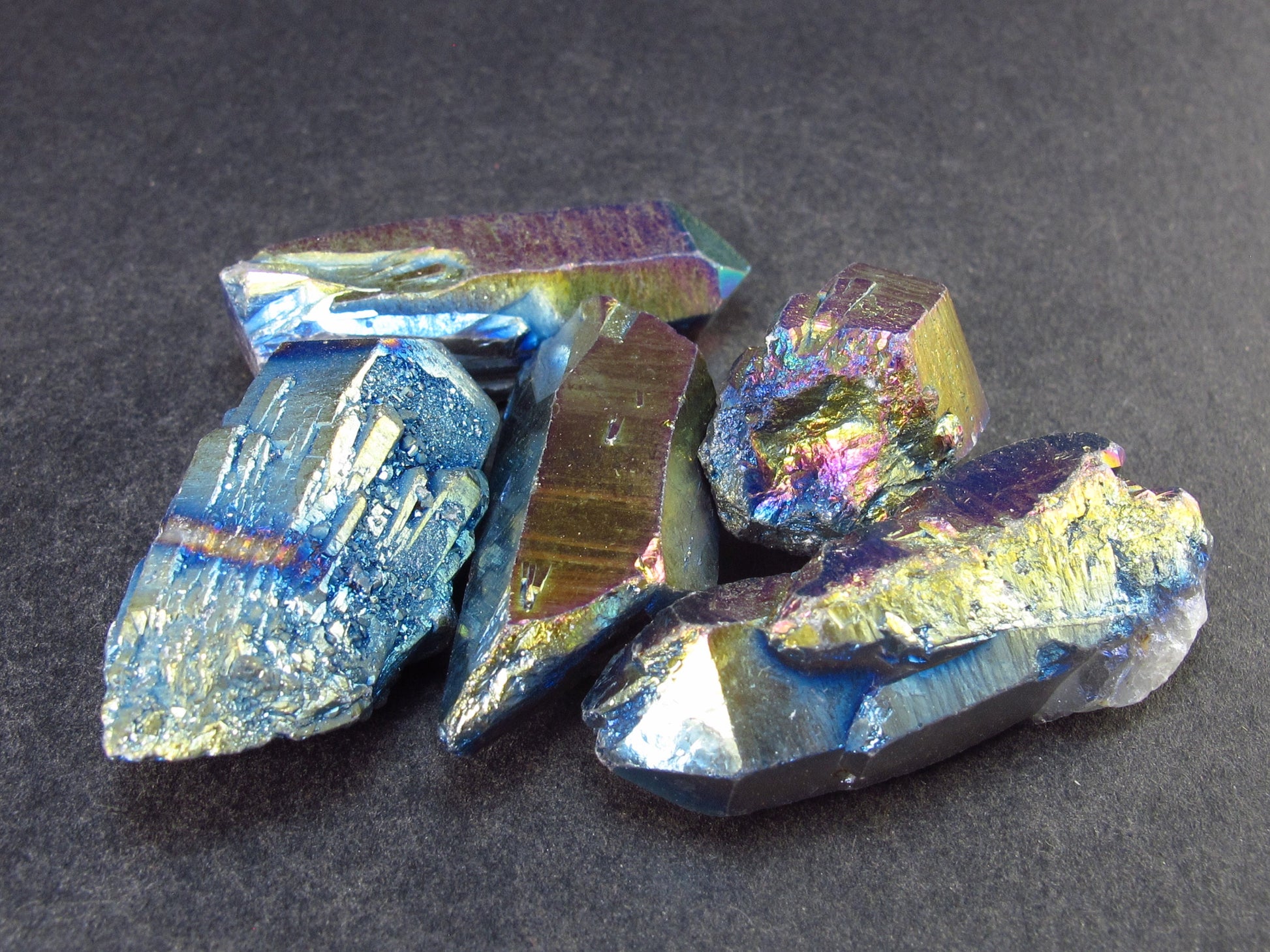 Lot of 5 fine Titanium coated Aura Quartz crystals from Brazil.