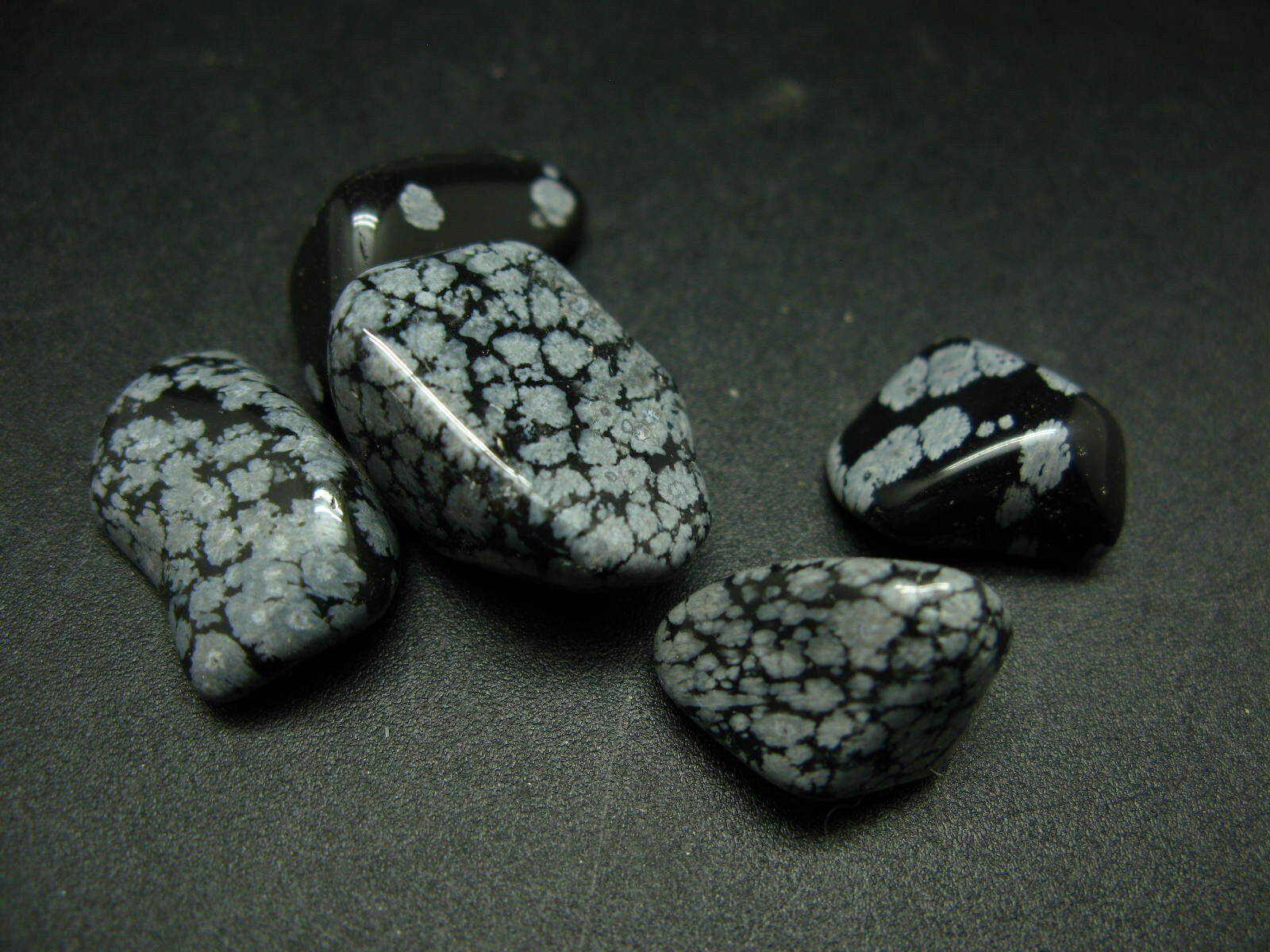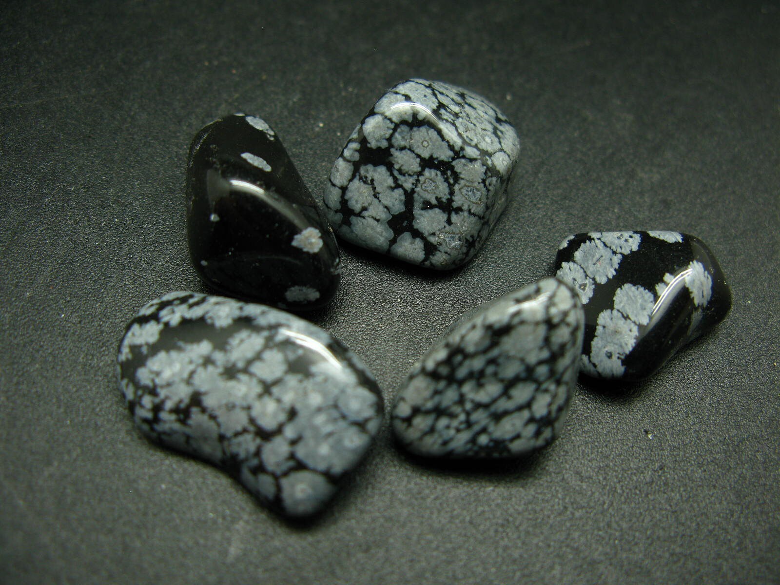 Lot of very nice 5 tumbled Snowflake Obsidian (variety of Obsidian, which is a variety of natural Glass) that has black body colour and numerous small radiating inclusions of cristobalite.
