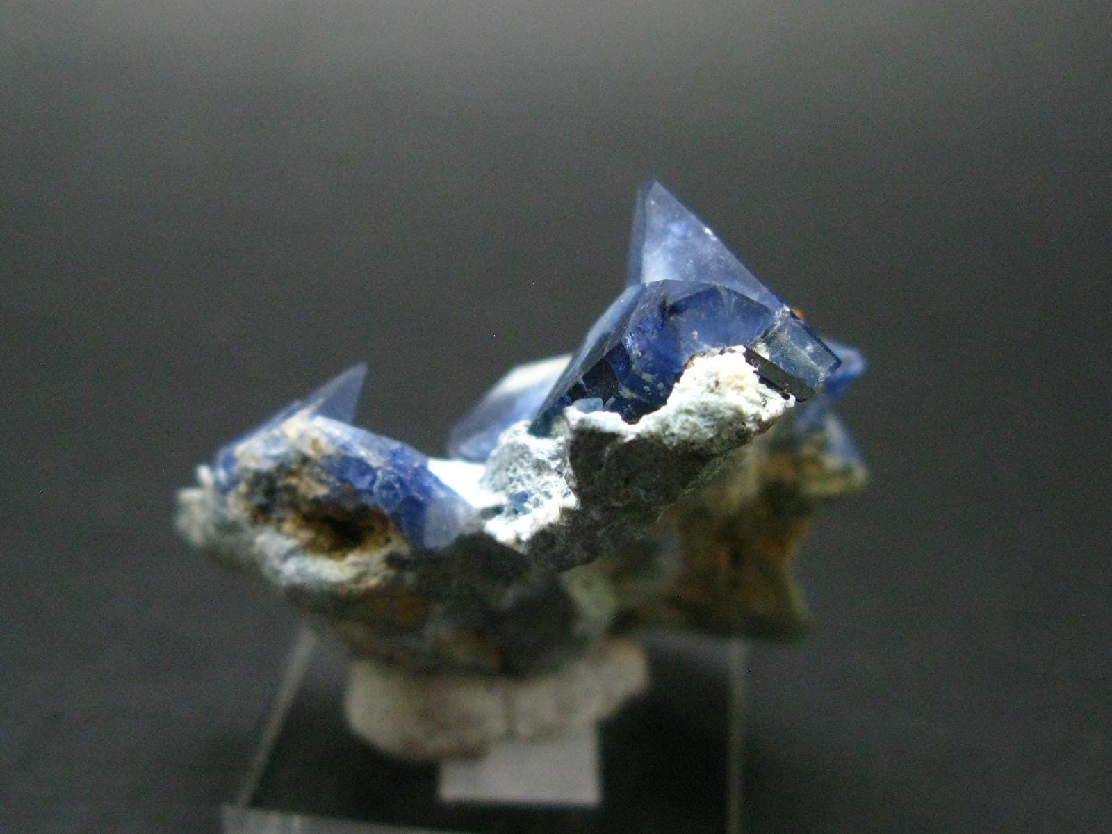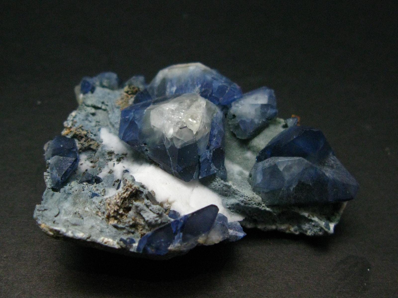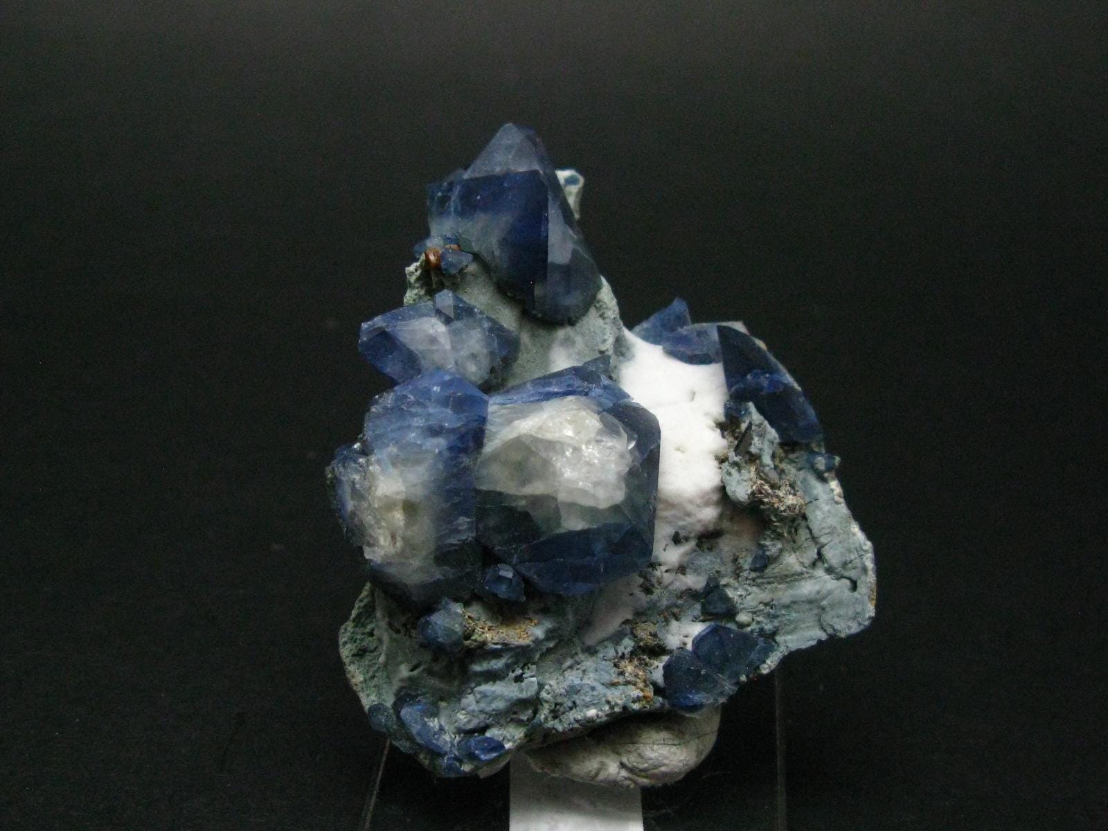 This is a very nice gem quality museum quality Benitoite crystals along with Neptunite crystals on matrix. The Benitoites are up to 1.7cm long and longest Neptunite is 0.5cm long. There is a total of 20 Benitoites on this piece in great condition.
