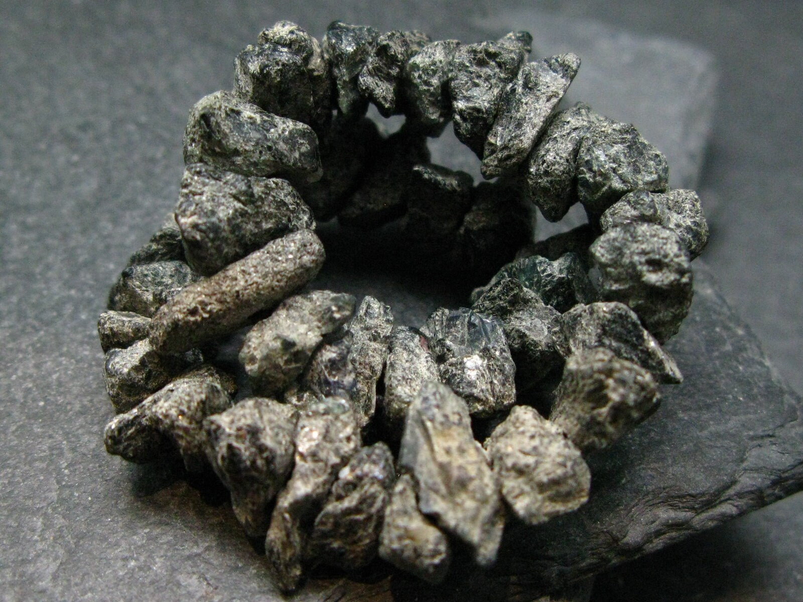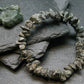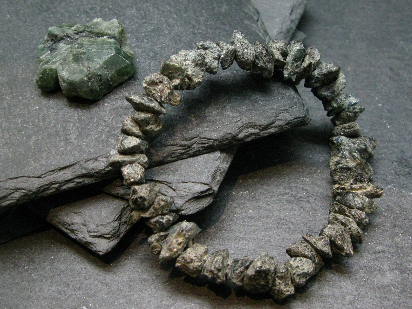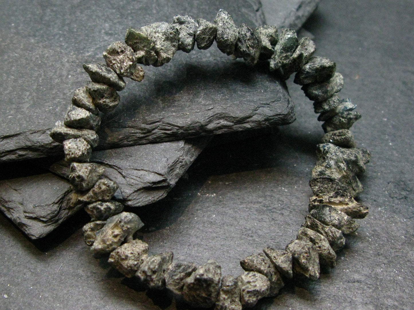 The beads are raw crystals on an elastic. They measures 8-12mm in length. We make all the bracelets ourselves, here in Canada.