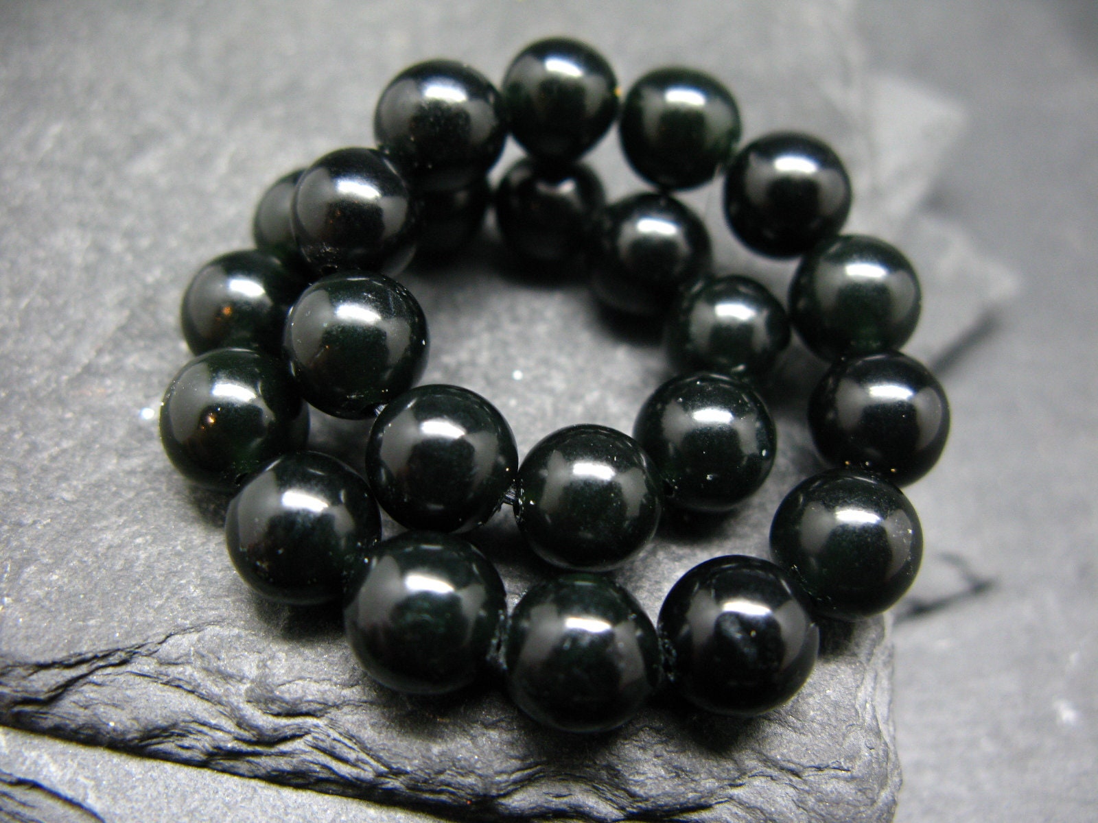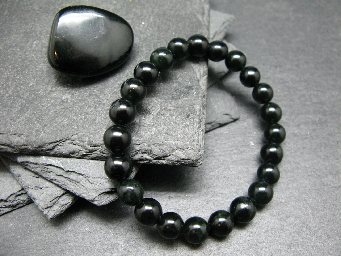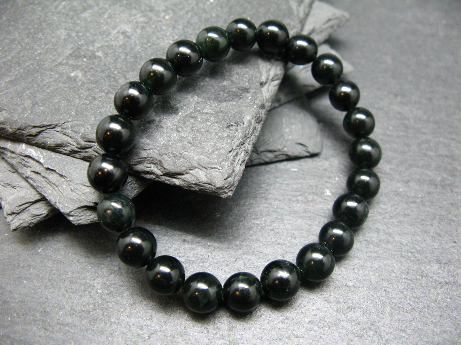 You are bidding on a genuine black Nephrite Jade bracelet made with 100% natural stones. They are actually a very very dark green, but only visible under strong light, like all genuine black Jades. The beads are round and strung on a top quality elastic. They measures 8mm in diameter. We make all the bracelets ourselves, here in Canada.