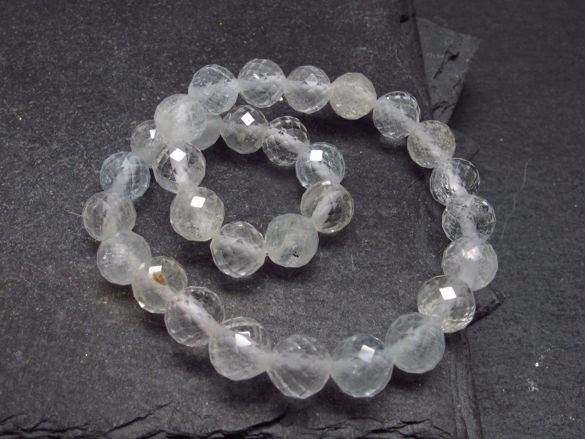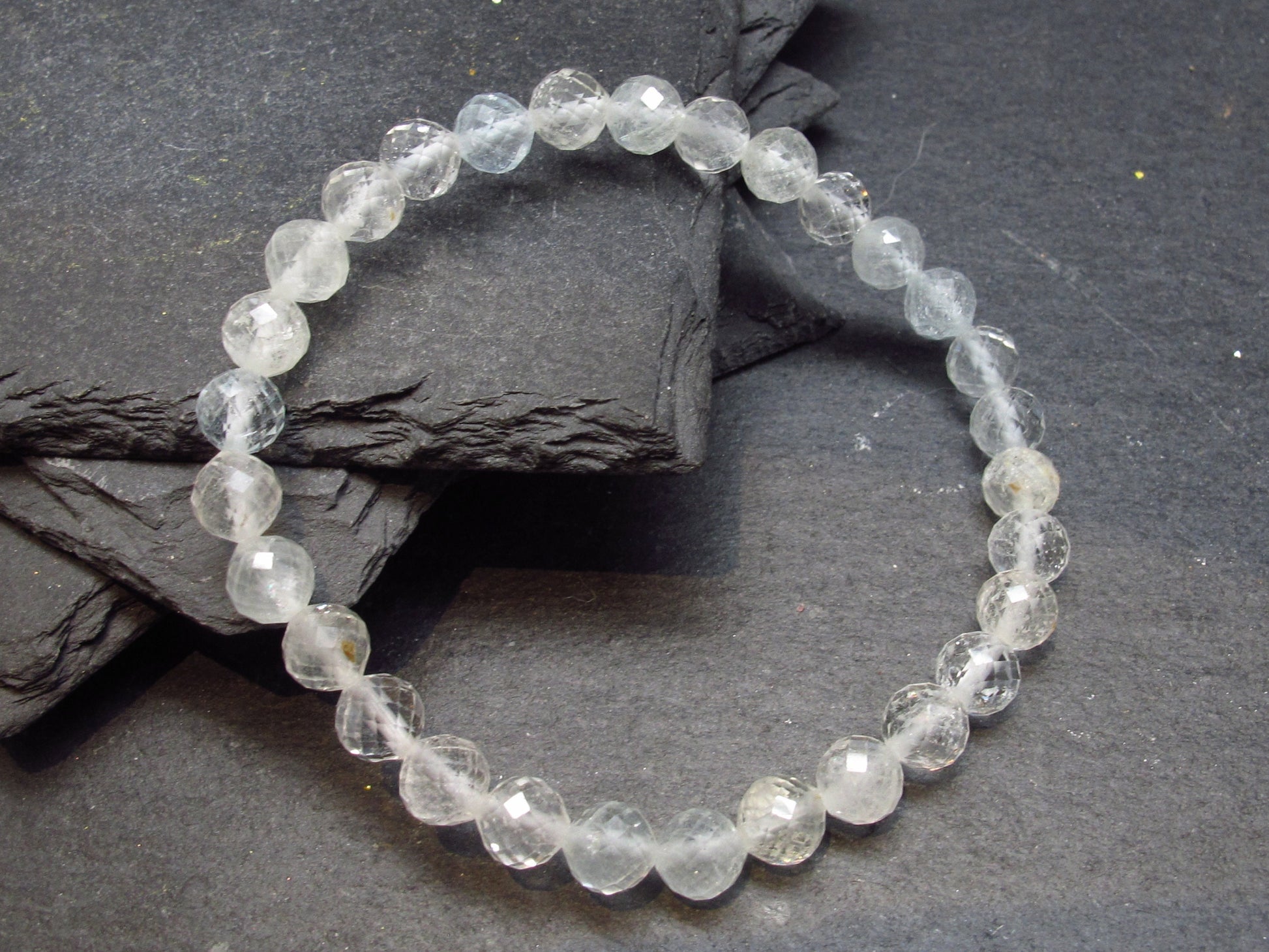 The beads are round and facetted and strung on a top quality elastic. They measures 6mm in diameter. We make all the bracelets ourselves, here in Canada.