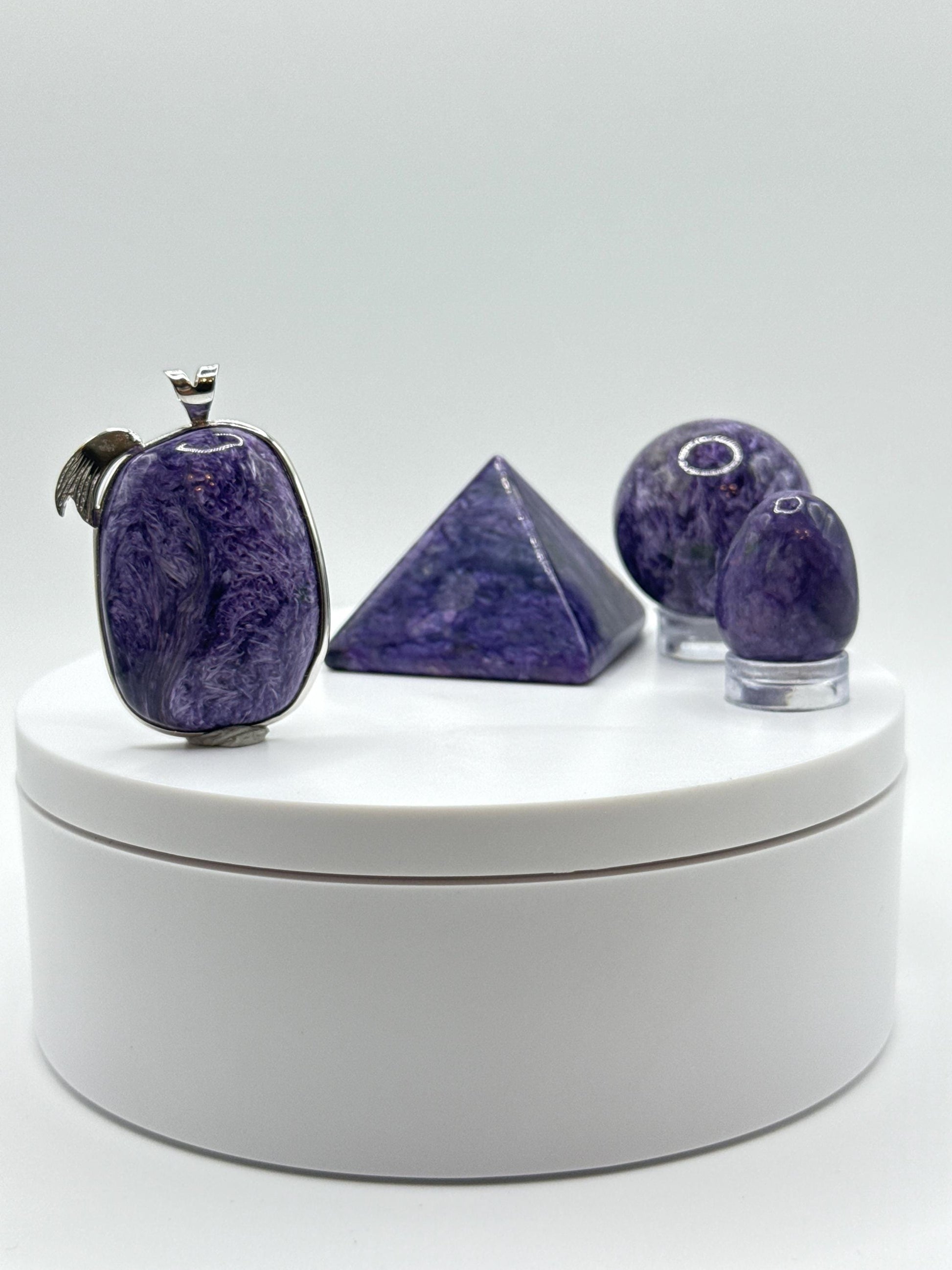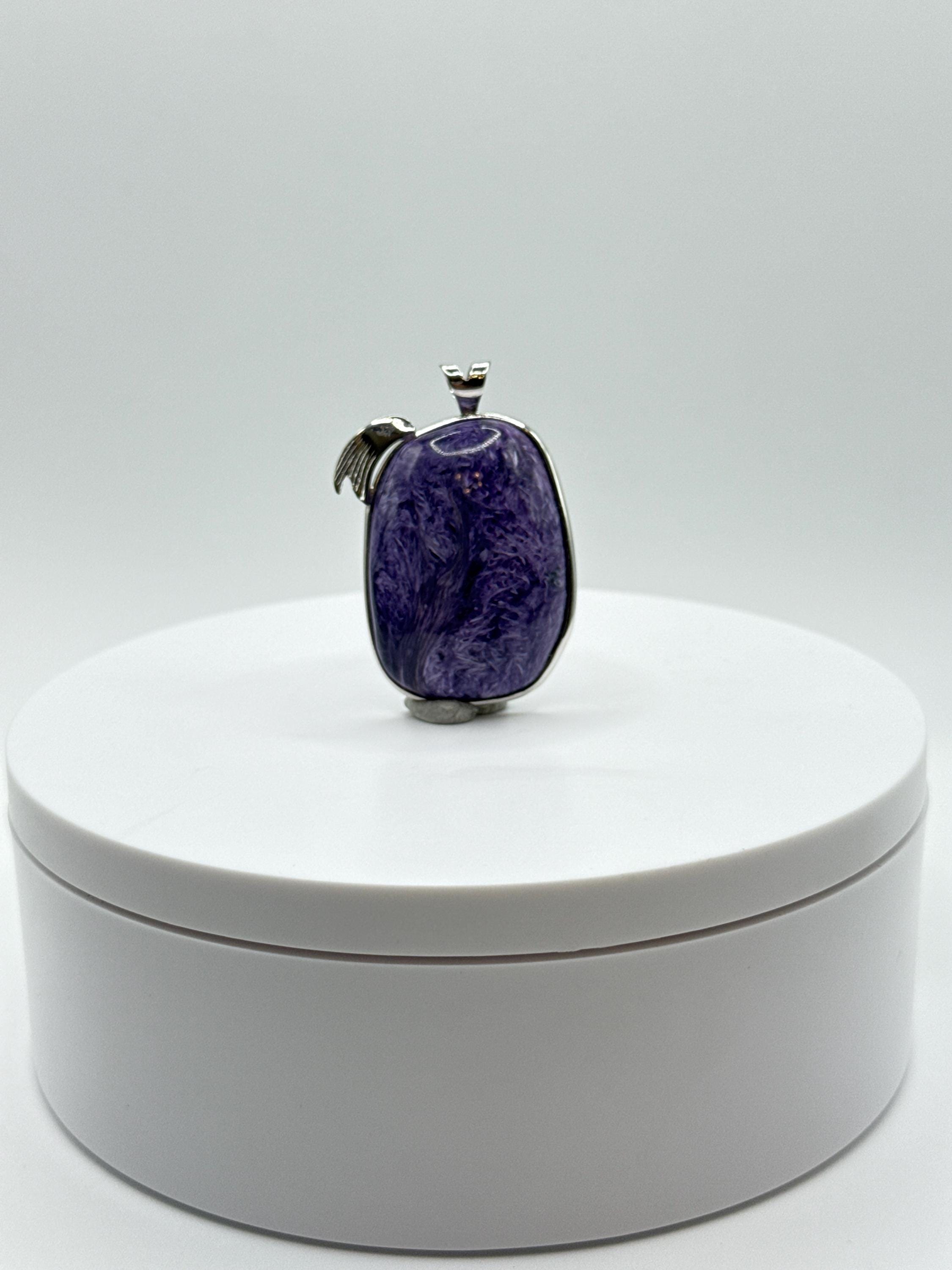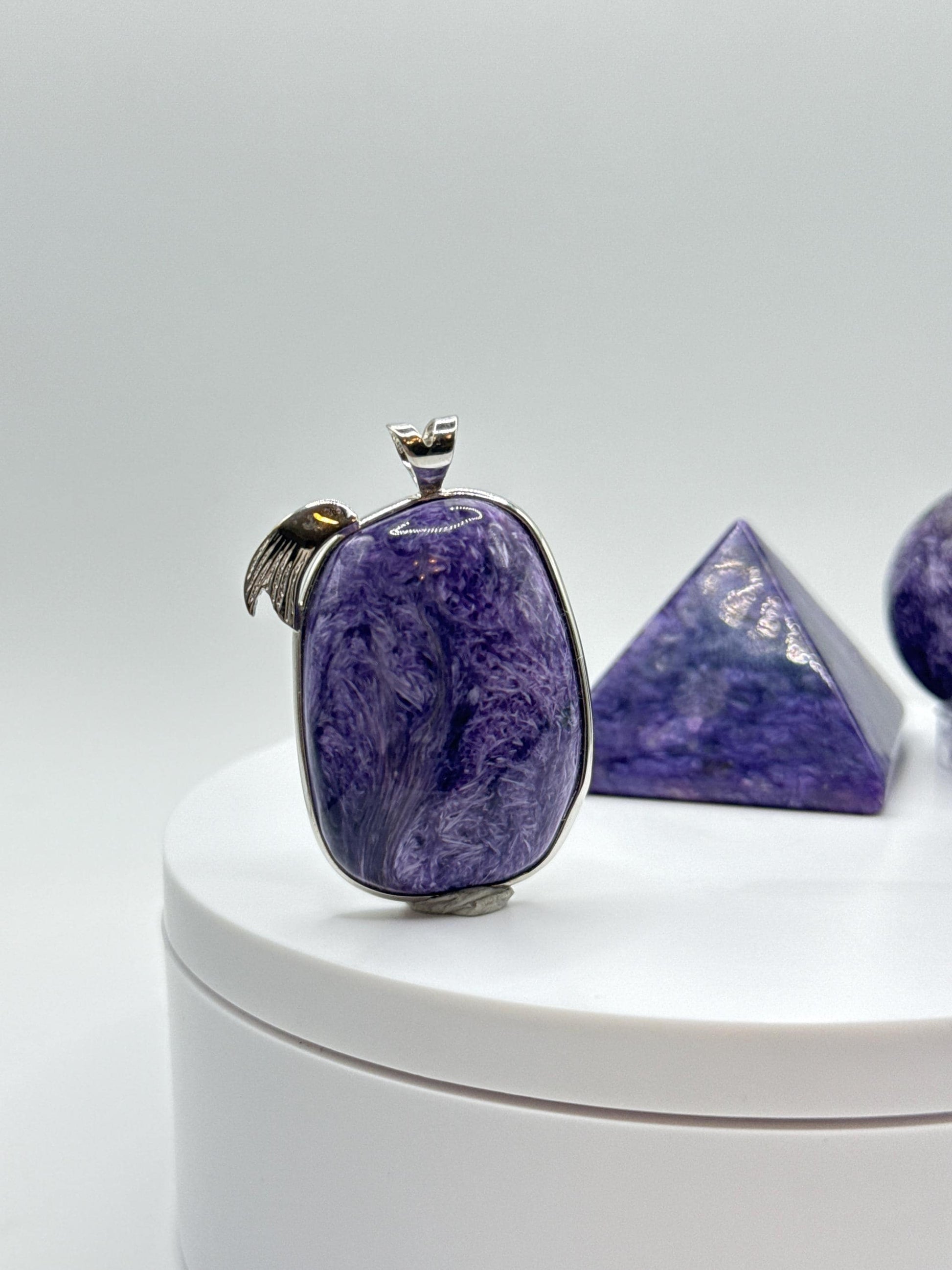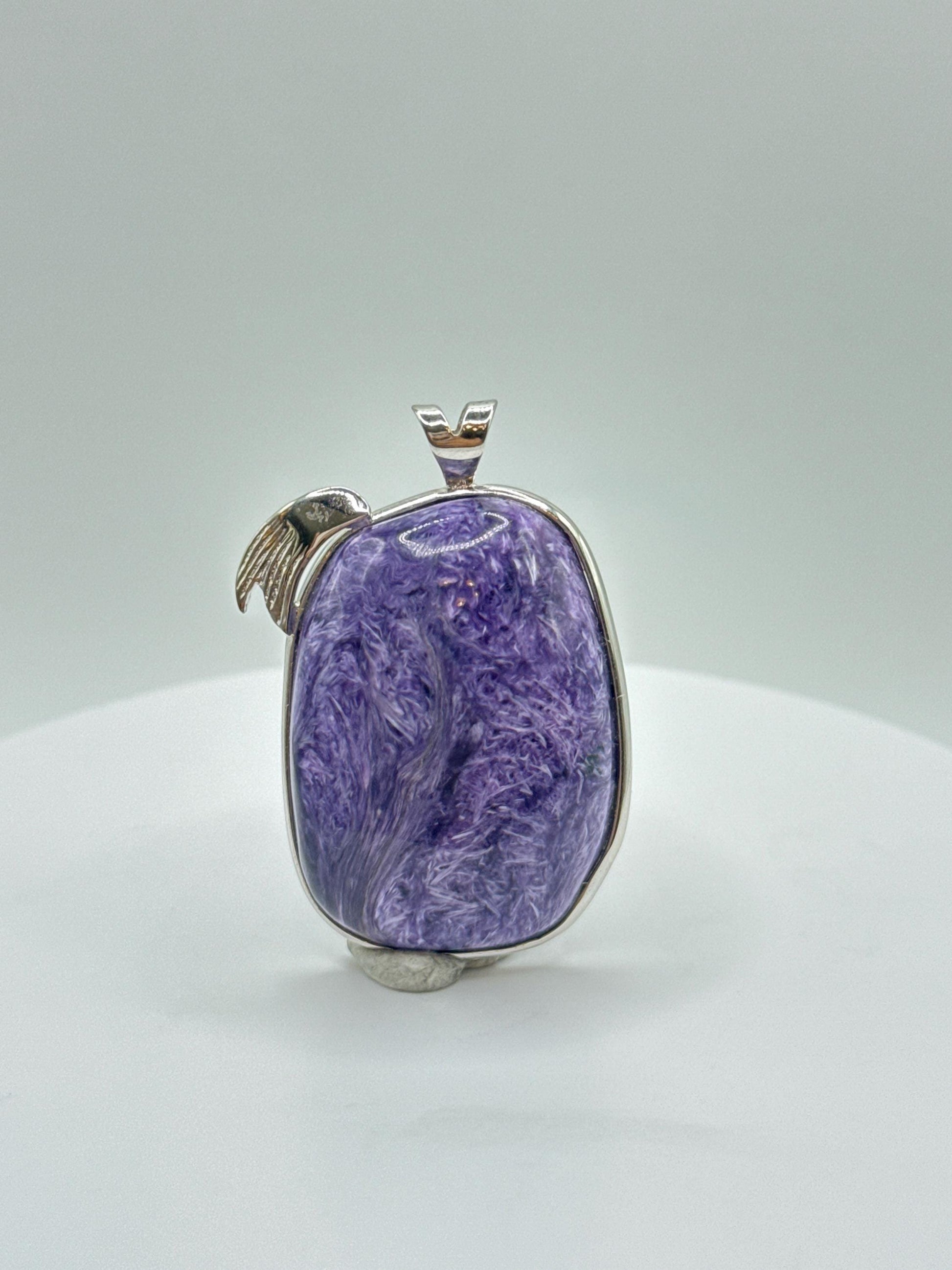This captivating pendant features a polished Charoite gemstone, rich with swirling lavender and deep violet patterns, set in a sleek sterling silver frame. A delicate silver angel wing detail on the side adds a symbolic touch of protection and guidance. Charoite, a rare gemstone found only in Siberia, is celebrated for its transformative, grounding, and protective energies. Elegant and meaningful, this pendant is a perfect choice for crystal lovers, collectors, and anyone seeking a unique piece that combines beauty with spiritual significance.