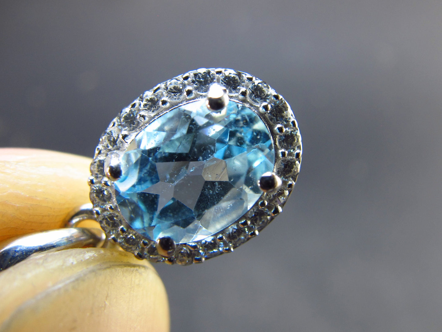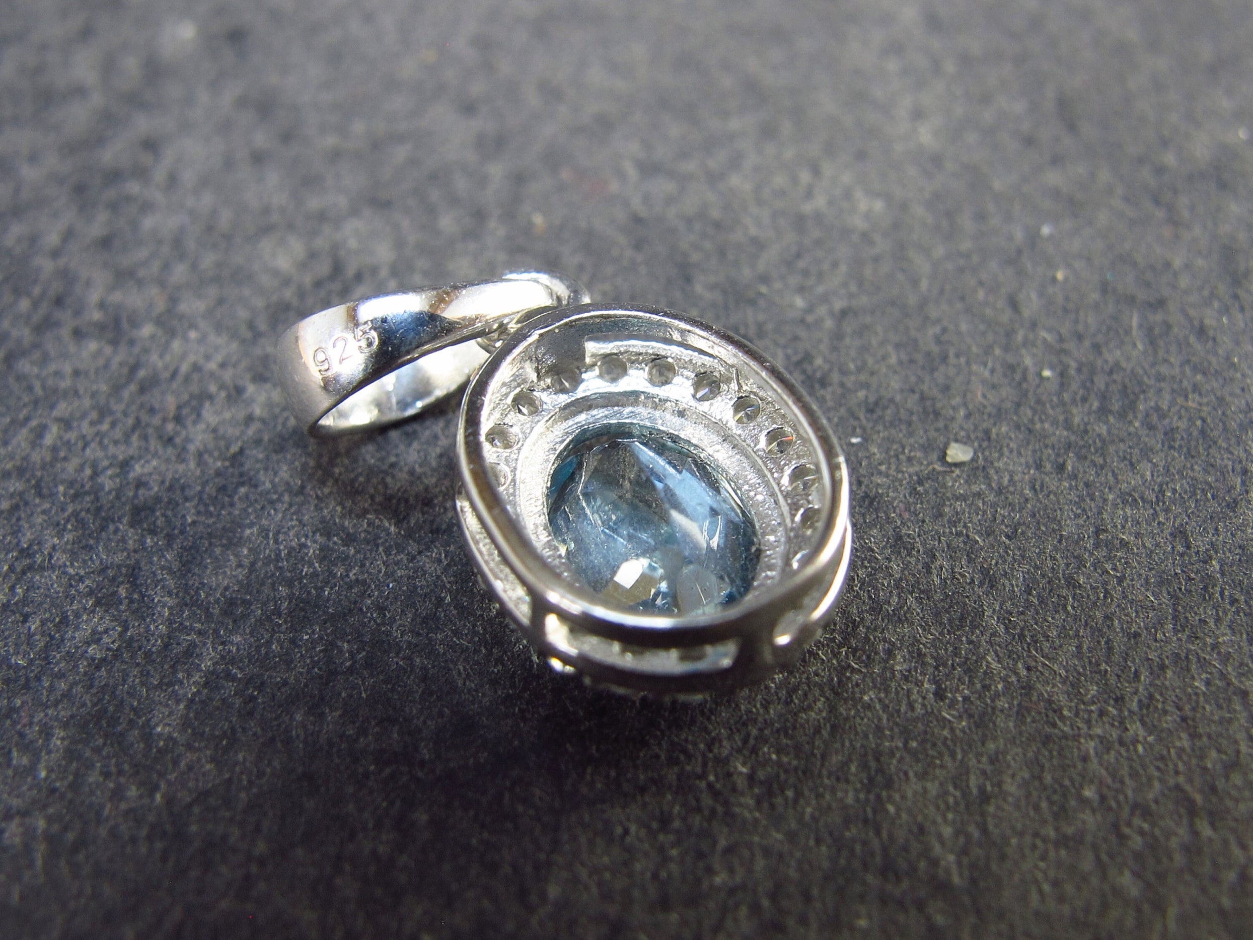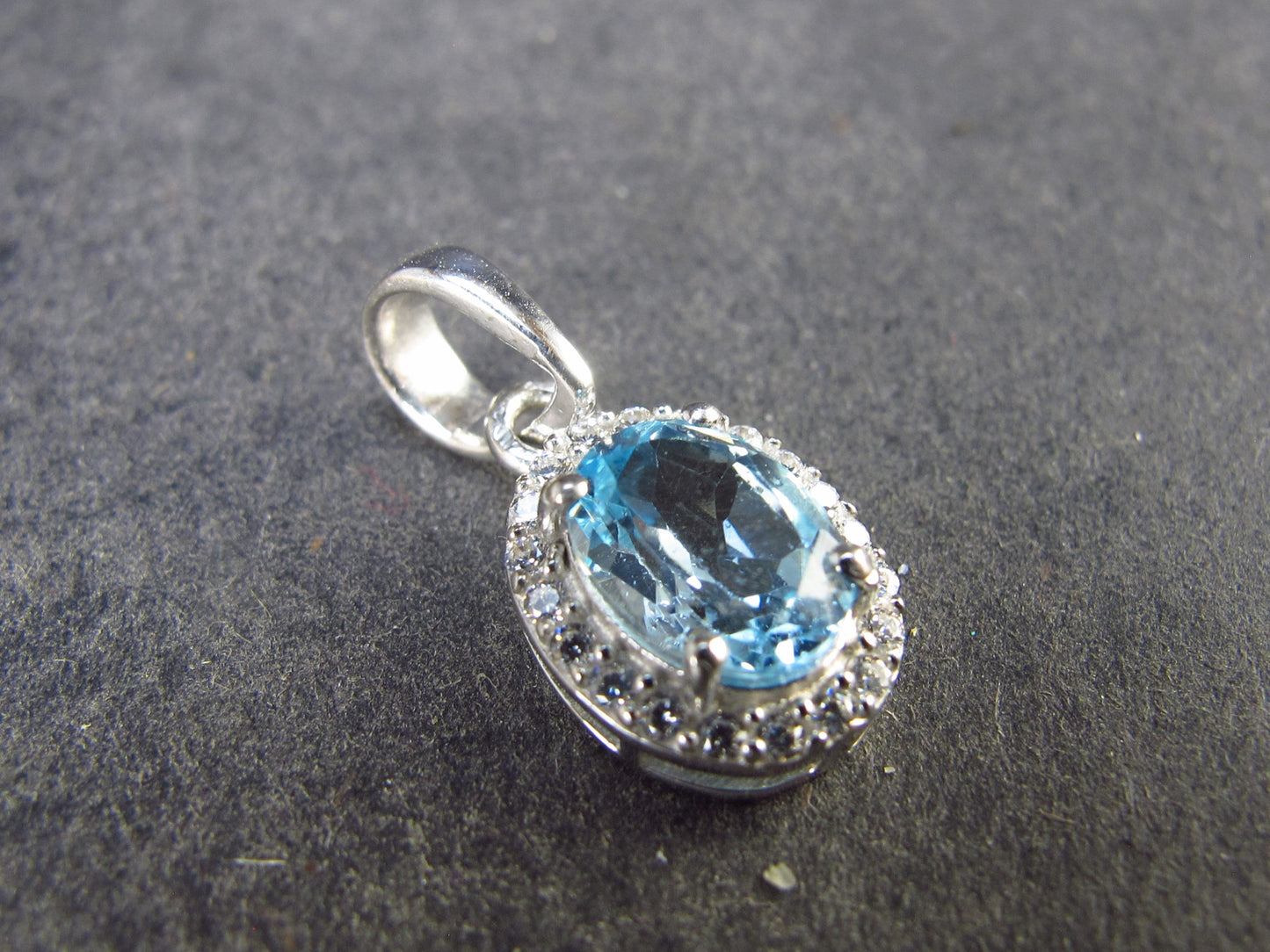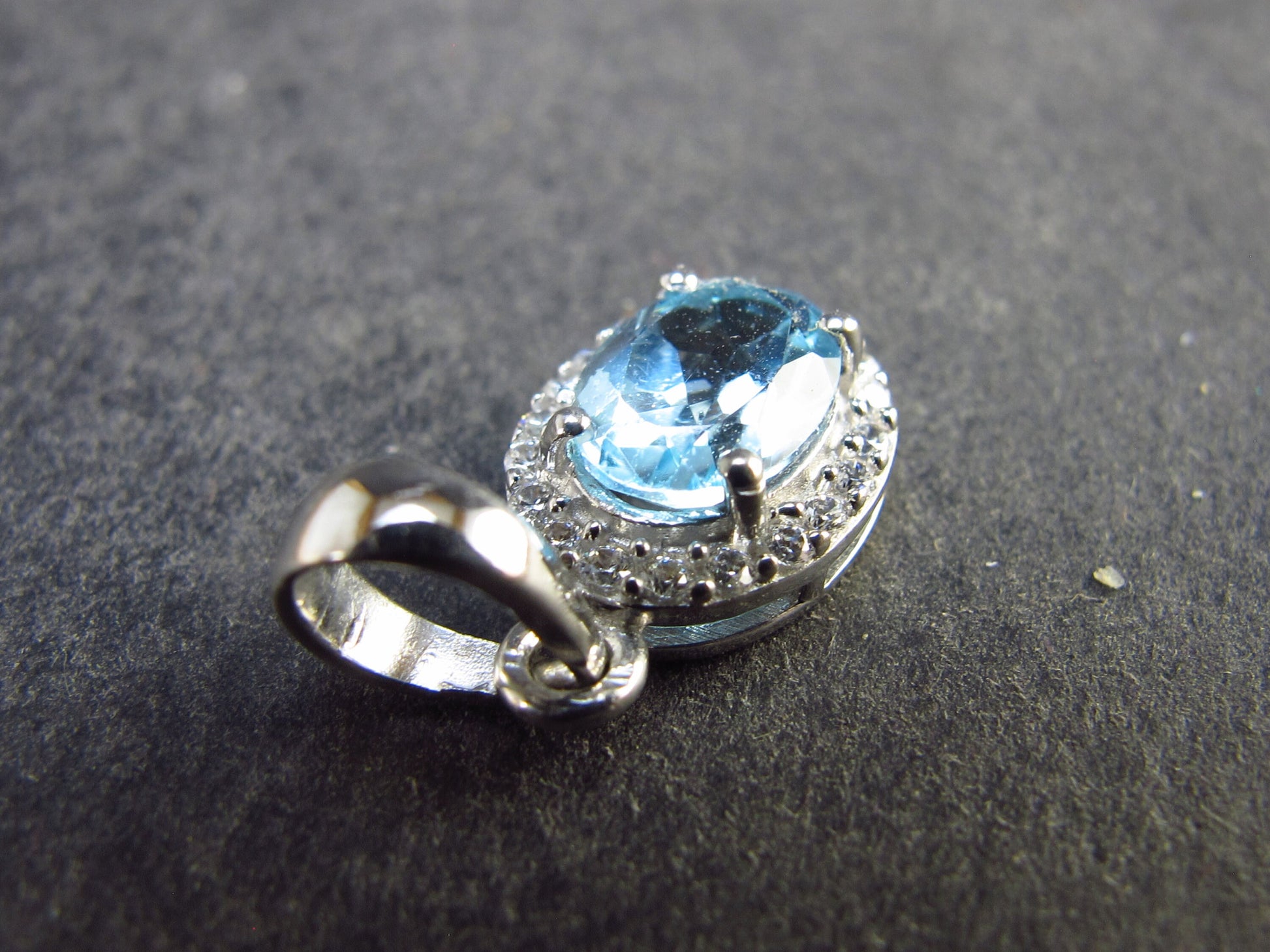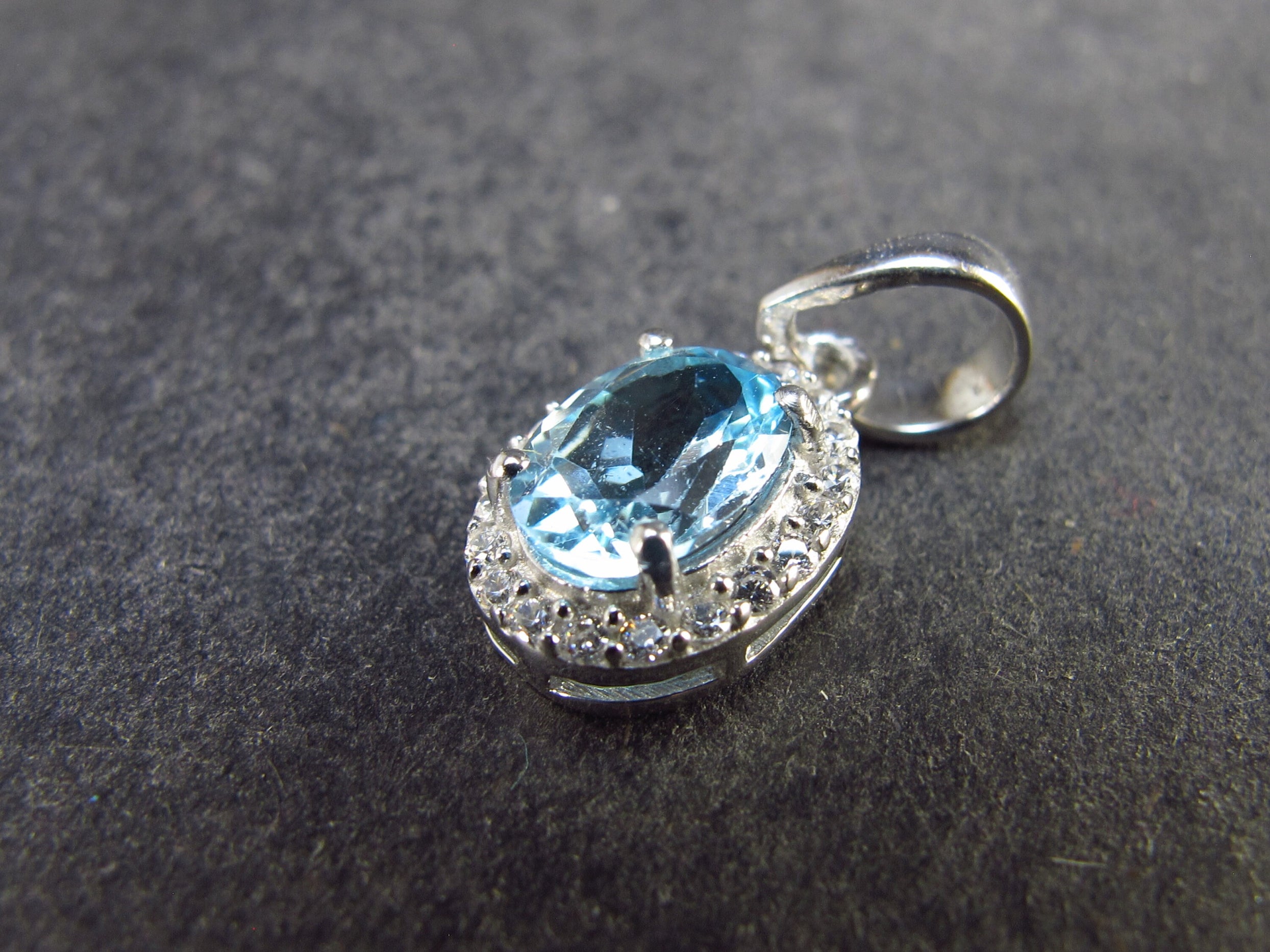 Elegant Solitaire Sky Blue Topaz sterling silver pendant with CZ. Stone is faceted and measures 8x6mm