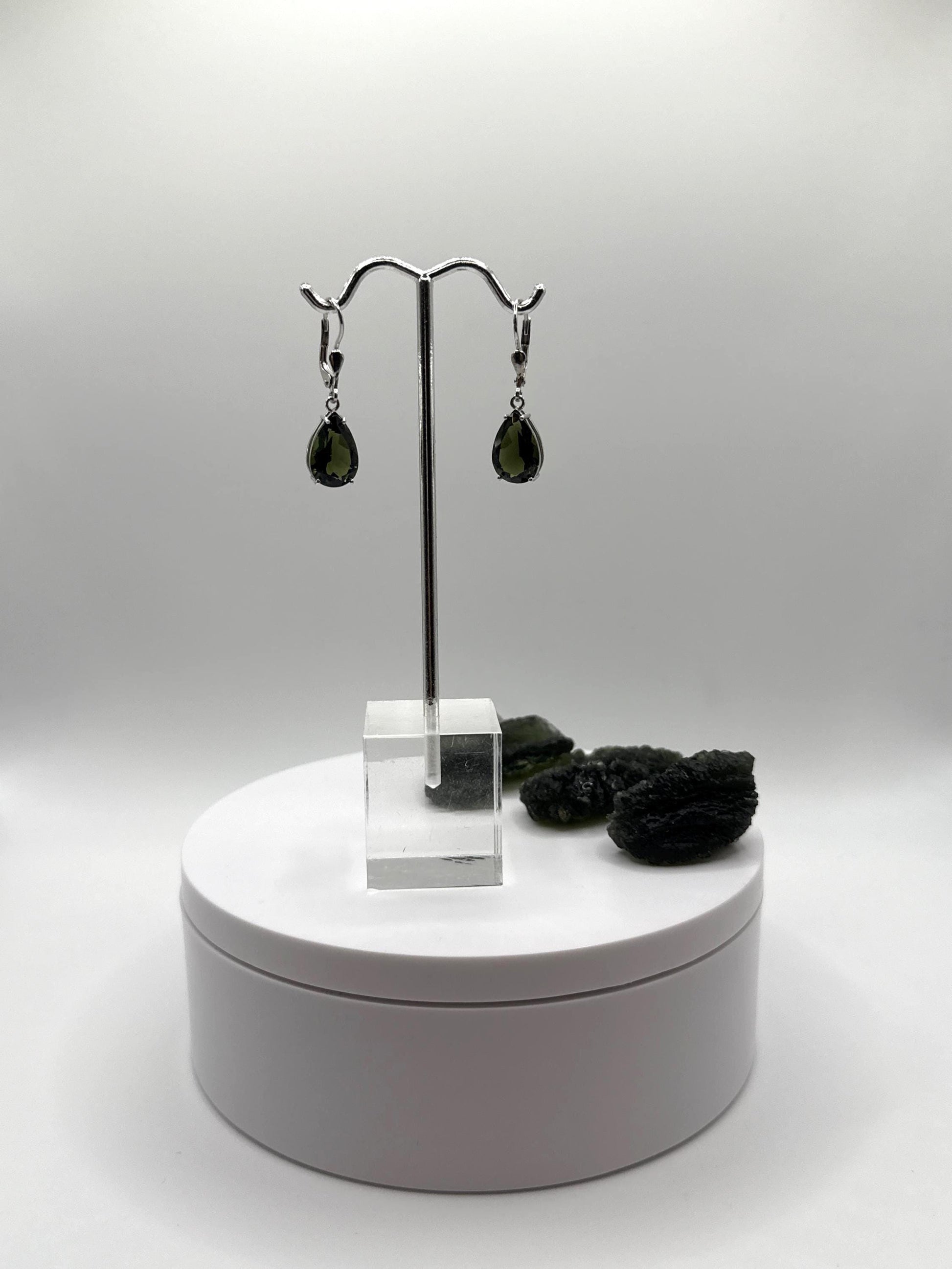 These elegant earrings feature teardrop-shaped Moldavite stones that dangle from silver-accented hooks. The soft sway and refined sparkle make them a beautiful choice for special occasions or everyday elegance.