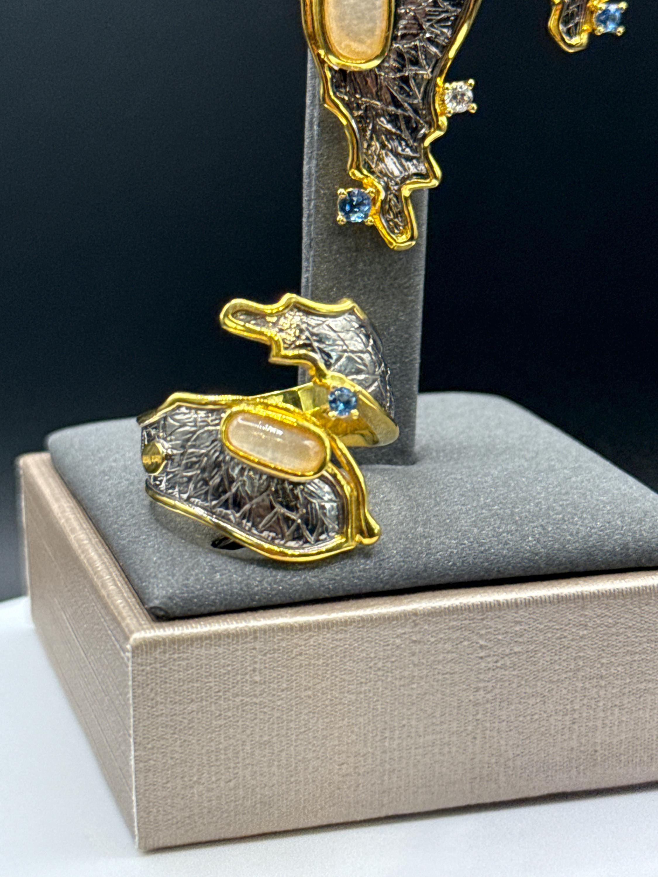 Design: Statement ring with the same sculptural style, textured metal, oval white centerpiece, and blue accent stone.