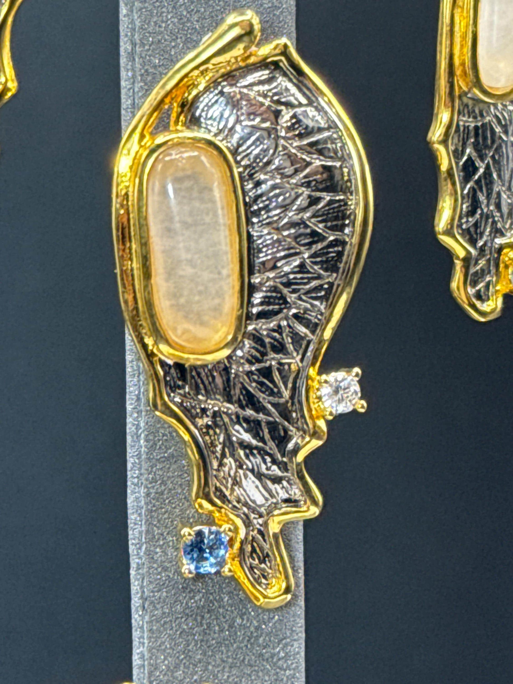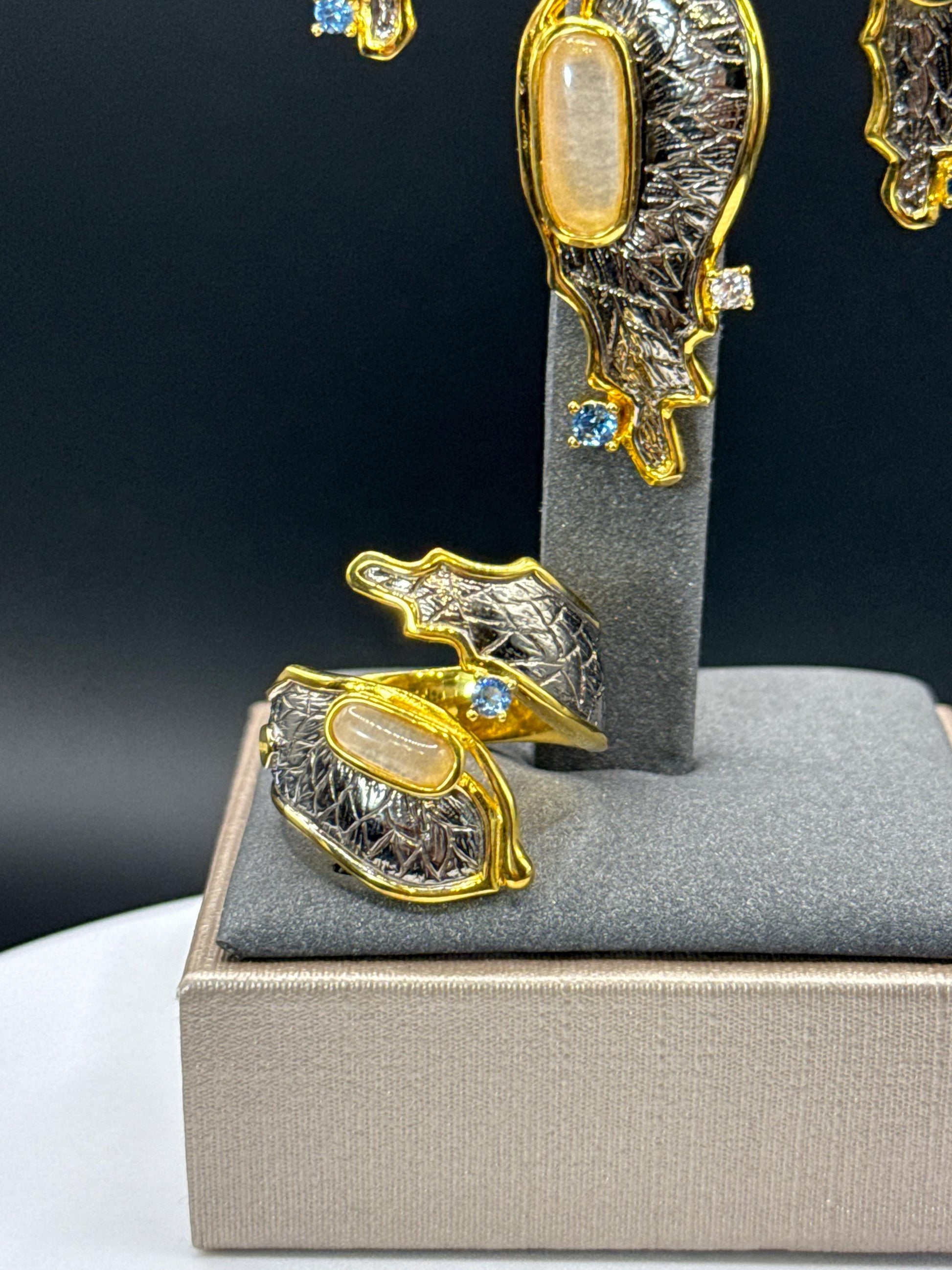 A unique handcrafted jewelry set featuring a pendant, ring, and earrings in a striking two-tone metal design. Each piece showcases a polished white stone framed in golden and oxidized silver textures, enriched with a sparkling blue accent stone. Bold, artistic, and luxurious - perfect for collectors and lovers of designer-style jewelry.