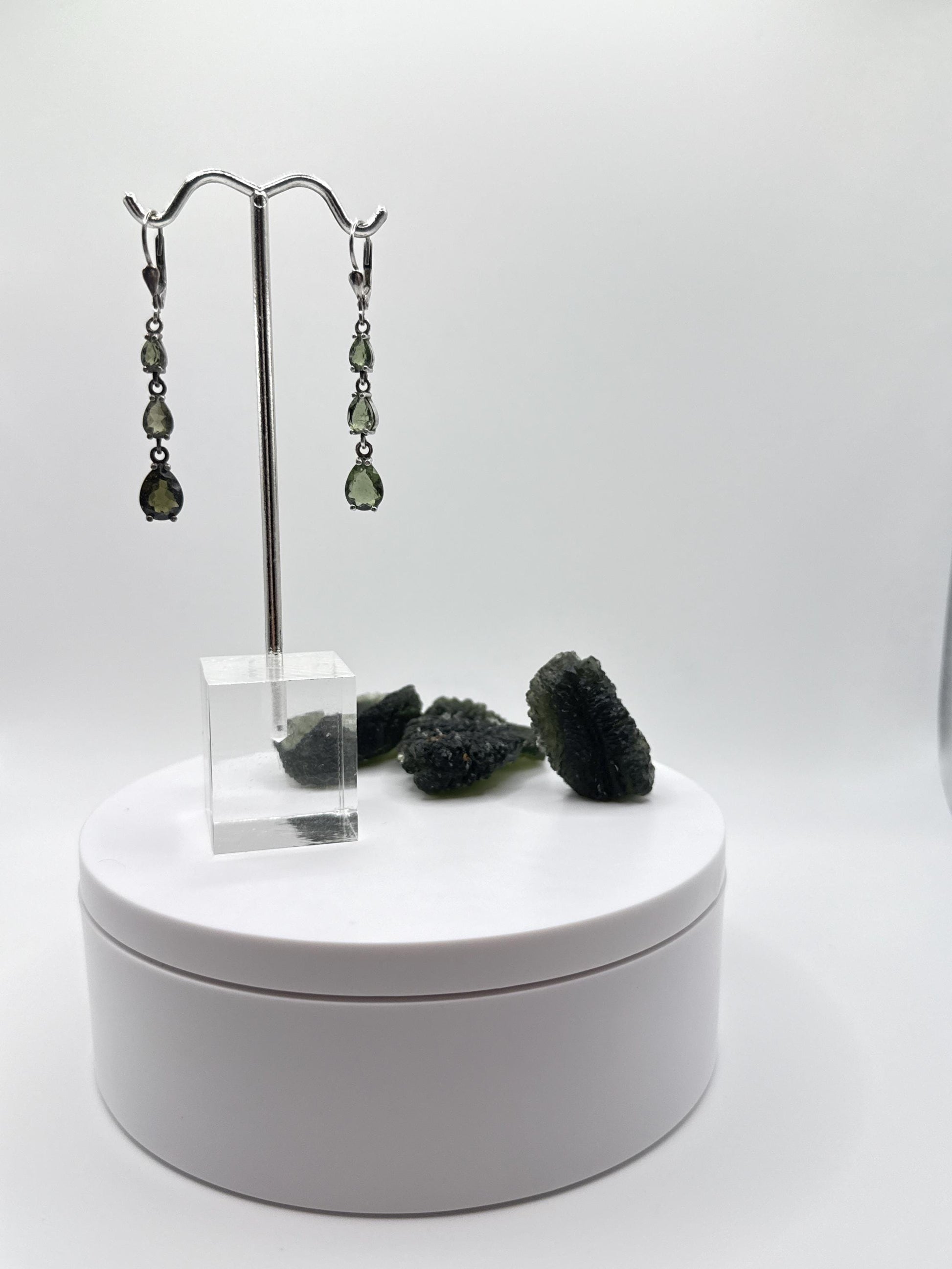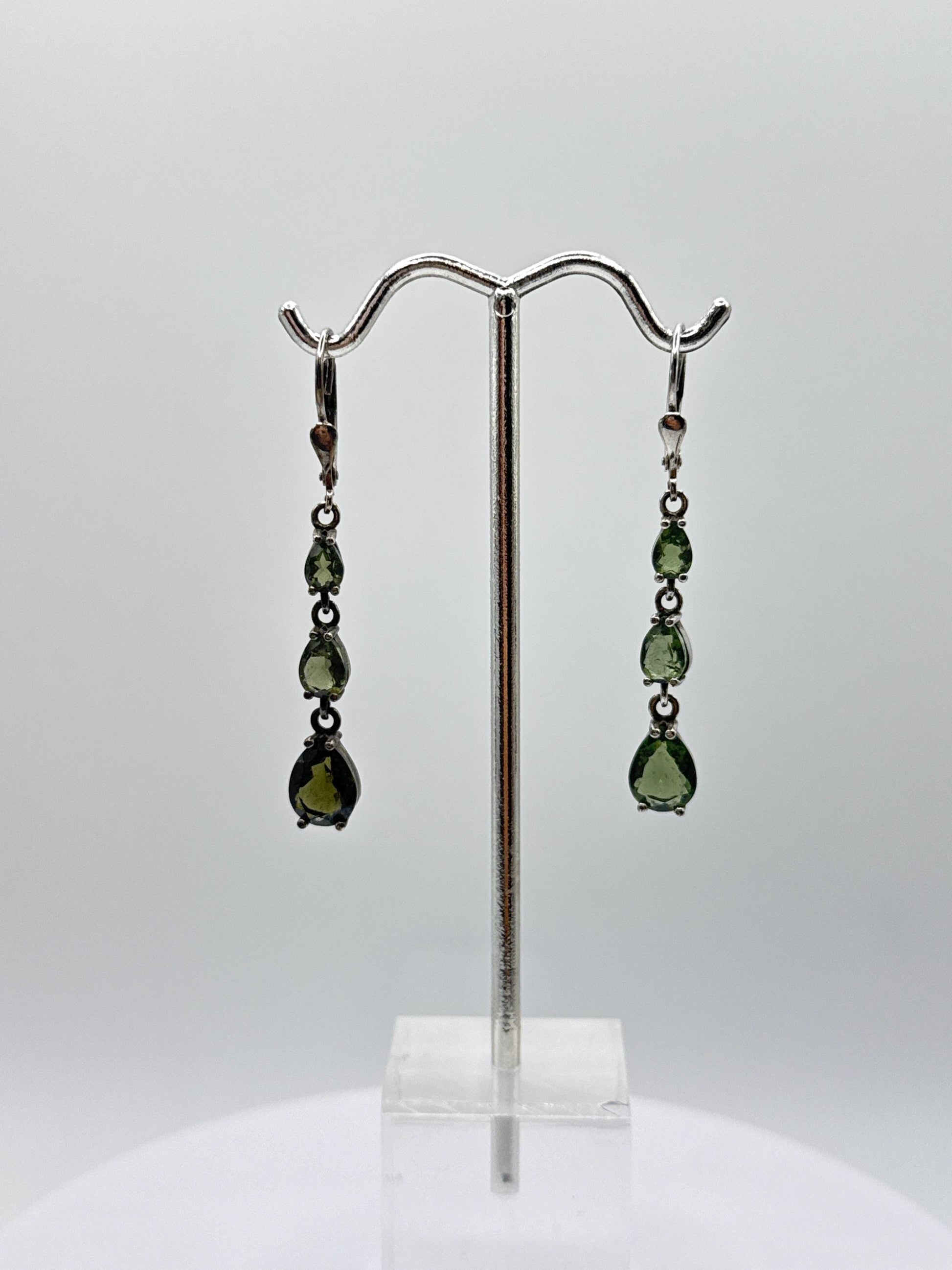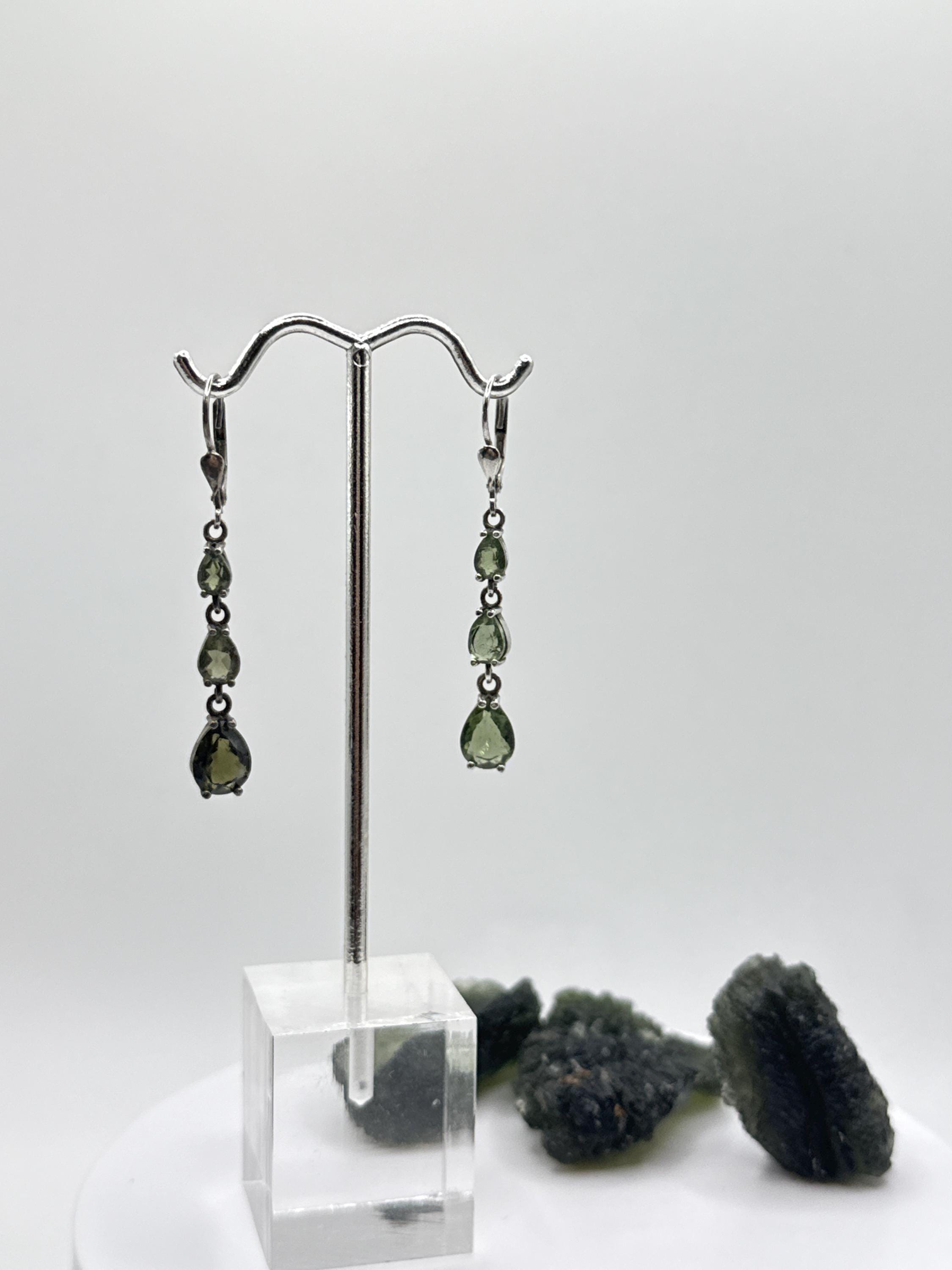 These elegant drop earrings feature three faceted Moldavite gemstones in a cascading design, set in sterling silver for a timeless and refined look. Moldavite, a rare green tektite from the Czech Republic formed over 15 million years ago by a meteorite impact, is cherished for its powerful transformative and high-vibrational energy. The faceted cuts enhance the stone's natural sparkle, making these earrings a perfect choice for special occasions or as a meaningful gift for crystal lovers and those who appreciate rare, fine gemstones.
