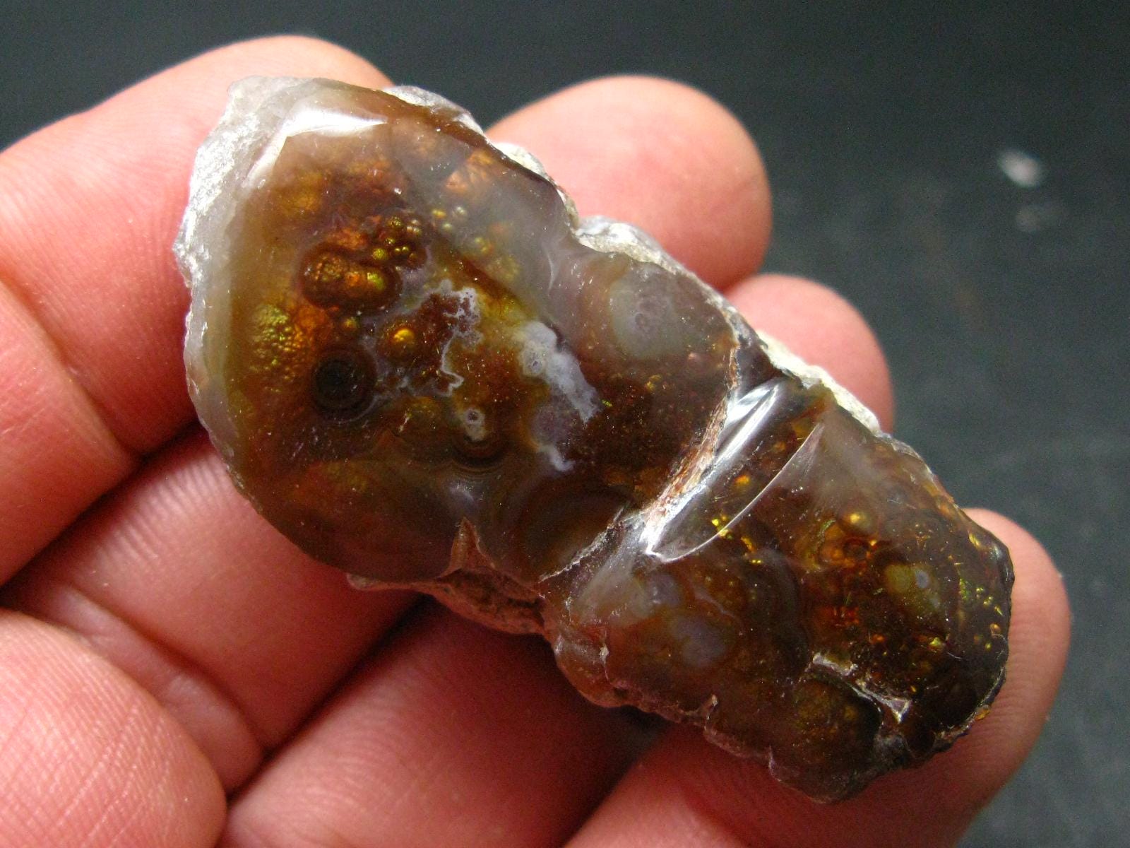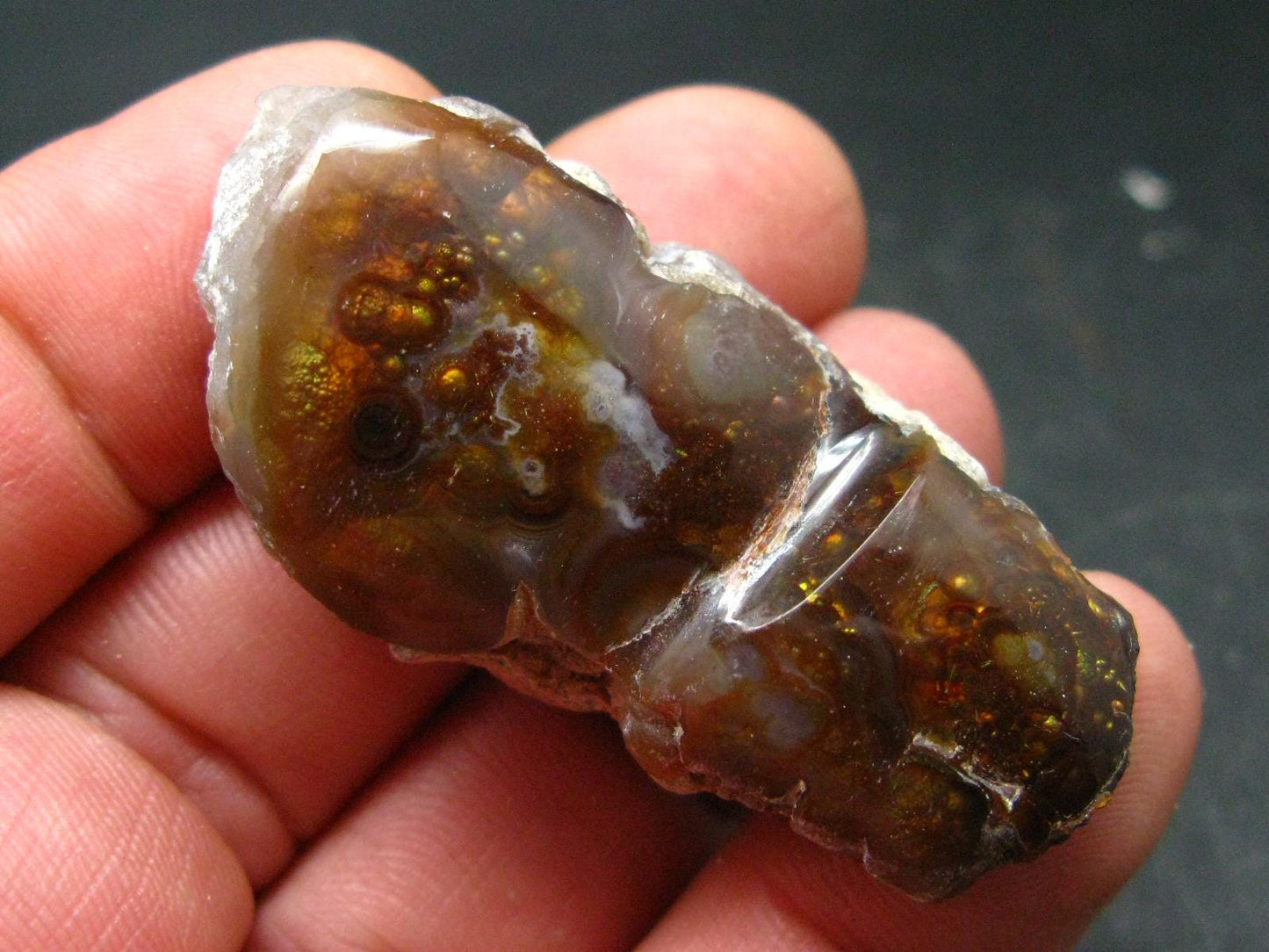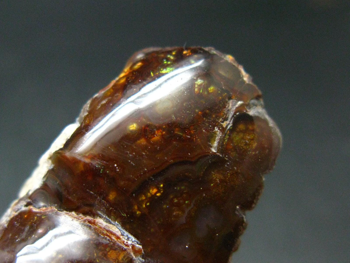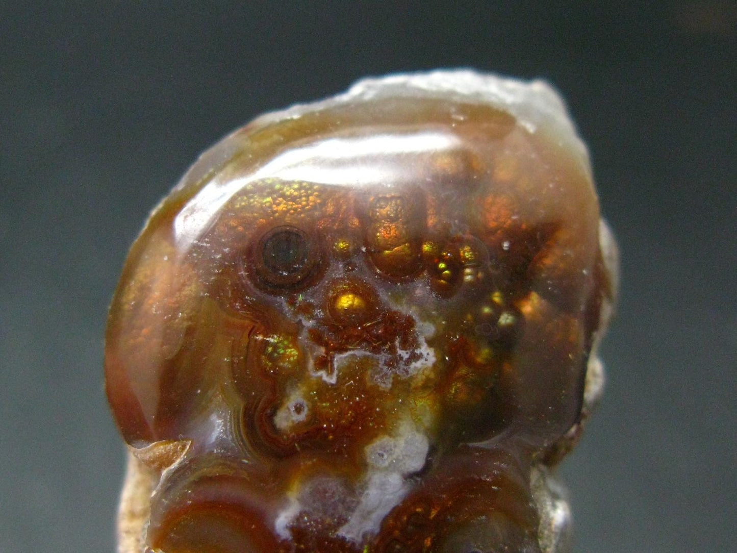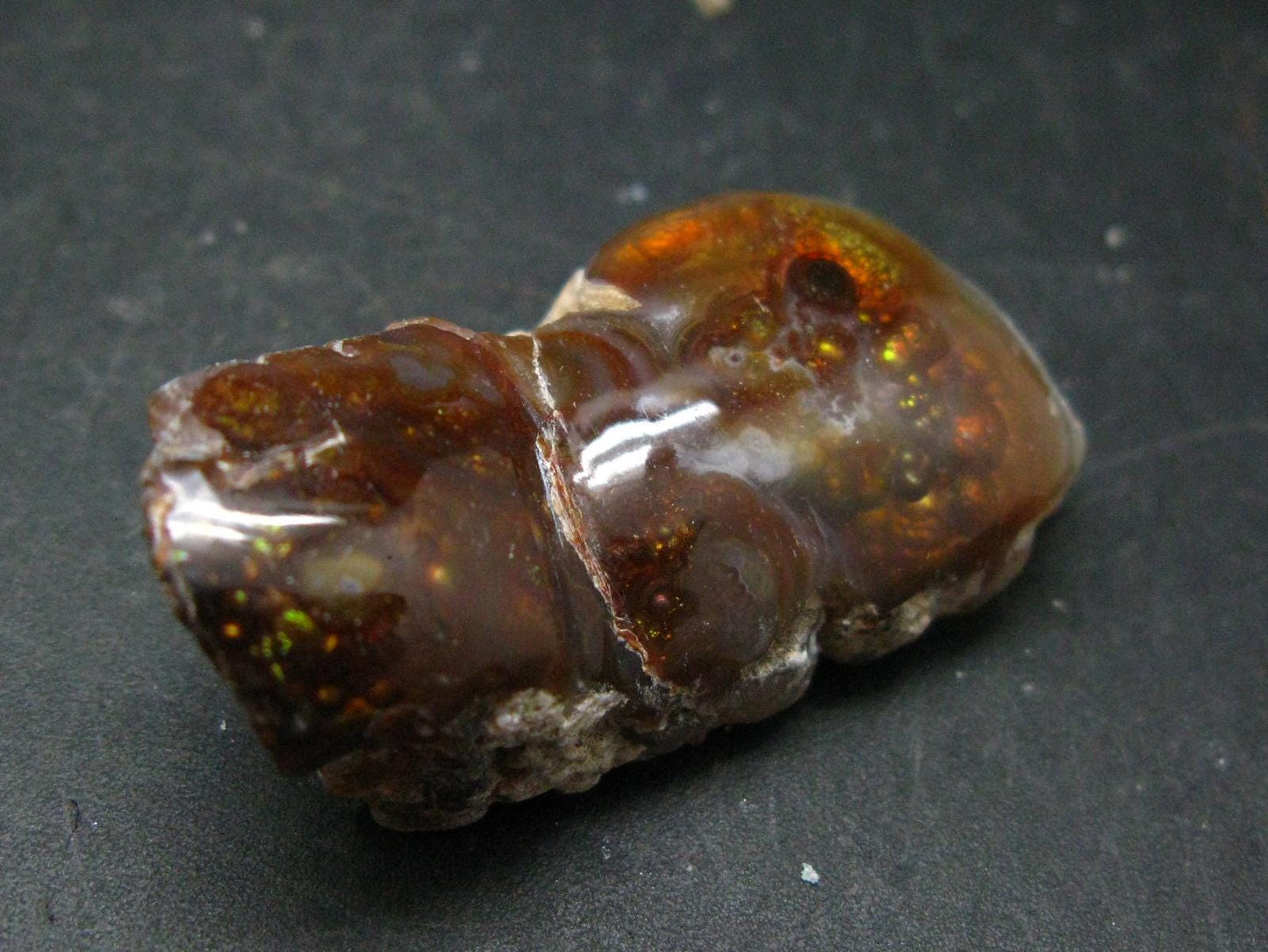A beautiful Fire Agate polished crystal with fine rainbow colors from Mexico.