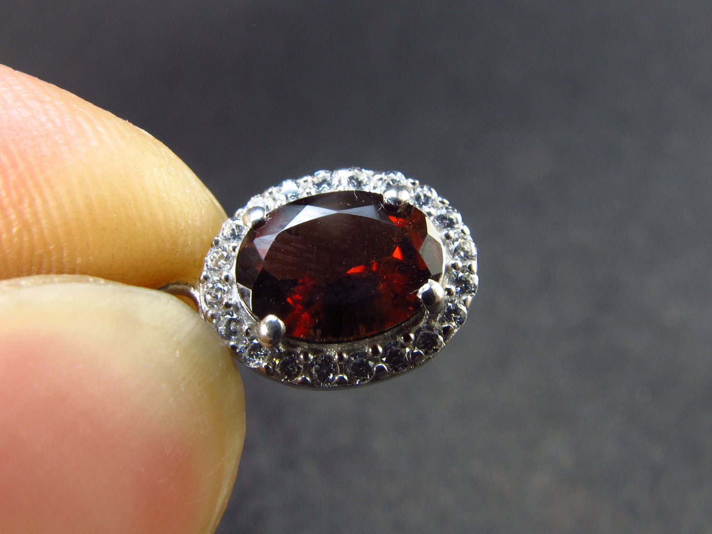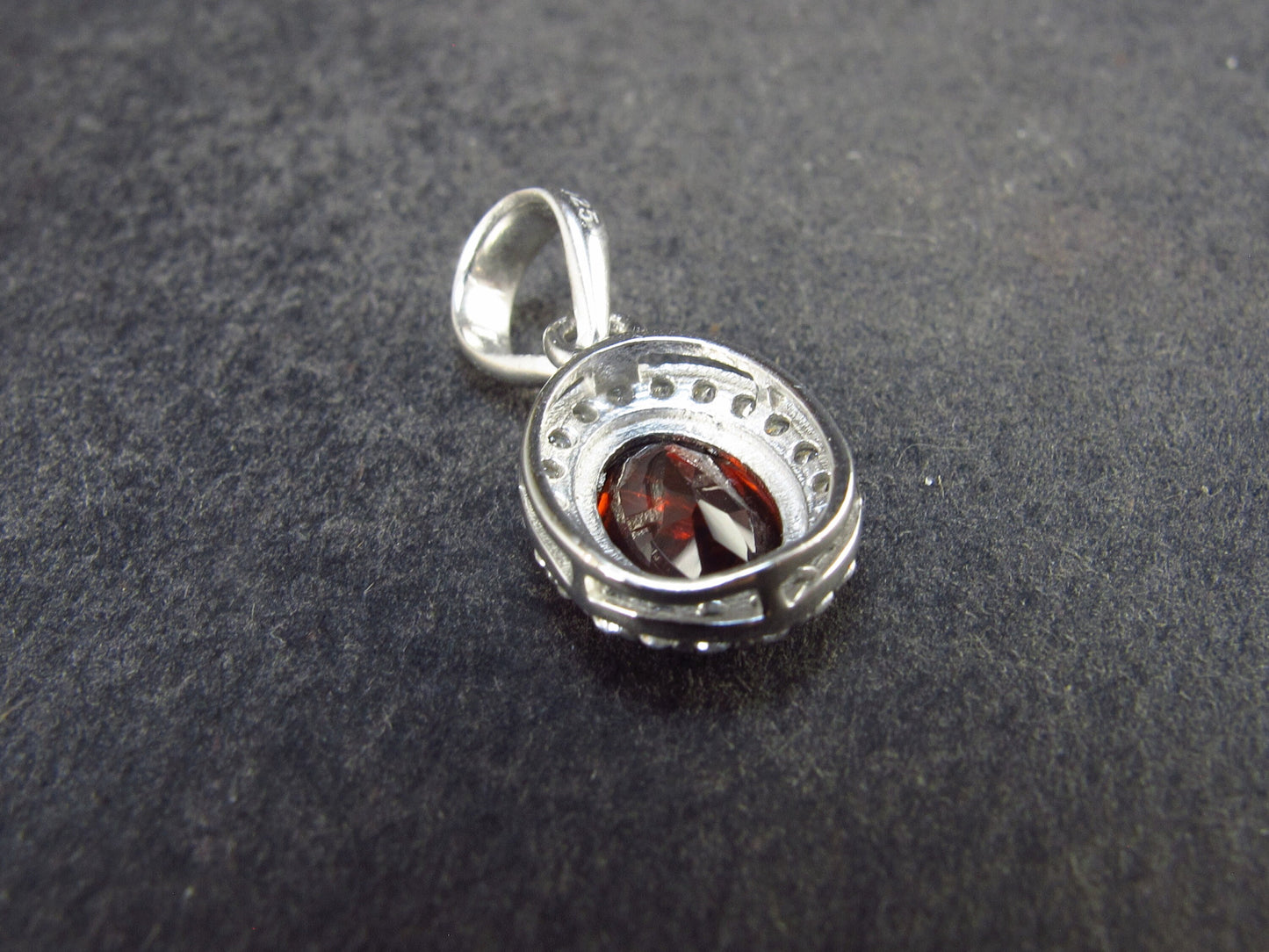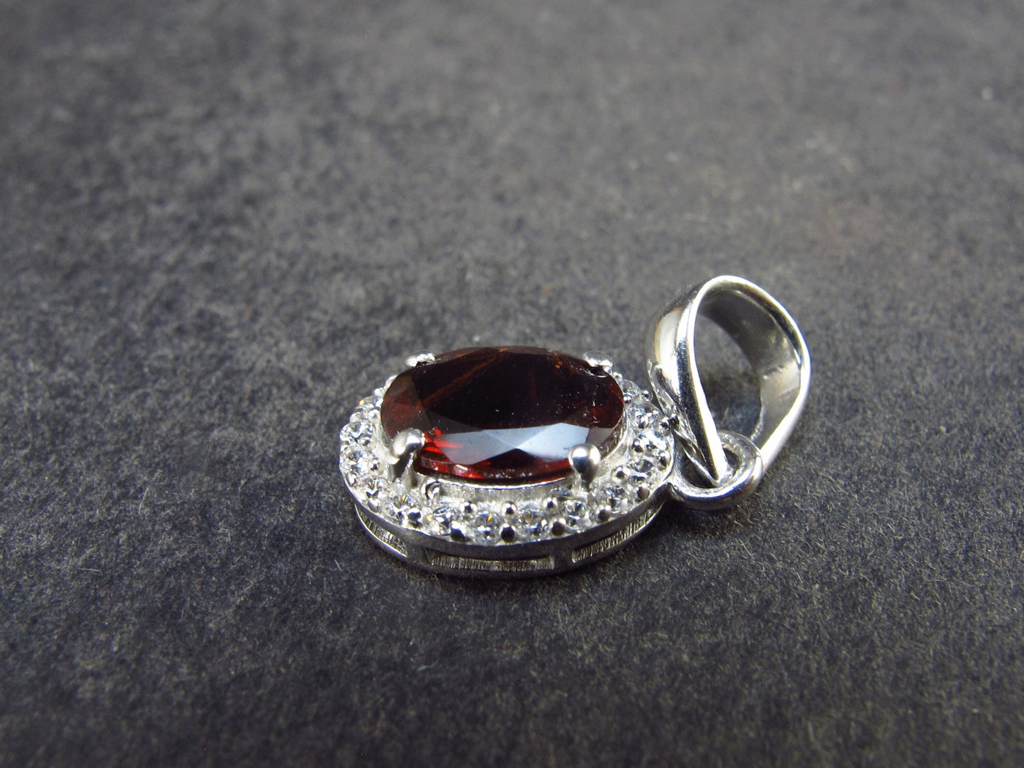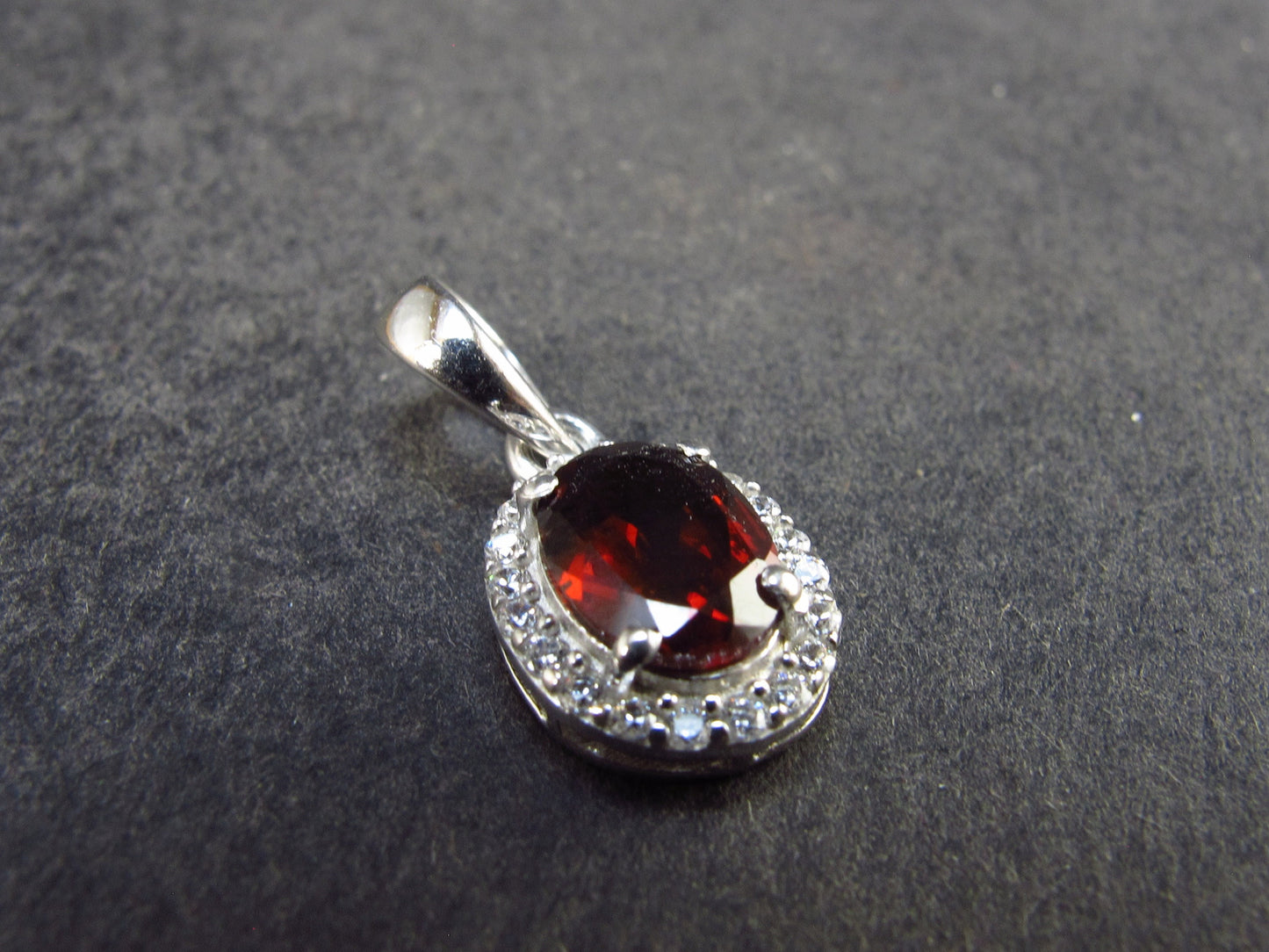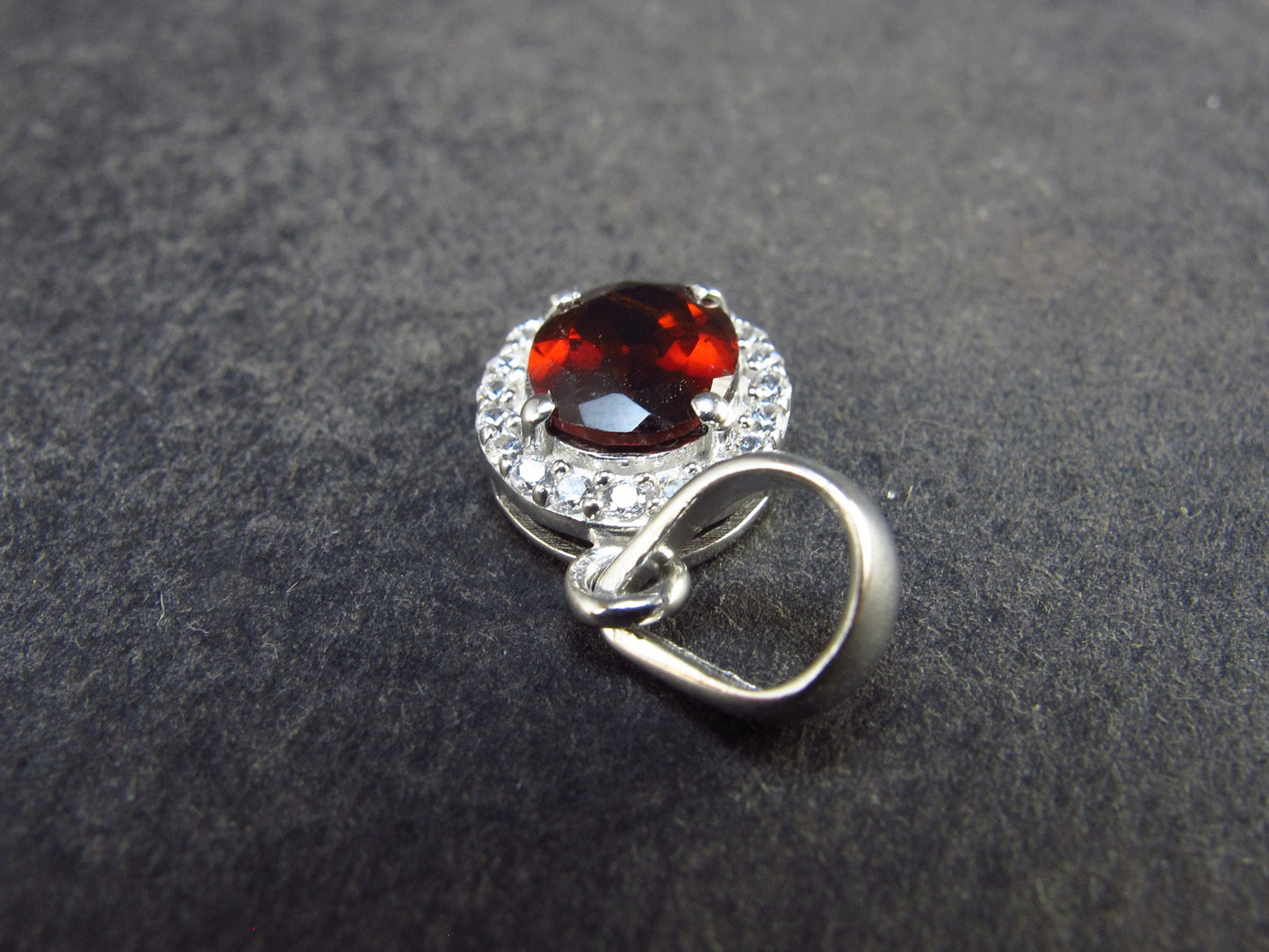A fine genuine faceted red Almandine Garnet set in sterling silver pendant with CZ.