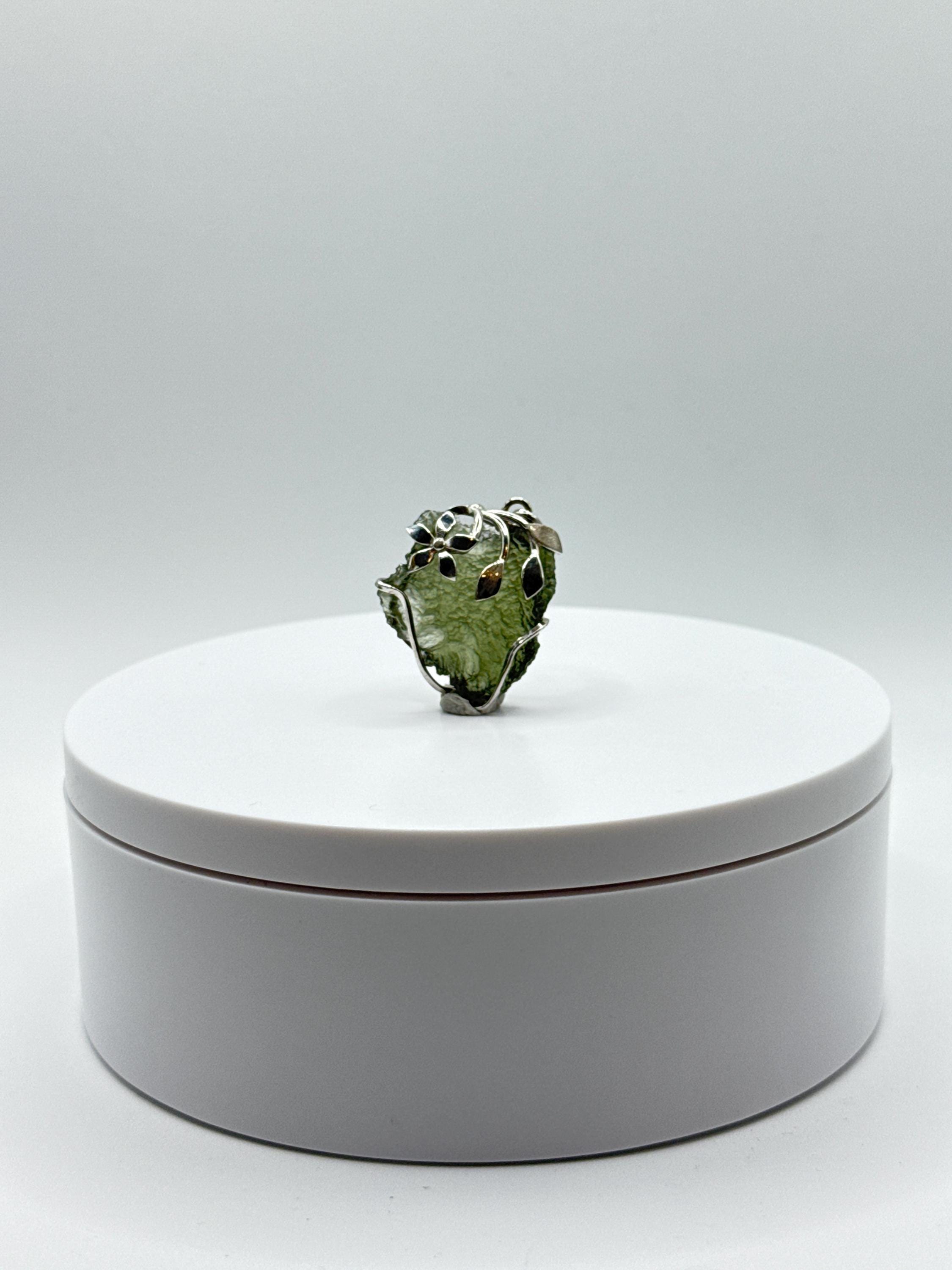 This striking Moldavite chunk pendant showcases a raw piece of Moldavite, set in a beautiful sterling silver design. The natural, unpolished texture of the Moldavite is enhanced by delicate silver leaves and flowers that elegantly wrap around the stone, creating a harmonious fusion of nature and artistry. The organic design reflects the unique beauty of the gemstone, making it a one-of-a-kind piece perfect for those who appreciate both the rawness and refinement of natural materials.