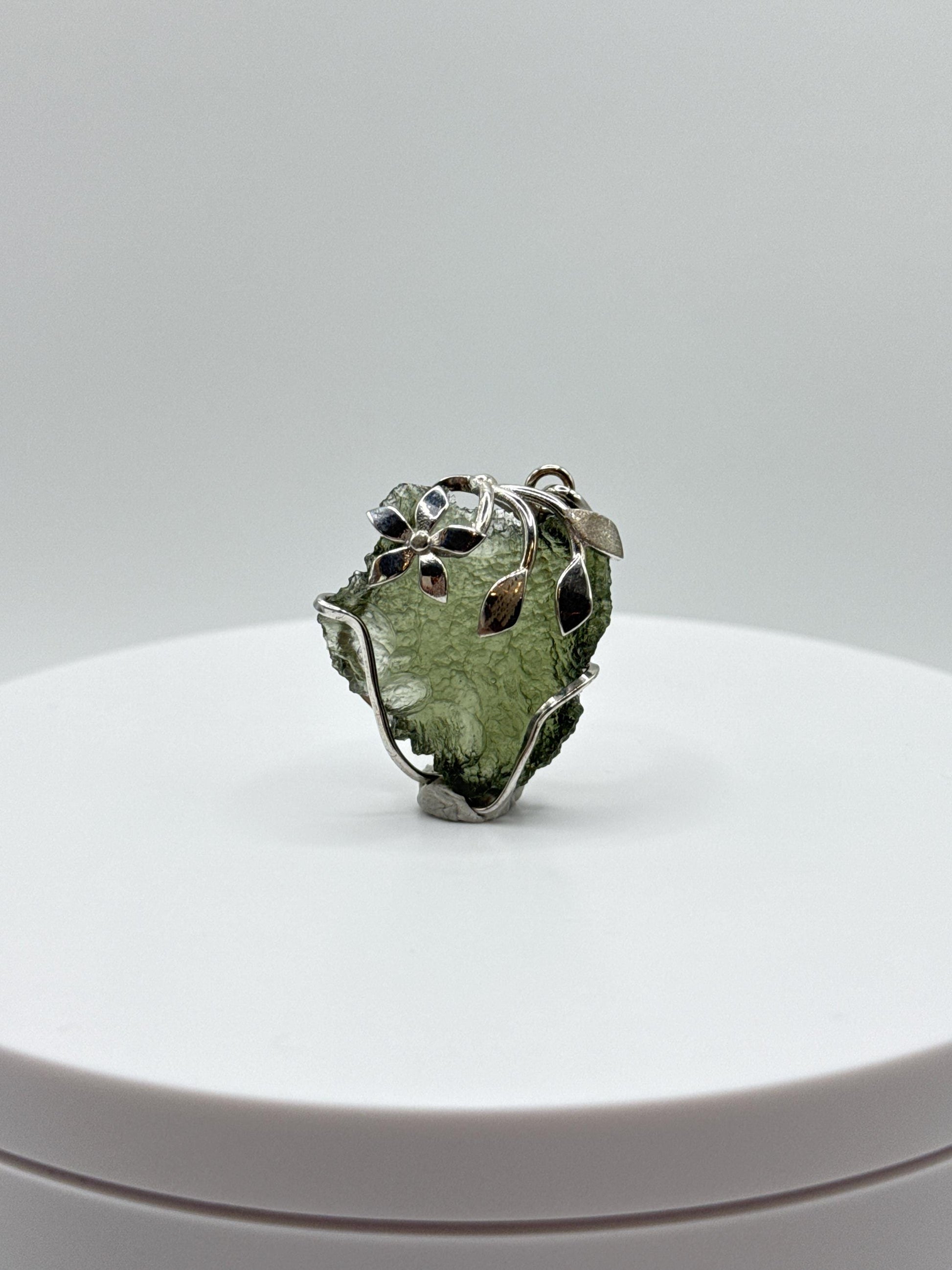 Moldavite Chunk Pendant with Silver Leaf & Flower Accents - Unique Natural Gemstone Pendant - 6.48 Grams