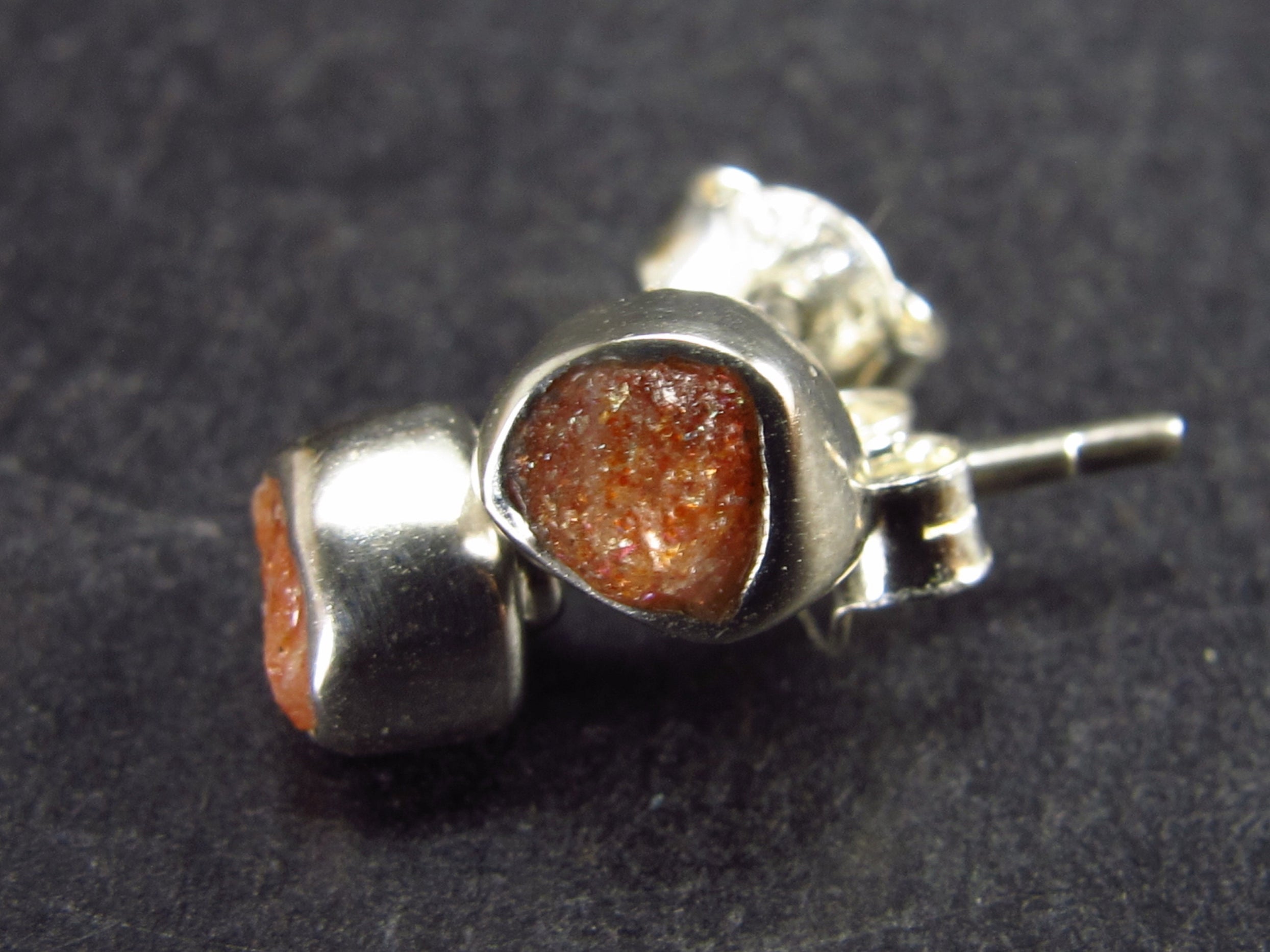 This is a very nice raw Sunstone (plagioclase feldspar that has multicolor glitter which is caused by light reflections from tiny hematite or goethite platelets) studs earrings. It is set in silver stamped 925.