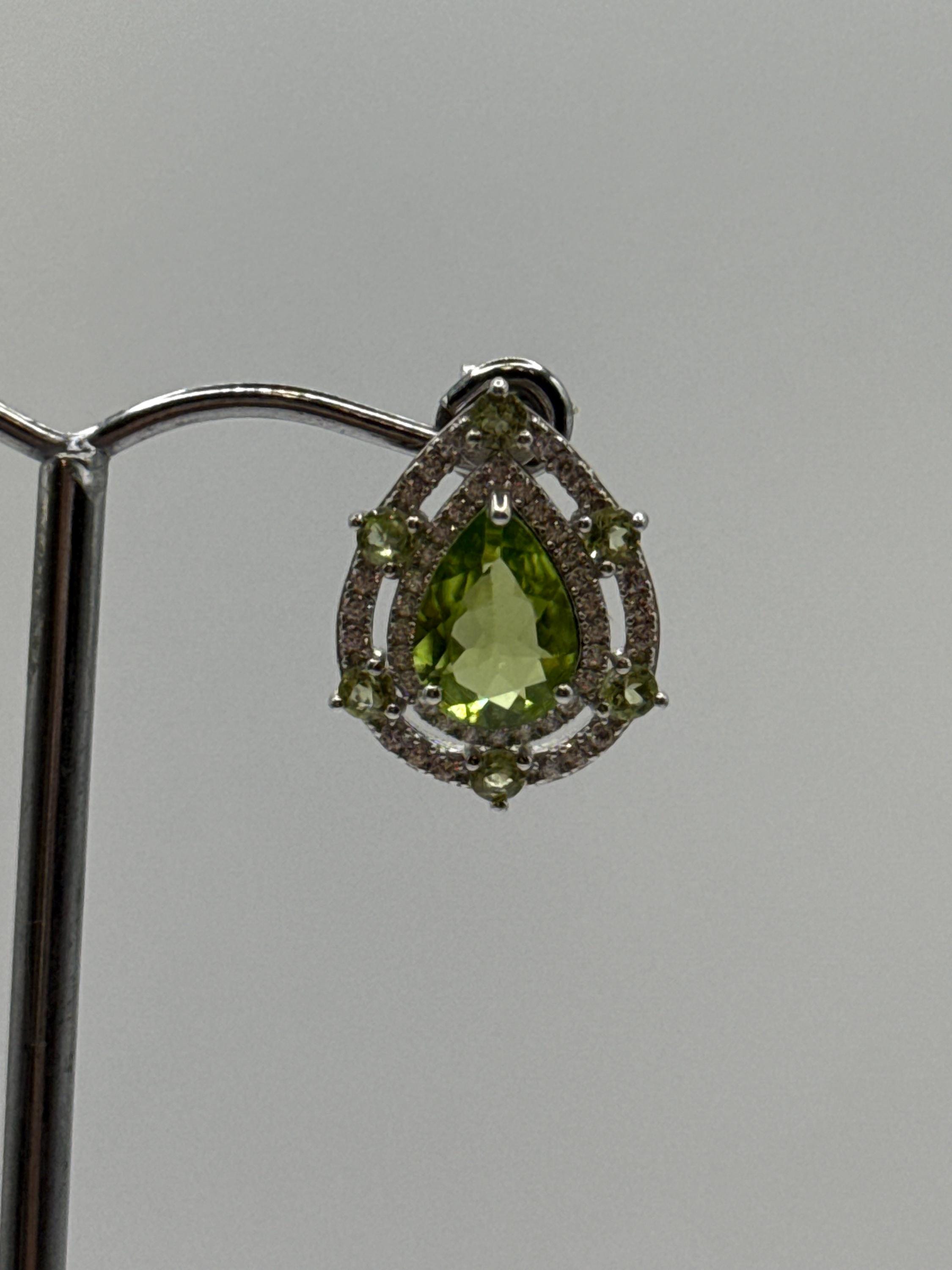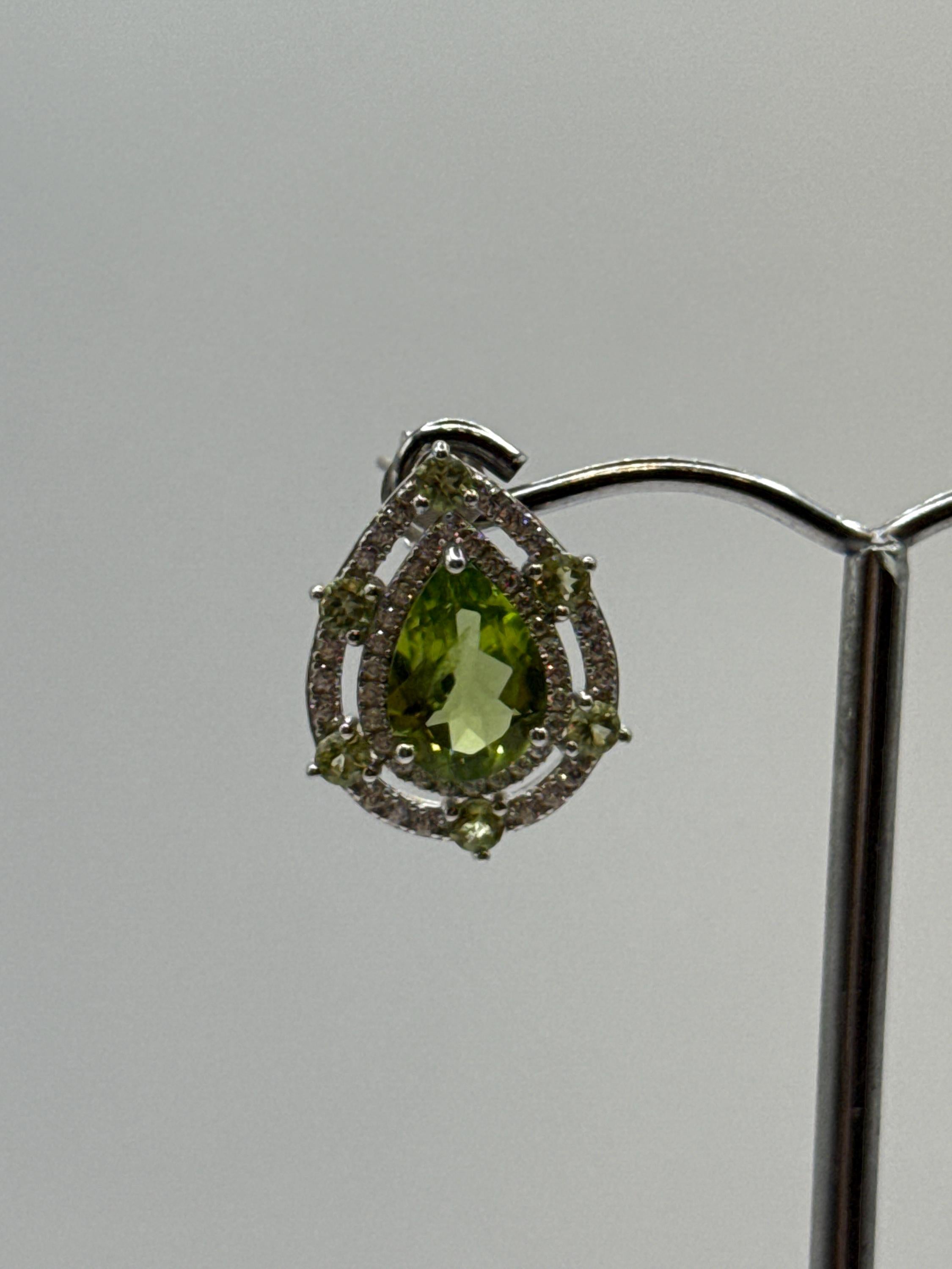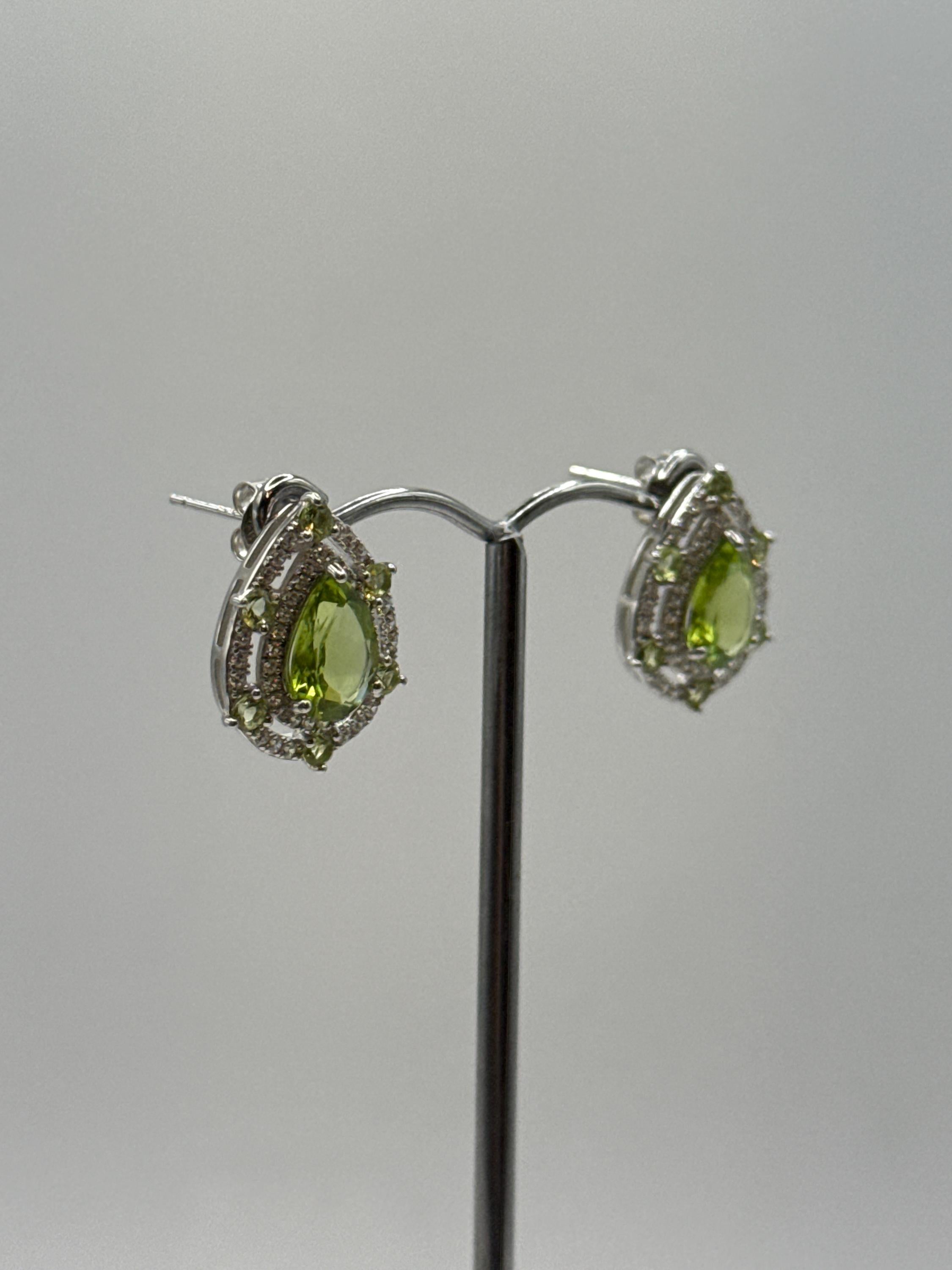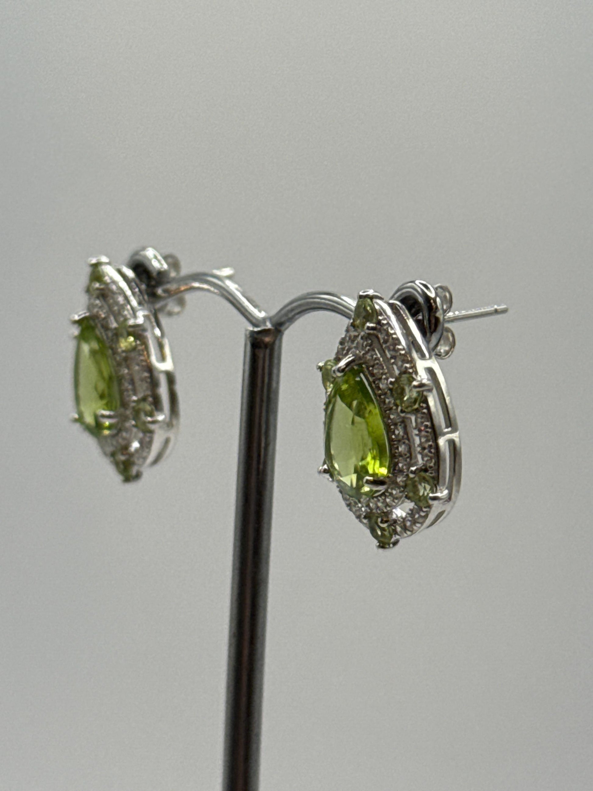 These peridot earrings feature vibrant pear-cut green peridot gemstones surrounded by sparkling accents in sterling silver. The elegant design enhances the brilliance of the peridot, creating a timeless and eye-catching pair of earrings. Perfect for adding a touch of sophistication to any outfit, these earrings are versatile enough for daily wear yet refined for special occasions. Known as the stone of joy and renewal, peridot is also the August birthstone, making these earrings a meaningful gift or a stunning addition to your jewelry collection.