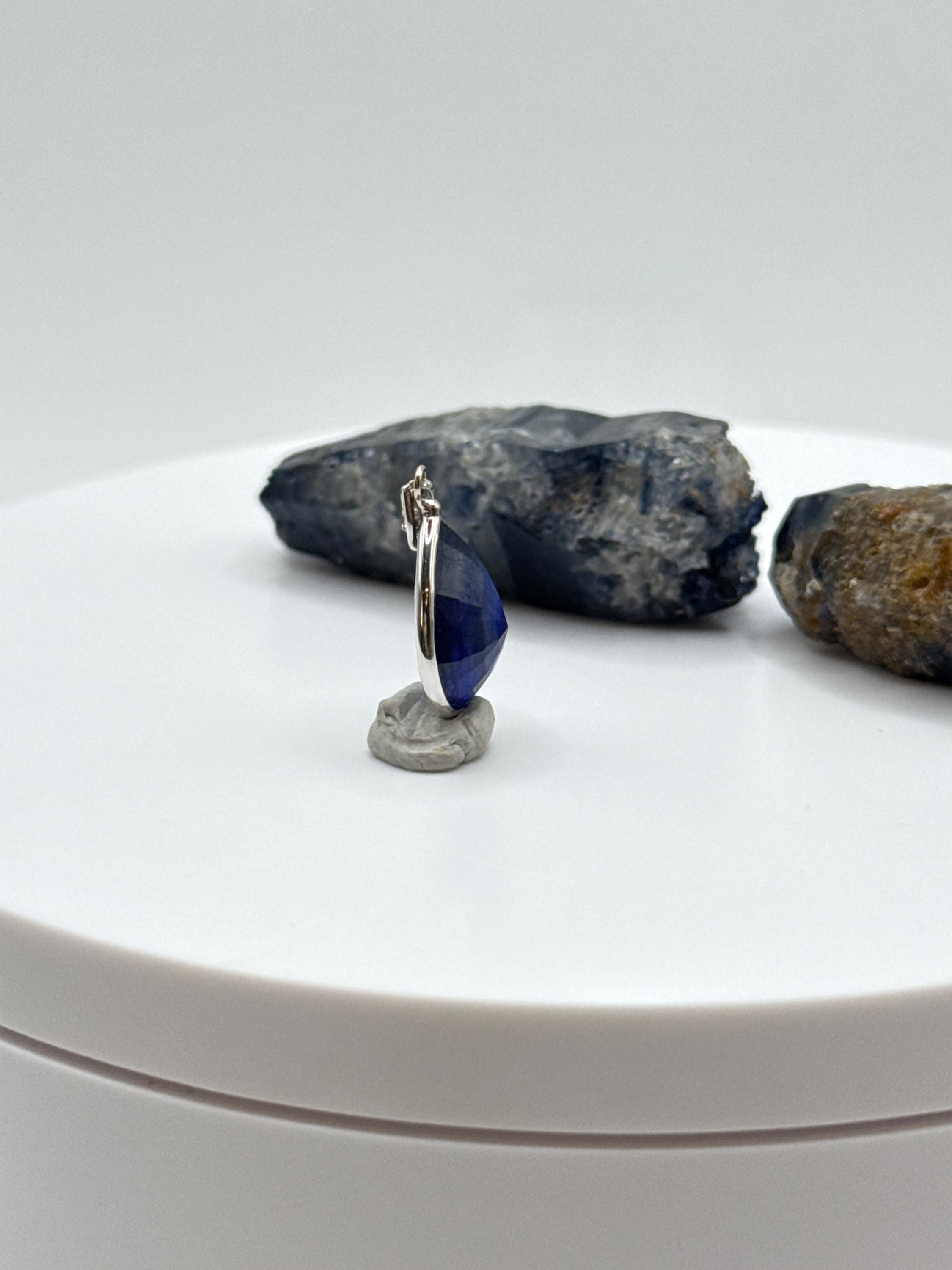 This pear-shaped sapphire pendant features a natural deep blue cabochon sapphire set in a sleek sterling silver bezel. The polished finish highlights the natural beauty and unique inclusions of the sapphire, giving the piece an earthy yet elegant charm. Known as the stone of wisdom and protection, sapphire is also the September birthstone, making this pendant a meaningful gift for birthdays, anniversaries, or a distinctive addition to your jewelry collection.