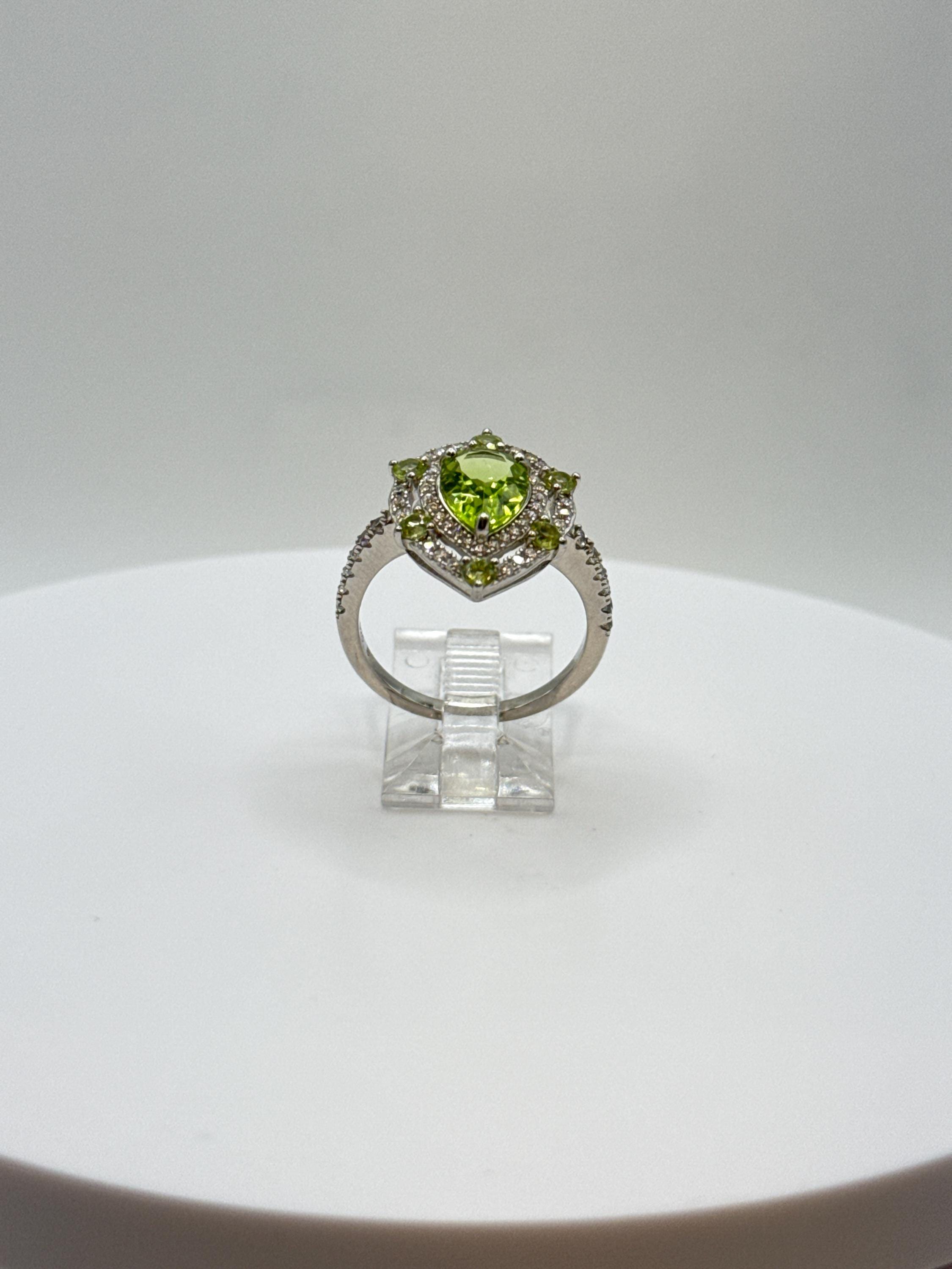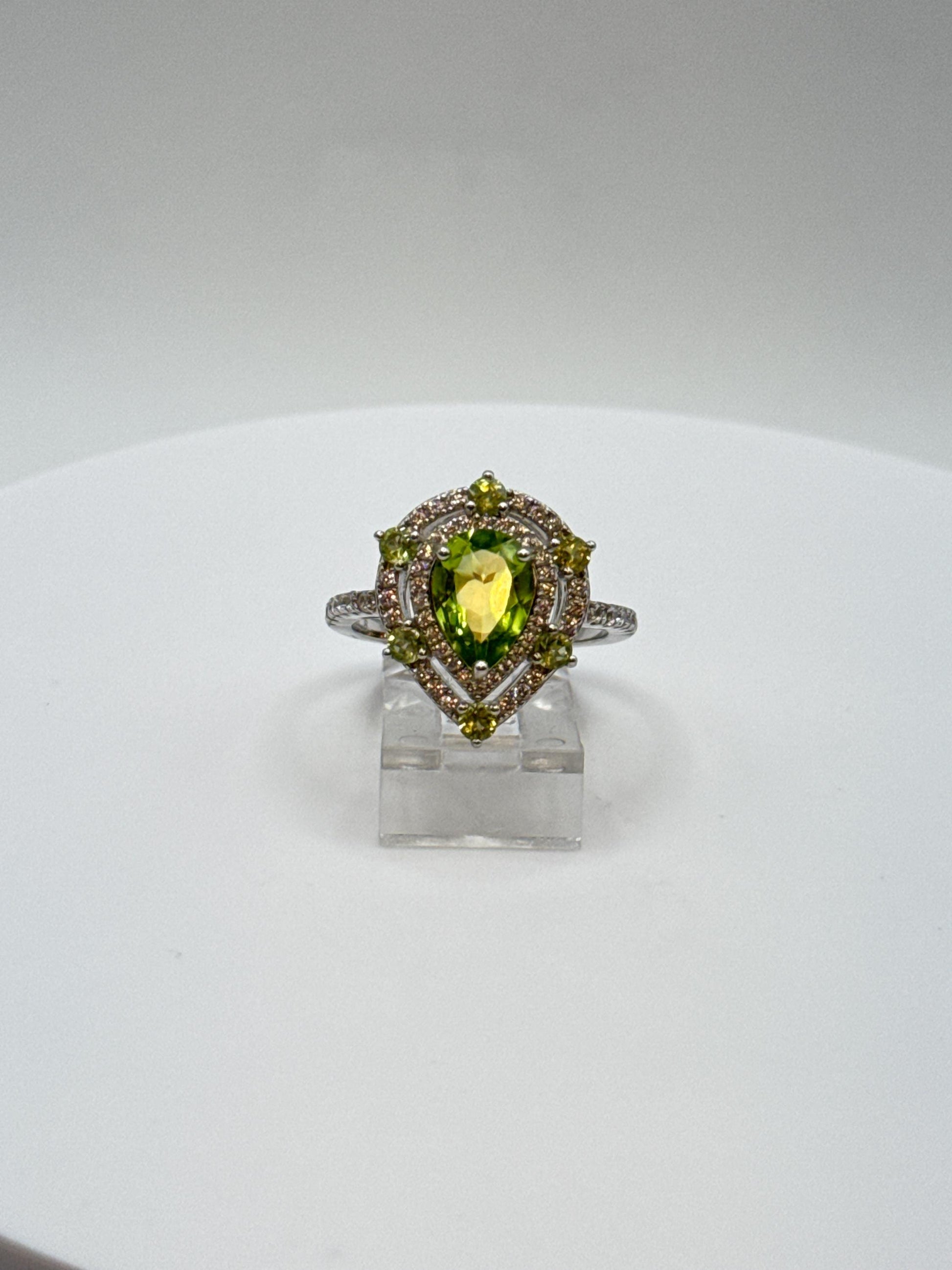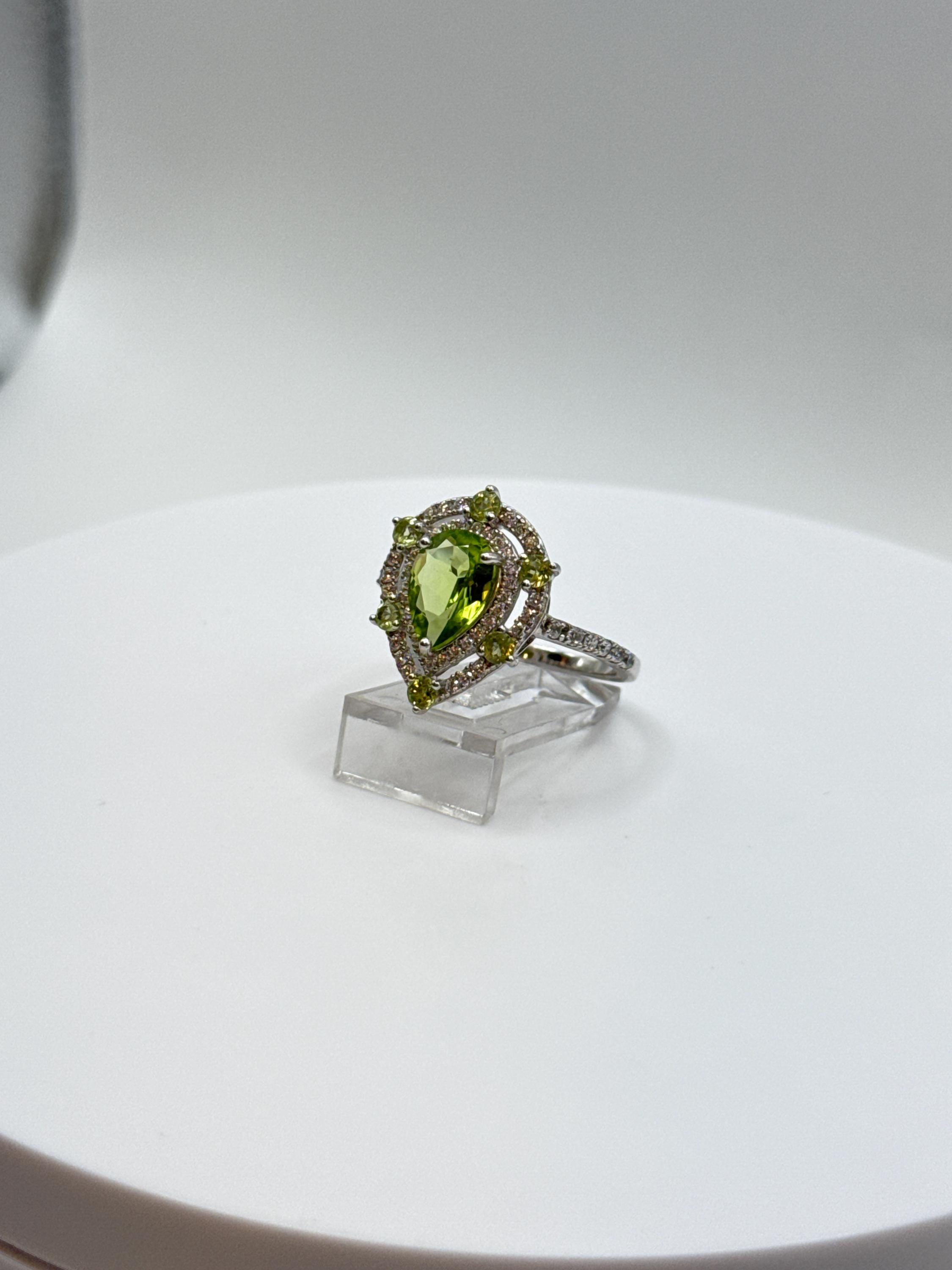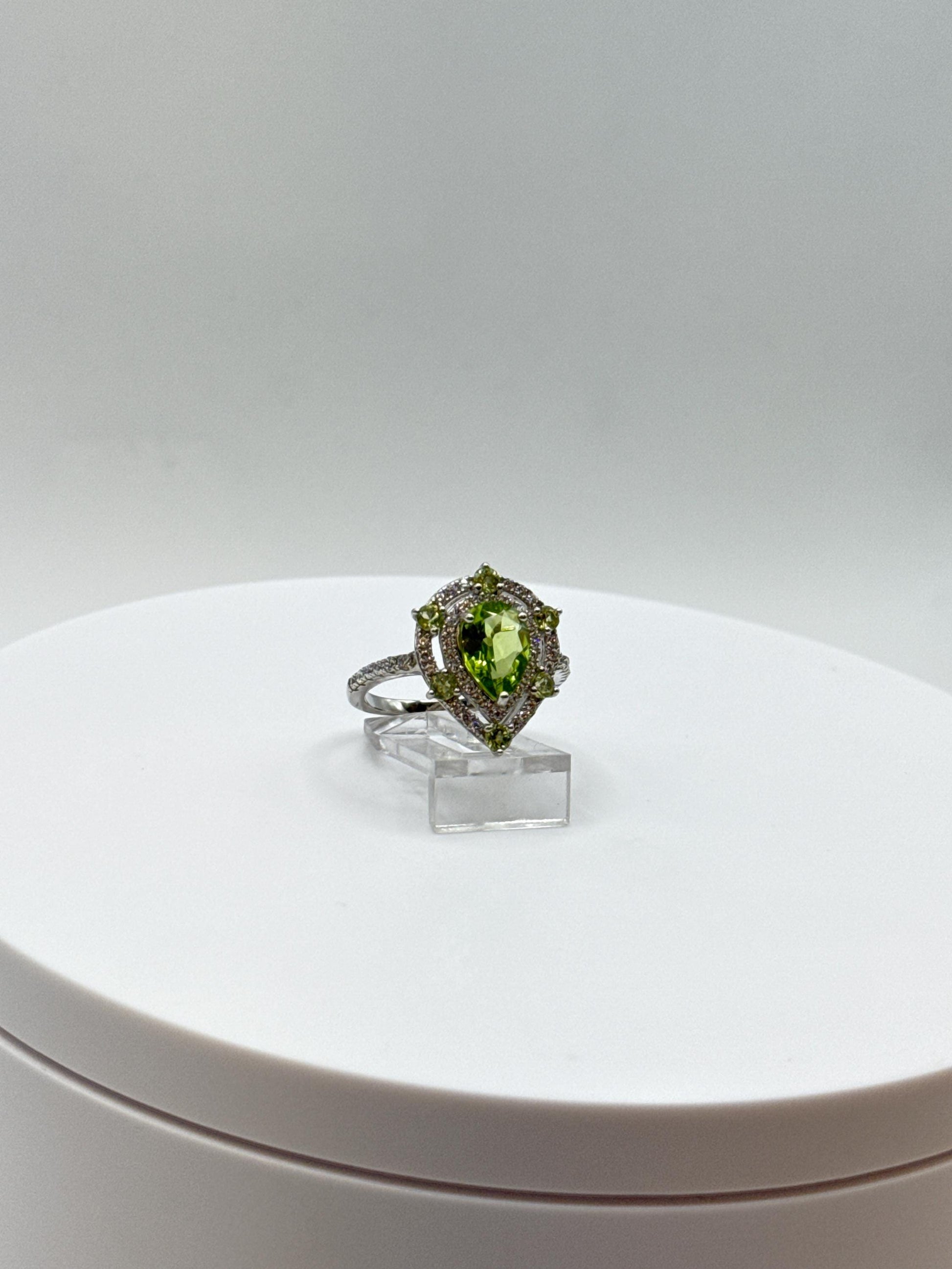This stunning halo ring features a natural pear-shaped peridot surrounded by sparkling accent stones, creating a radiant double-halo design. Set in high-quality sterling silver, the vivid green gemstone shines with freshness and vitality - a true statement of elegance and grace.
