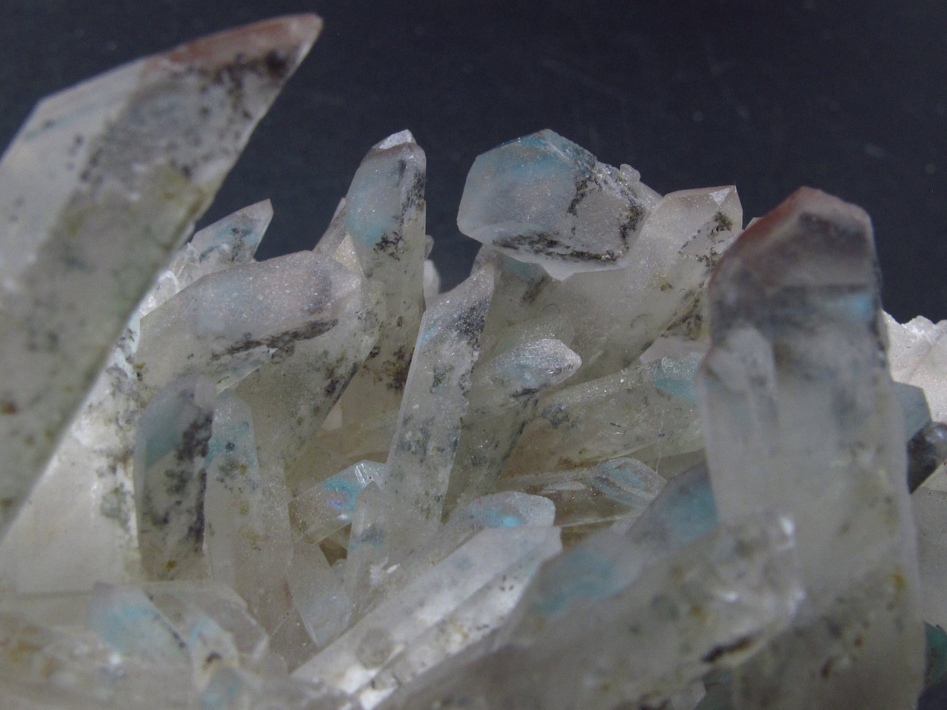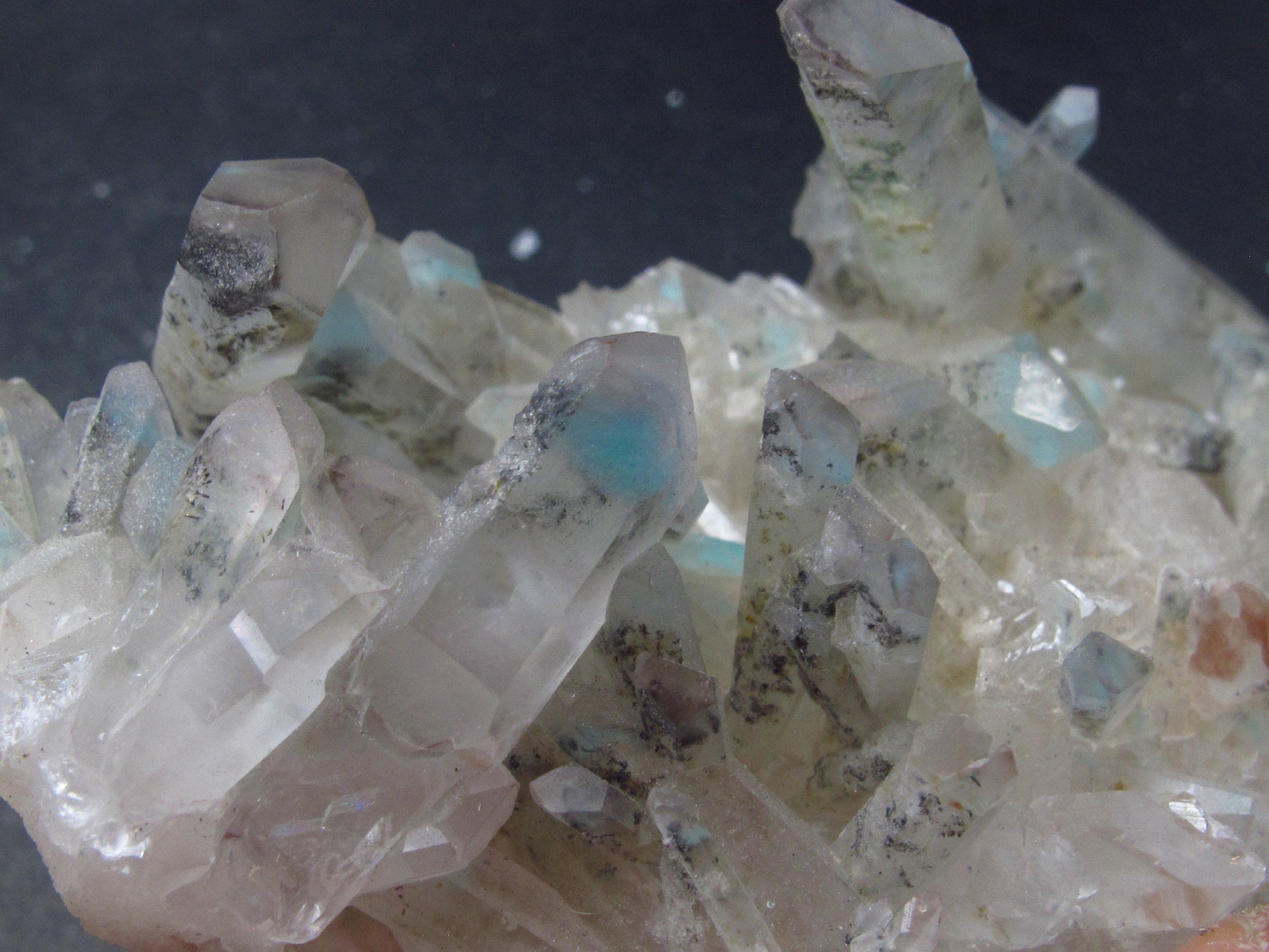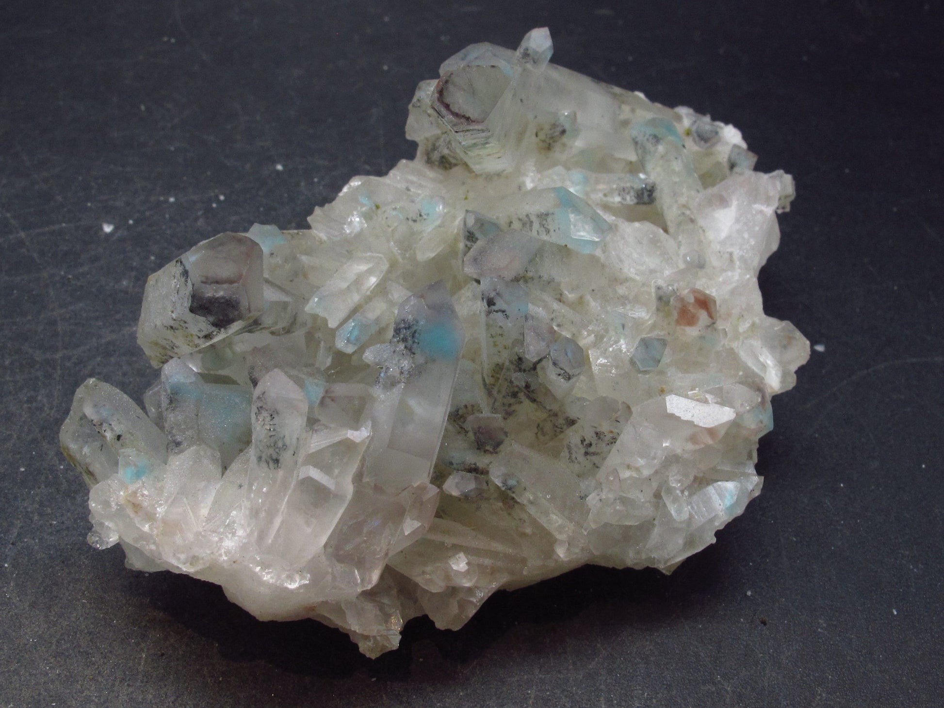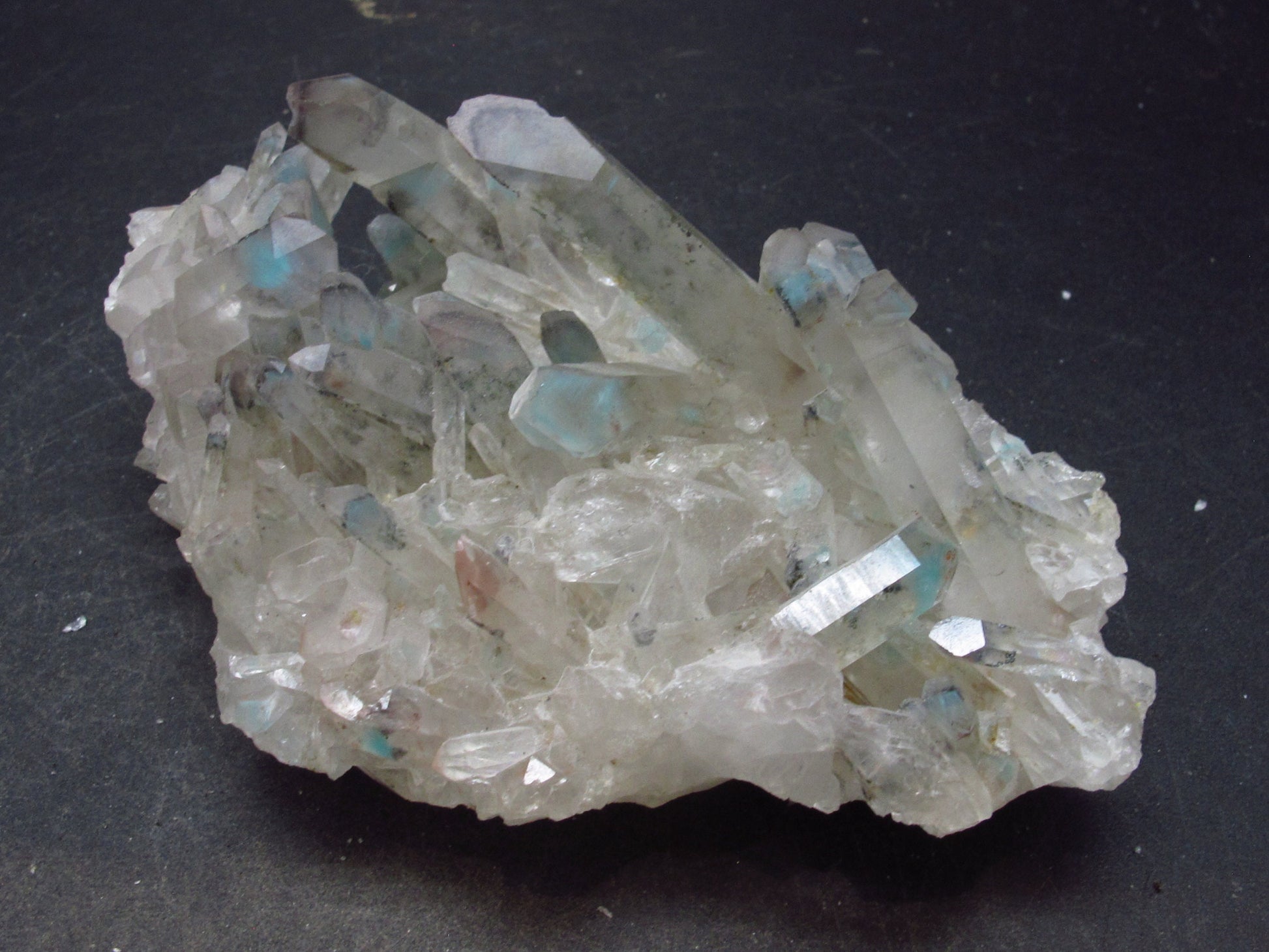 This is a very nice cluster with lots of turquoise blue Ajoite in Quartz from South Africa. Ajoite shows well through the natural, unpolished faces of the crystal.