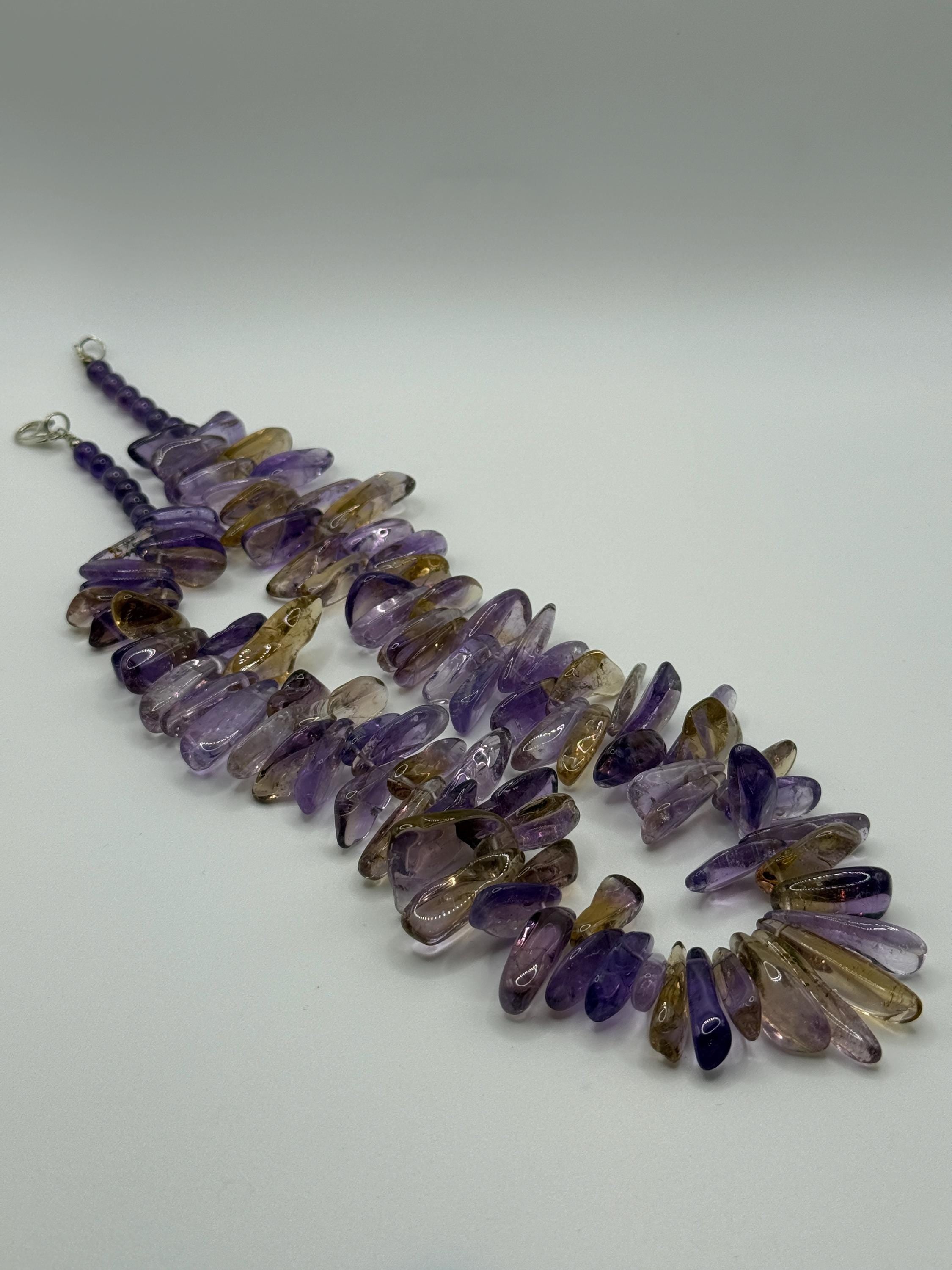 You're bidding on a stunning raw ametrine crystal necklace, made with chunky natural beads showcasing the unique mix of purple amethyst and golden citrine. Each stone is raw-cut and irregular, giving the piece a bold, earthy texture.
