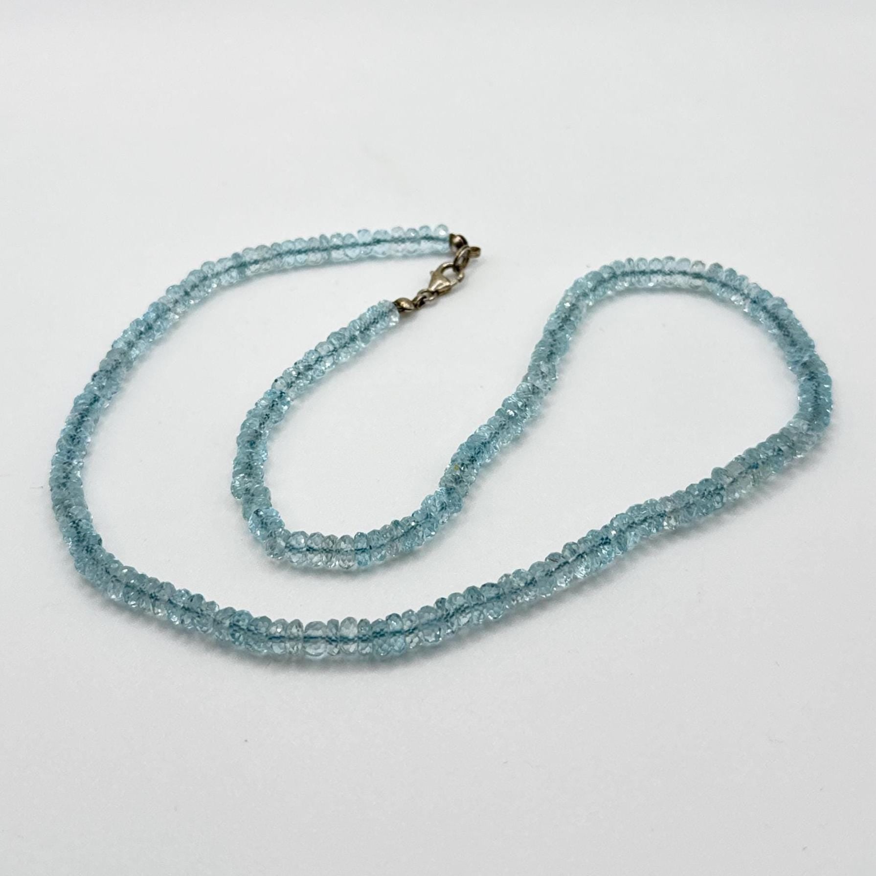 Delicate and refined, this necklace is crafted from natural sky blue topaz rondelle beads, each faceted to shimmer with gentle brilliance. The soft, airy blue evokes a sense of calm and grace - perfect for everyday wear or special occasions.