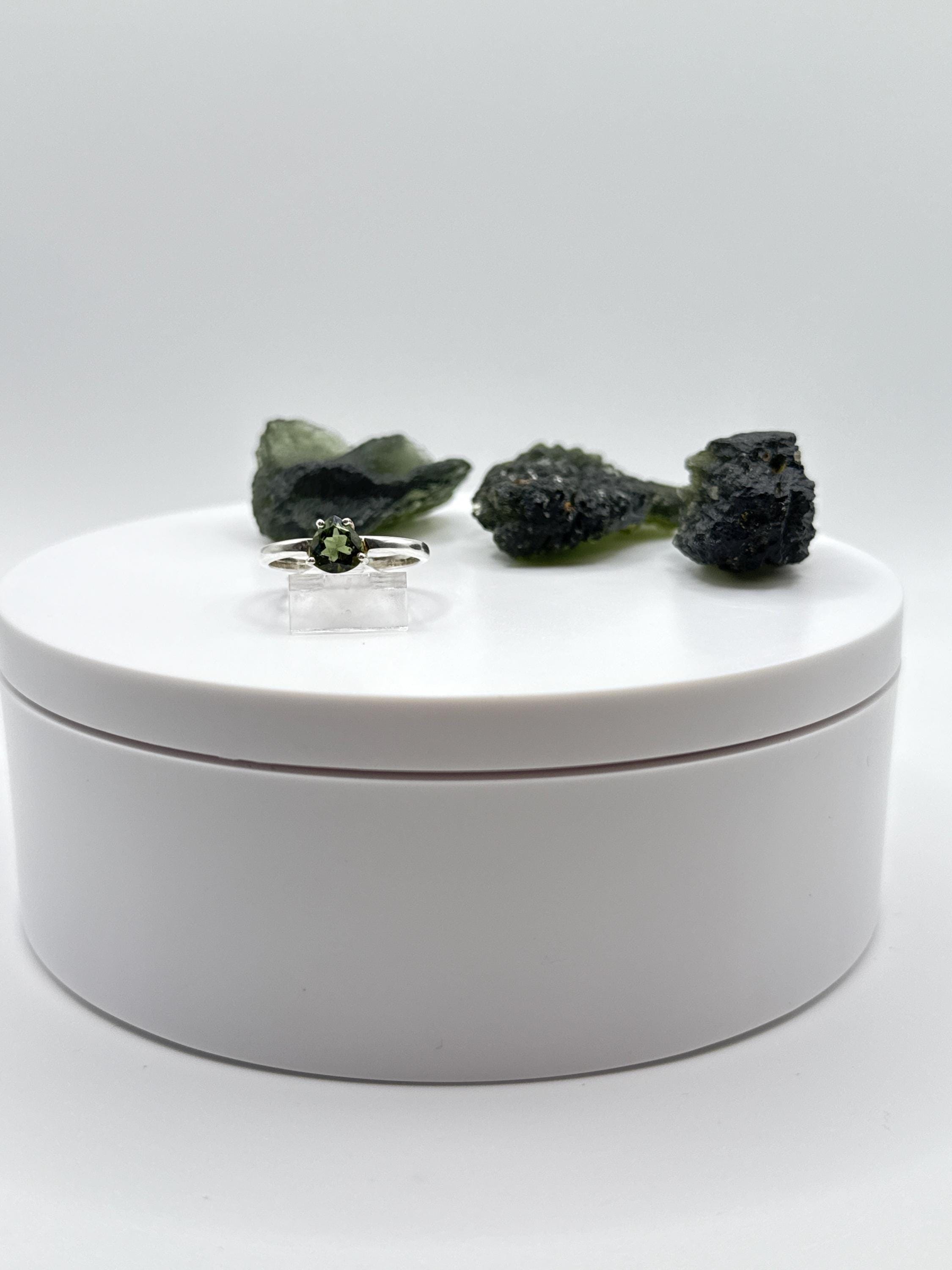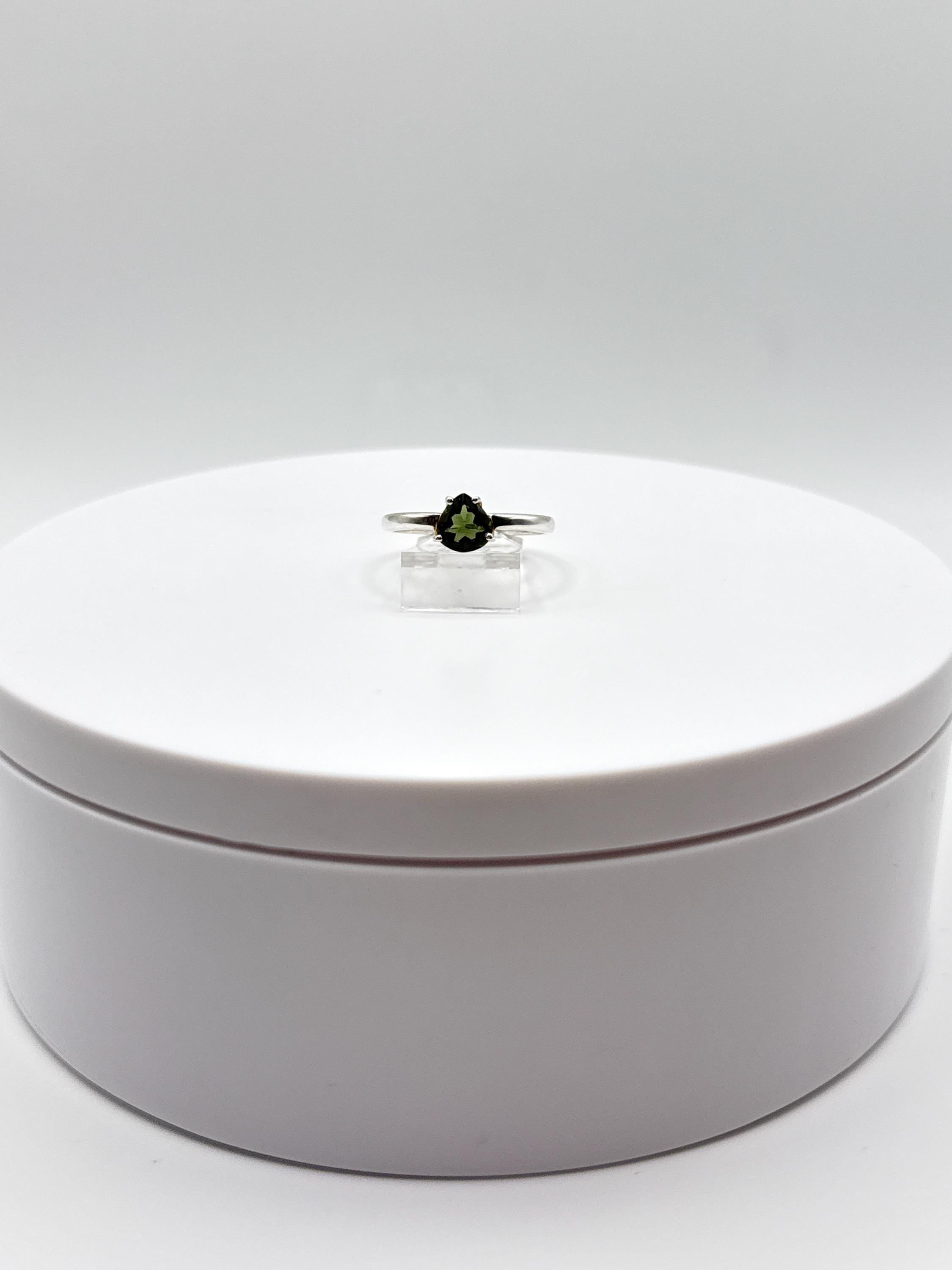 This elegant Moldavite ring features a trillion-cut Moldavite gemstone, set in a timeless sterling silver band. The bold, triangular shape of the stone showcases the vibrant green of Moldavite, creating a striking and sophisticated look. This ring becomes a captivating statement piece, perfect for those who appreciate unique and powerful gemstones.