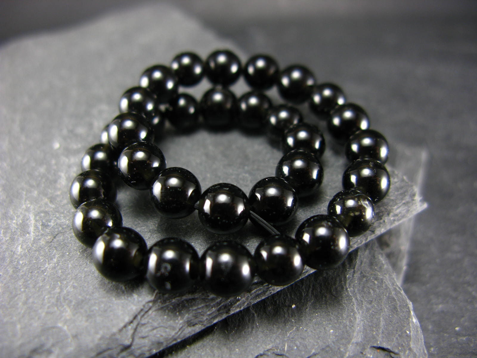 The beads are round and strung on a top quality elastic. They measures 6mm in diameter. We make all the bracelets ourselves, here in Canada.