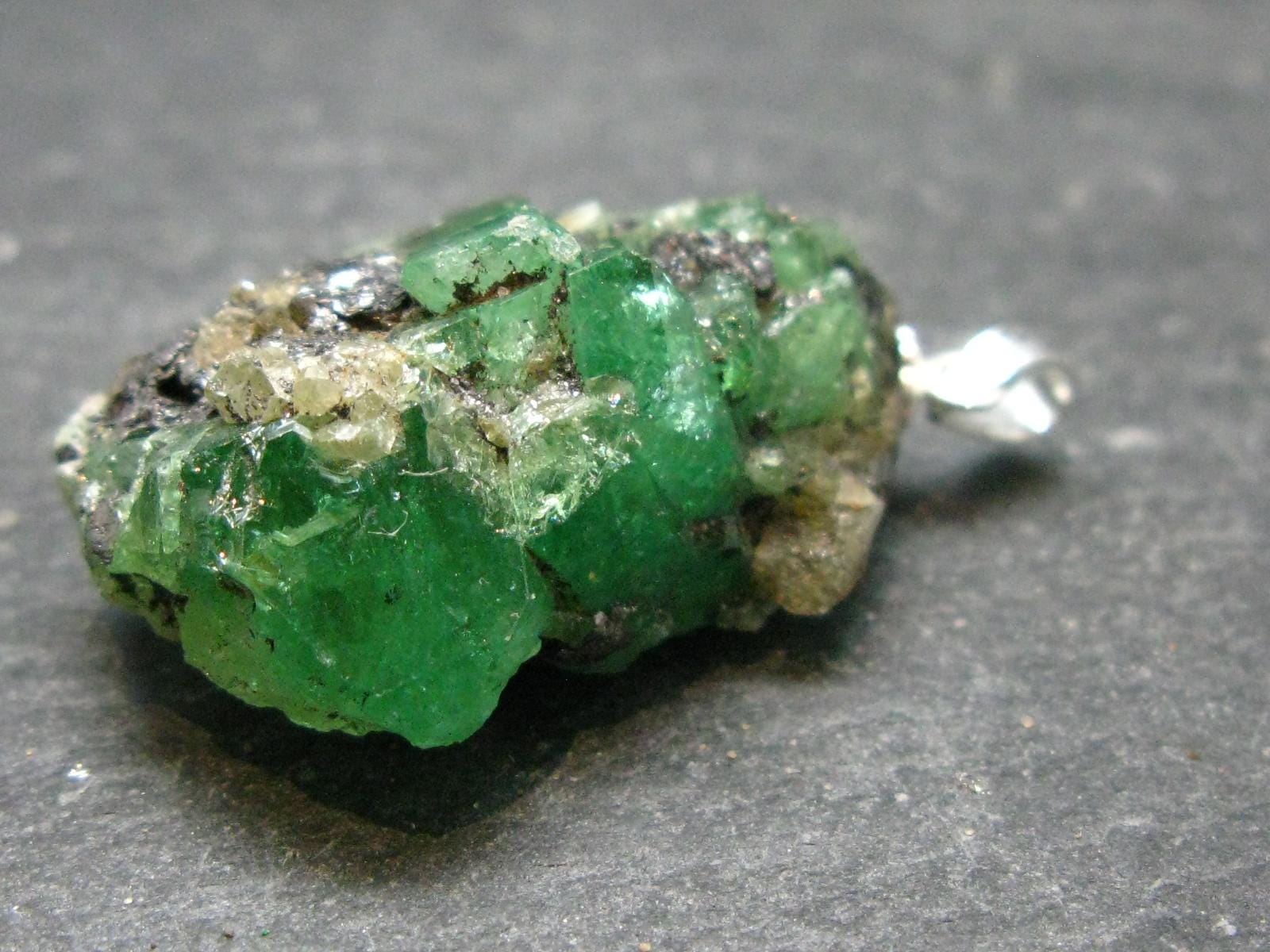 Description: Nice Tsavorite silver pendant with great rich green color. Crystal is 1.7 centimeters.